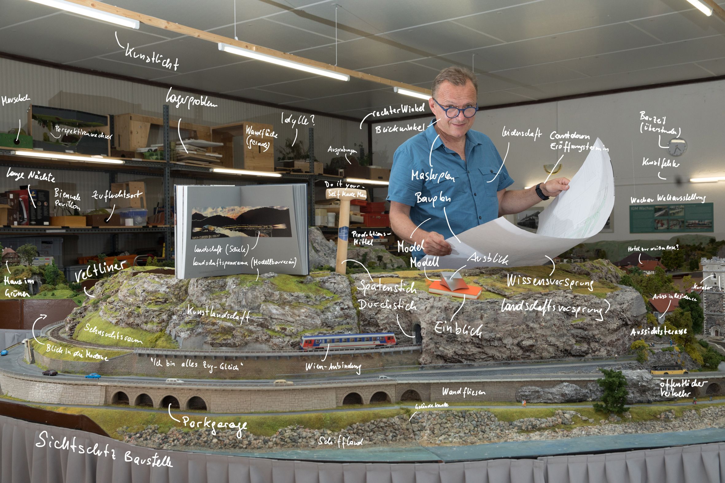 eSeL begleitete die Bauphase bis zur Eröffnung mit Fotos, Plakaten und Postkarten einer ungewöhnlichen "Behind the Scenes"-Portraitserie. MitarbeiterInnen der Landesgalerie Niederösterreich inszenierten sich an ausgewählten Orten in Krems, um die Spezifika ihrer Arbeit für die Kunst durch Besonderheiten der ausgewählten Plätze zu verdeutlichen. Fünf in jedem Bild verborgene Privatgegenstände der Portraitierten verweisen zusätzlich als "Attribute" auf die jeweilige Arbeitspraxis. Seit Anfang 2019 zeigten die Fotos als Plakate und Postkarten im öffentlichen Raum in Wien und Krems ein heterogenes Portrait der neuen Kunstinstitutionen - und zugleich ein vielfältiges Panorama der Heimatstadt des Museums. Die Postkarten wurden durch Zeichnungen von eSeL kommentiert, handschriftliche Anmerkungen auf den Plakatmotiven ermöglichen weitere Ausflüge in die Denkwelten von Kunst und Künstler.