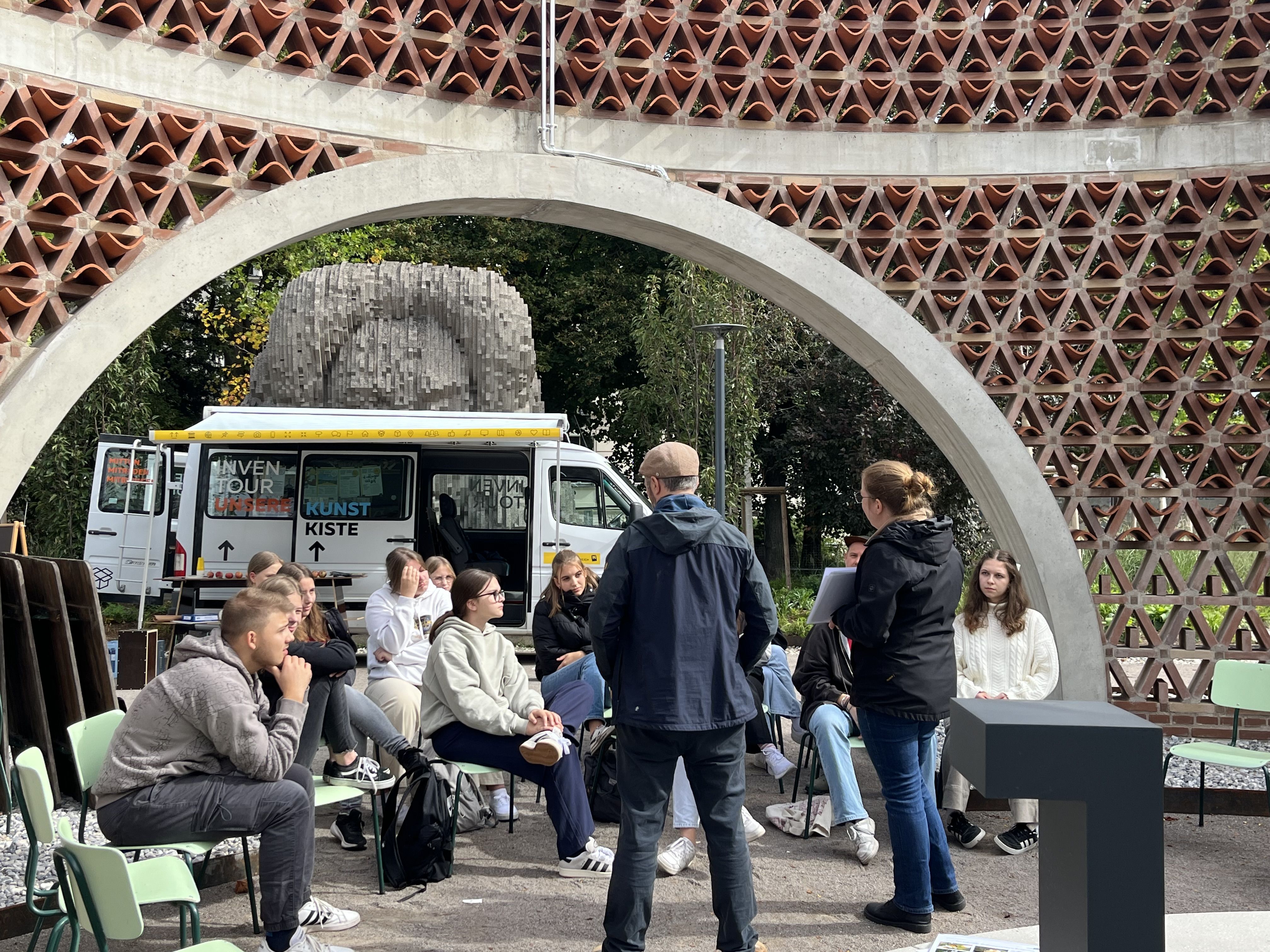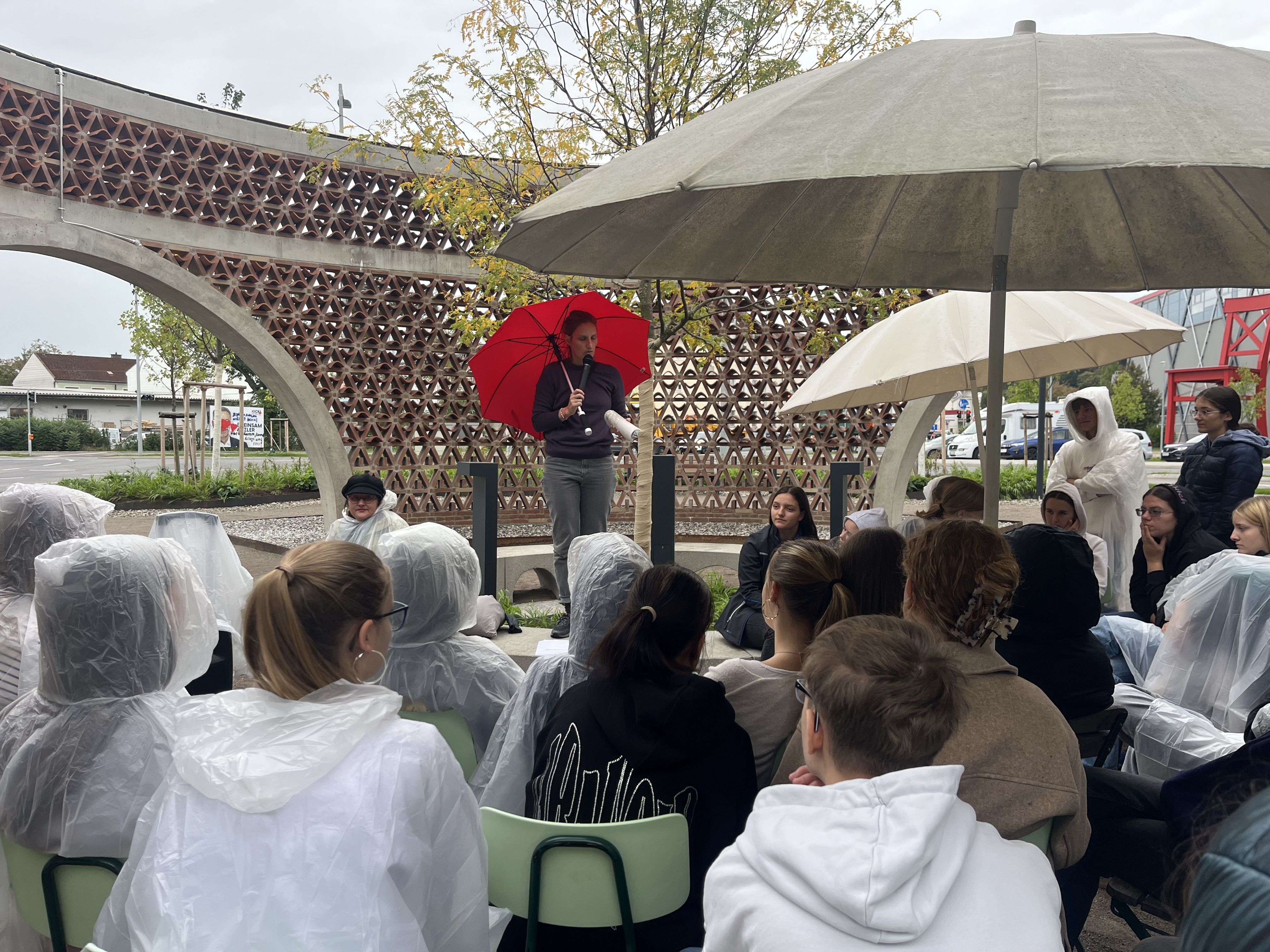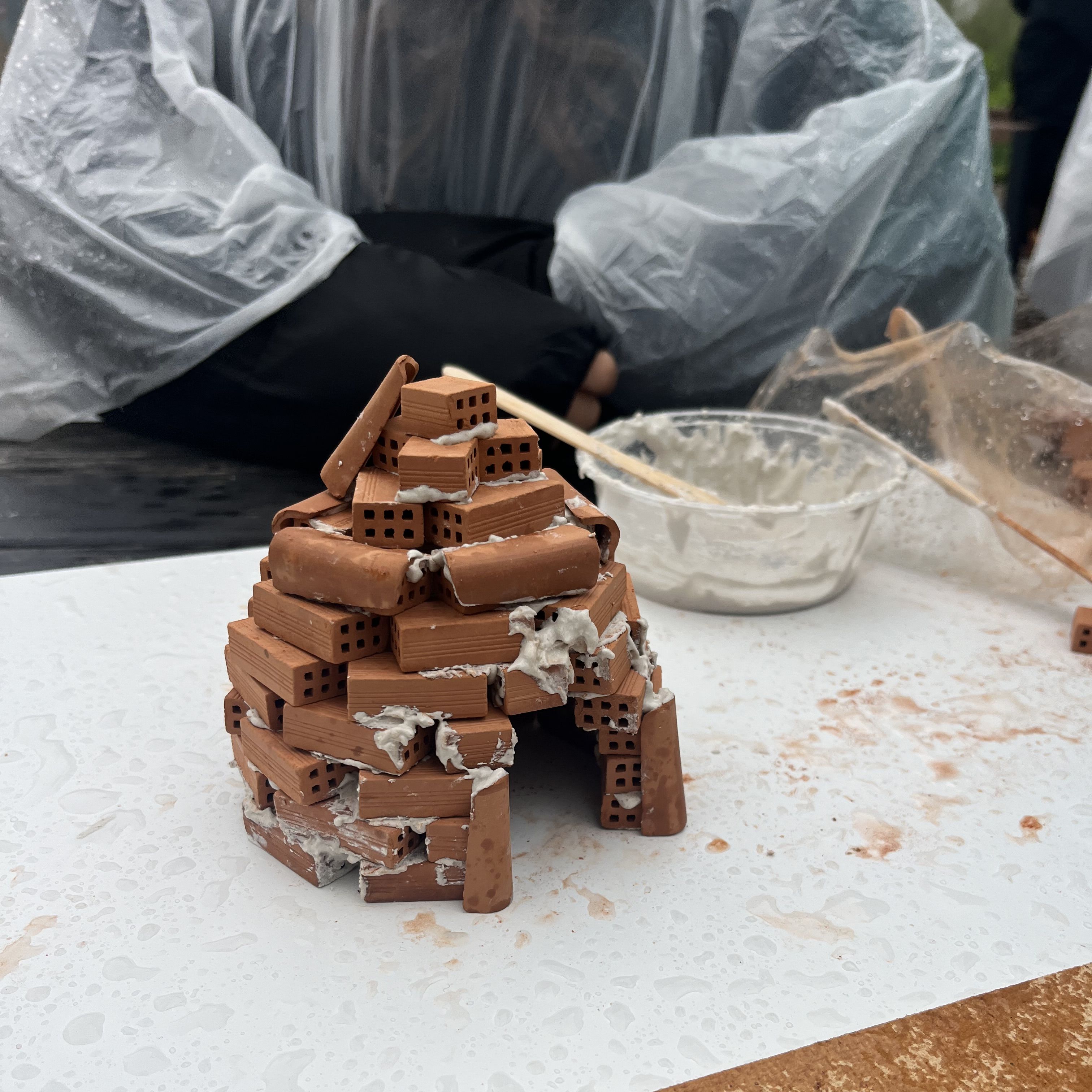 Aus der Lehmgrube am hinteren Rand des Areals kommt das Material. Dabei ging es um Sedimente, was alles aus Lehm gemacht wird, sowie die Nachhaltigkeit des Materials, das, einmal dem Regen ausgesetzt, einfach wieder in sich zusammenfällt, sofern es nicht gebrannt wurde, und daher für die Umwelt keine Belastung darstellt. Die rote Farbe der gebrannten Ziegel entsteht durch Oxidationsprozesse beim Brennen.