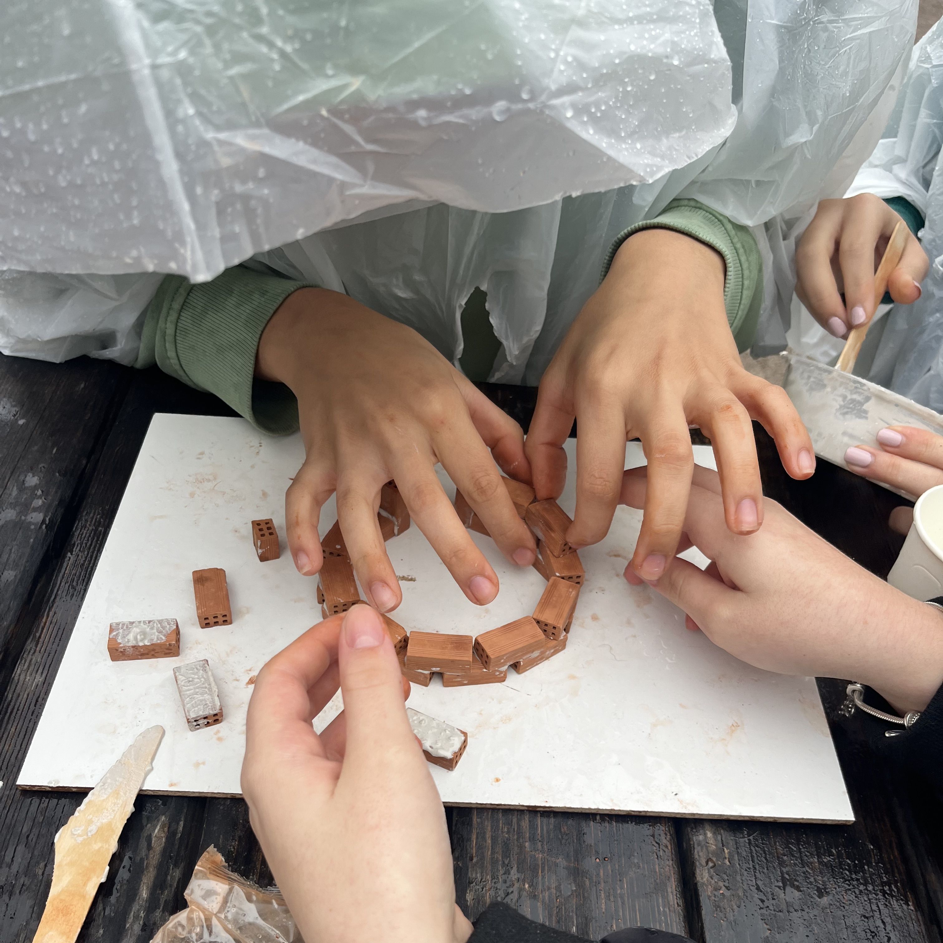Zum Abschluss des Workshops gab es Gelegenheit, selbst mit dem Ton und Lehm aus der örtlichen Grube eigene Ziegel und Kacheln zu fertigen oder auch ganz andere Formen auszuprobieren. Dabei entstanden gestempelte Plaketten, Schüsseln, mehrere gebrochene Herzen und ein Miniaturauto mit Rennfahrer. Die Ergebnisse wurden im ungebrannten Zustand mitgenommen und später in der Schule ausgestellt.