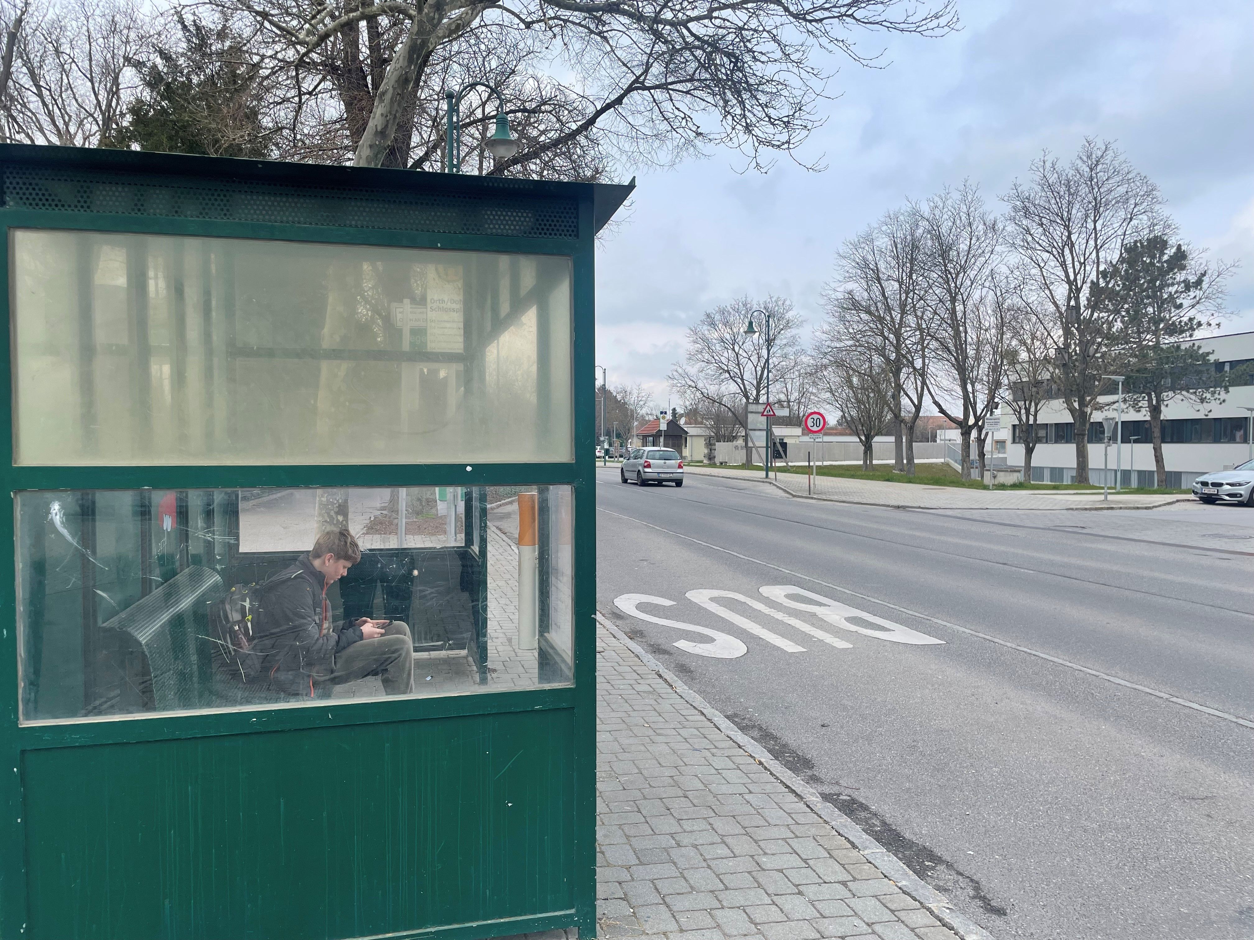 Umgedrehte Bootsrümpfe, die historischen Holztransportschiffen nachempfunden wurden, bilden den Unterstand der beiden neuen Buswartehäuschen bei der Neuen Mittelschule und dem Schloss Orth.