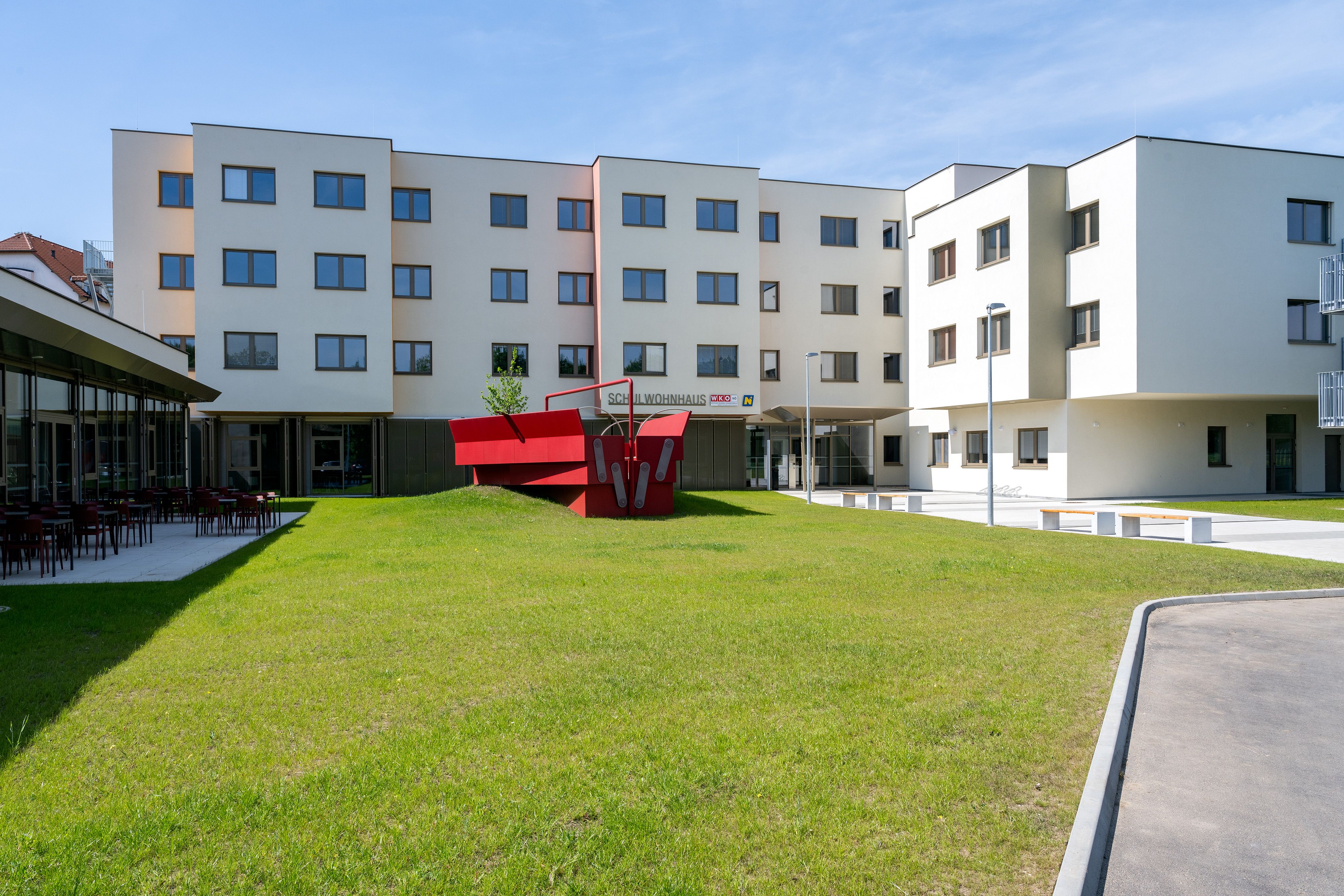 Anna Vasof realisiert mit Treffpunkt Werkzeugkasten beim neuen Schülerheim der Landesberufsschule für Landwirtschaftliche Berufe eine Sitzskulptur in Form eines überdimensionalen, geöffneten und begehbaren Werkzeugkastens. Der Werkzeugkasten nimmt in mehrfacher Hinsicht Bezug auf die Schule und die dort gelehrten Berufe. Gemeinsam mit den Jugendlichen will die INVENTOUR darüber nachdenken, welche Anforderungen das Leben an sie stellt. Welche Werkzeuge und Fähigkeiten sind für die jungen Menschen heute relevant, um für ihre persönliche und berufliche Zukunft gerüstet zu sein?