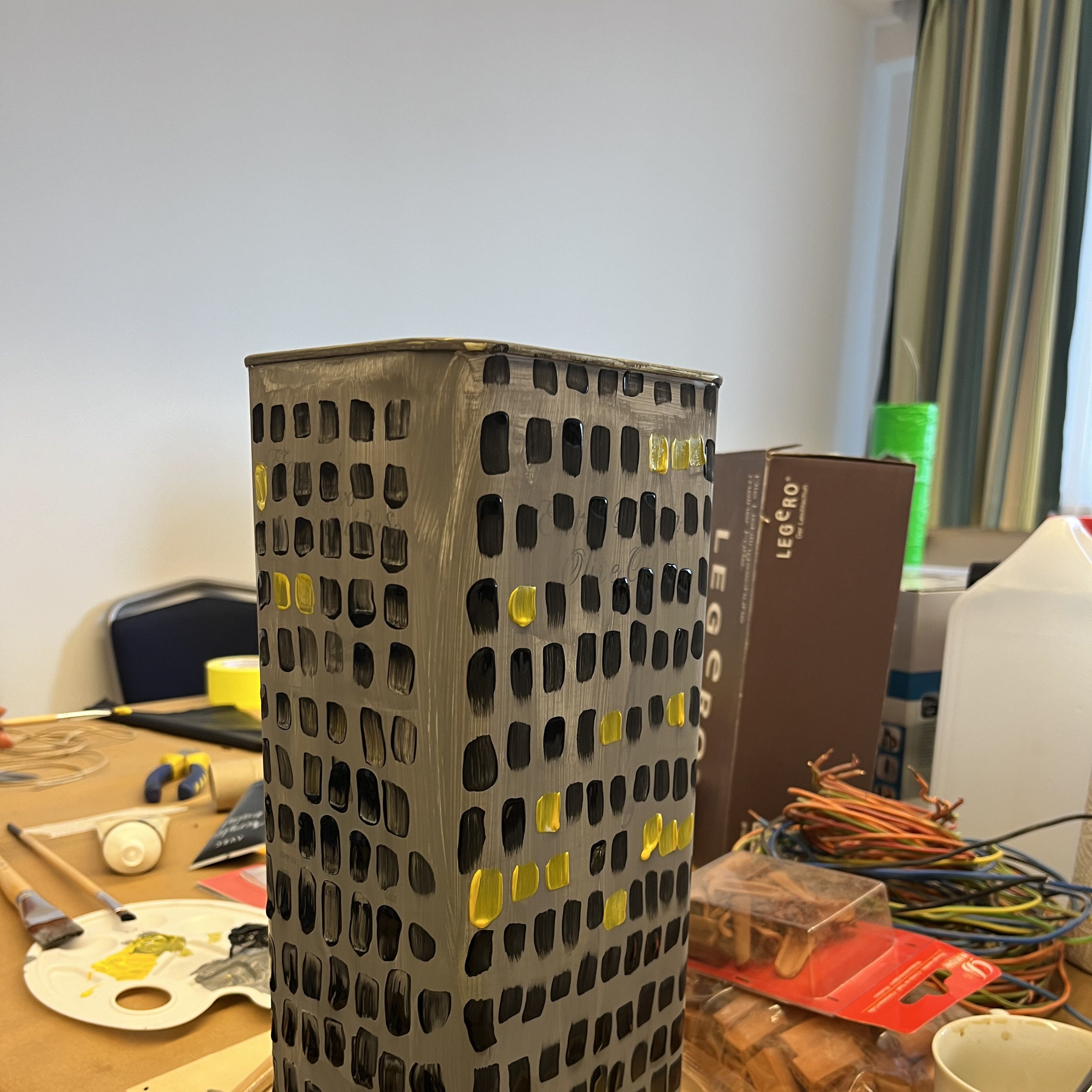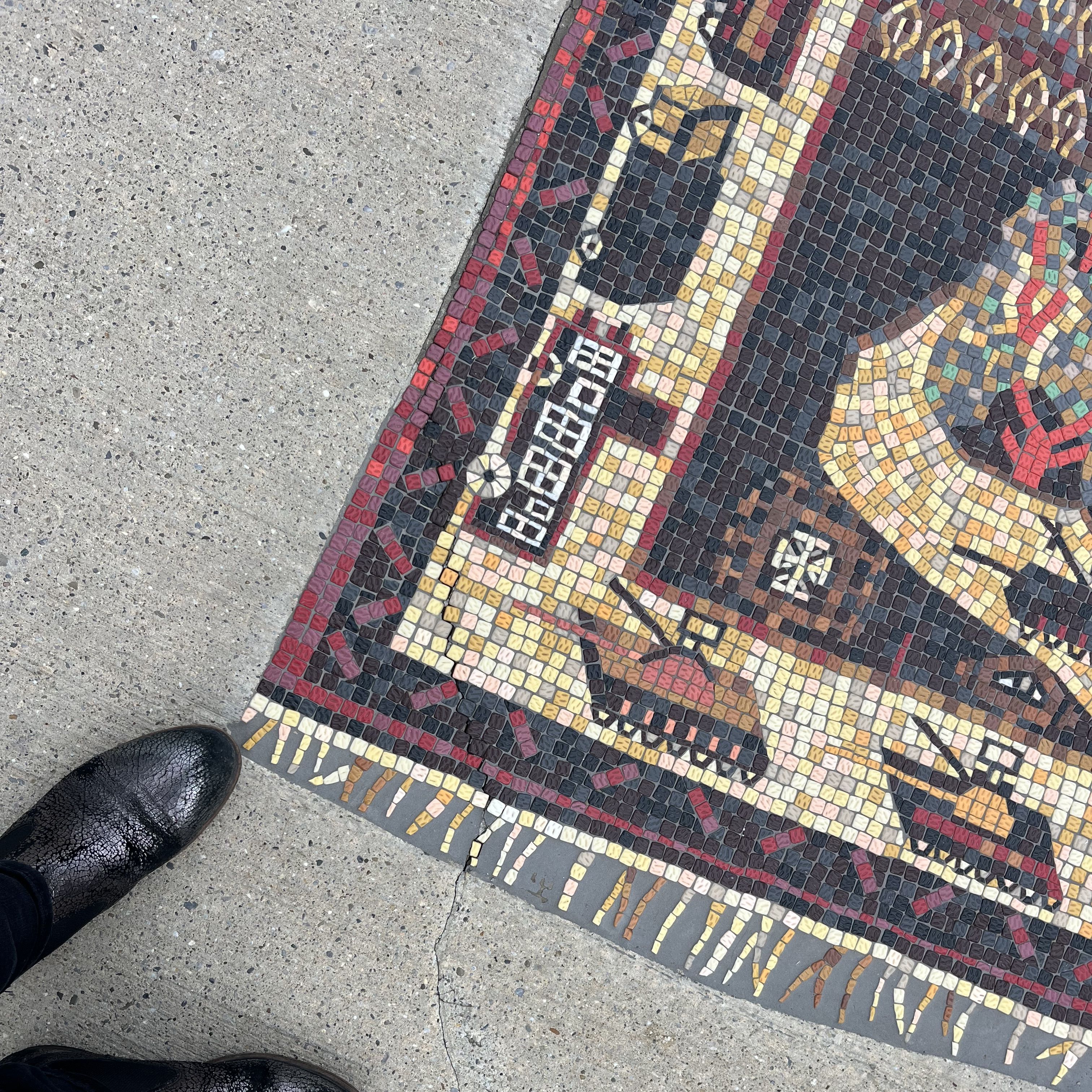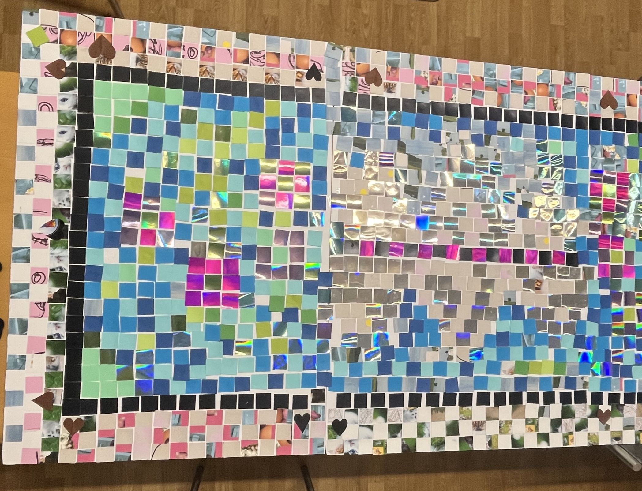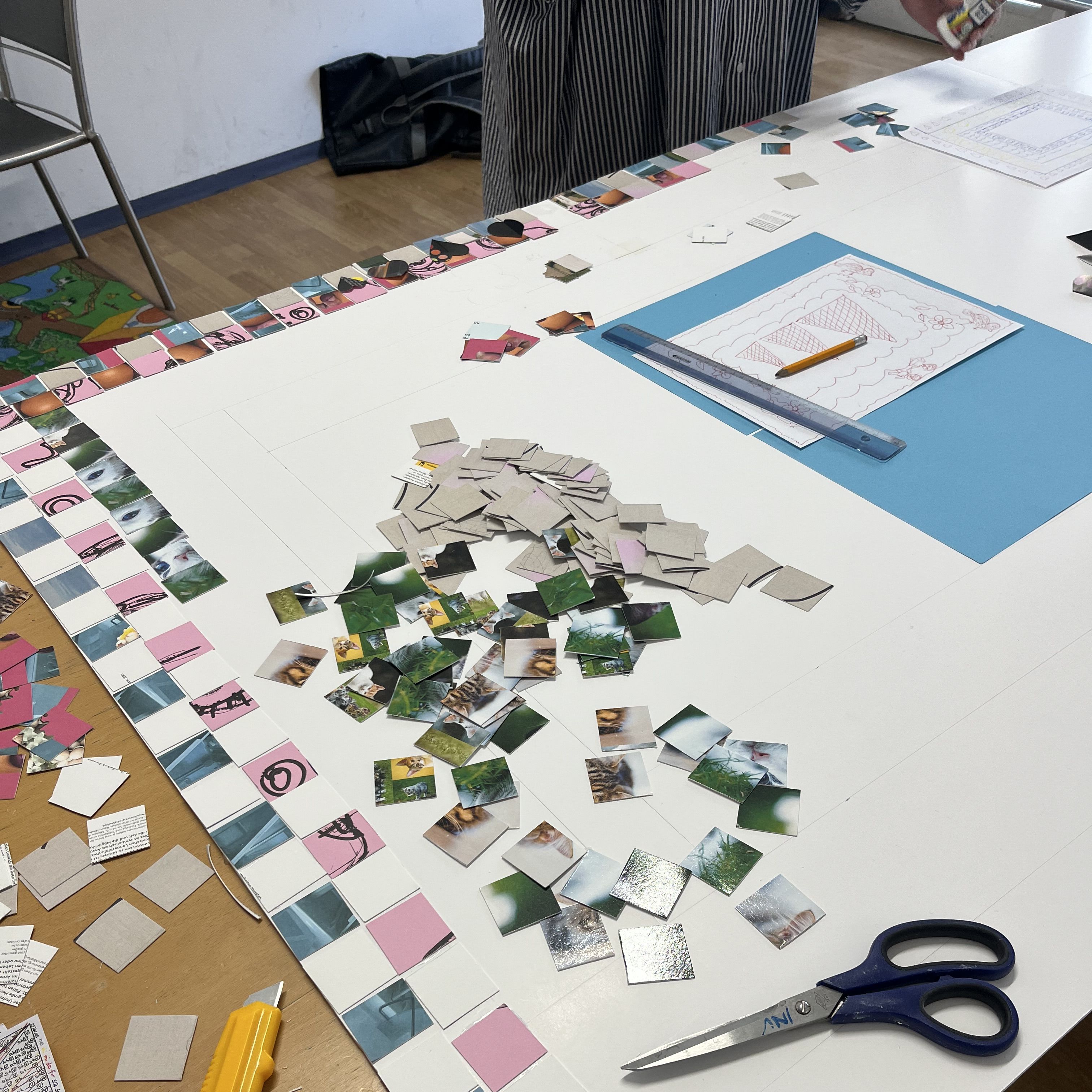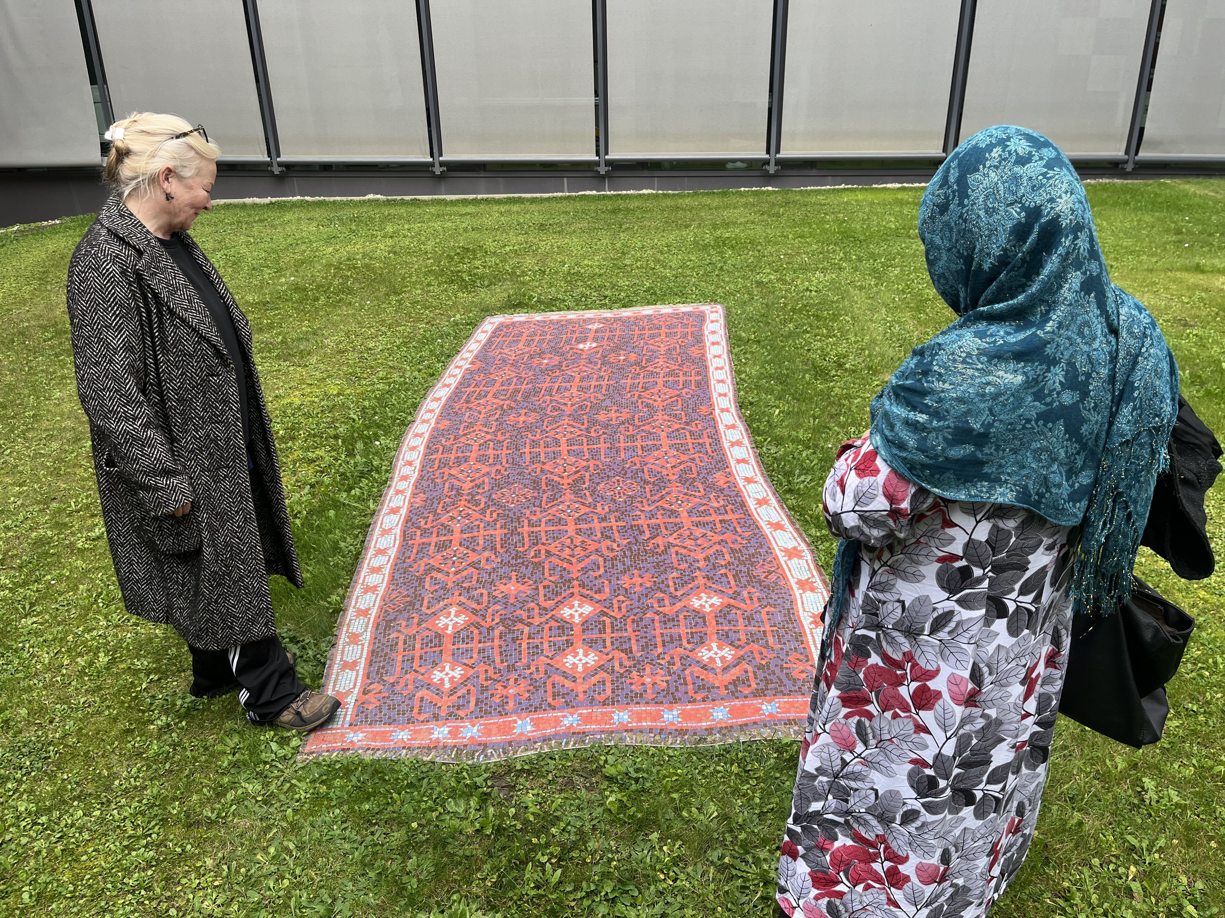 Mit Iris Andraschek besuchten die Teilnehmerinnen des Nähkurses vom Verein Impulse die Mosaikteppiche am Campus Krems und gestalteten anschließend ihren eigenen Wandteppich aus Kartonstückchen.