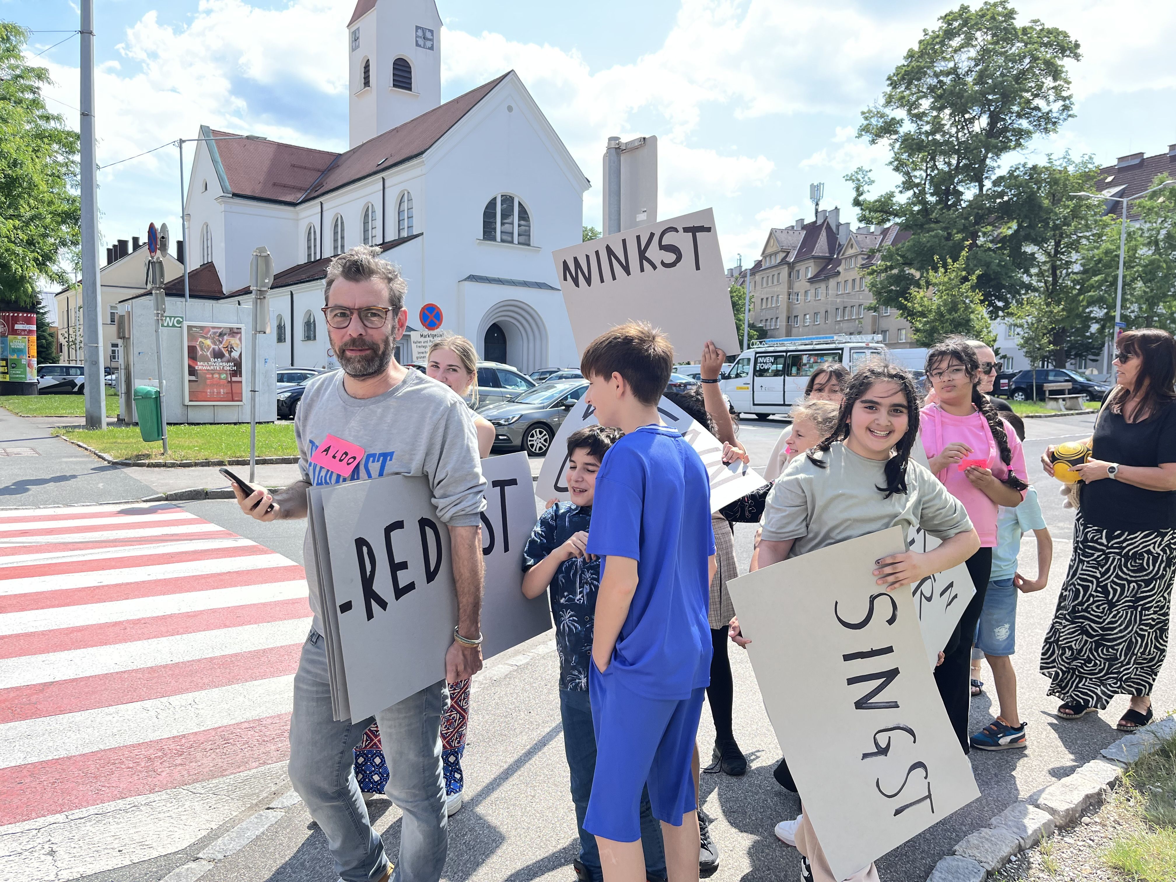 Die Kinder des Caritas Lerncafés in St. Pölten waren als erste dran und hatten das Vergnügen Aldo Giannotti zu treffen. Er erzählte ihnen u.a. von seinen witzigen Aktionen und Handlungsanweisungen in öffentlichen Räumen. Die Gruppe machte sich dann daran gemeinsam Aufforderungen auf Schildern zu formulieren, ging damit raus in die Stadt versuchte Menschen, die ihnen begegneten damit, damit zu verschiedenen Interaktionen anzuregen.