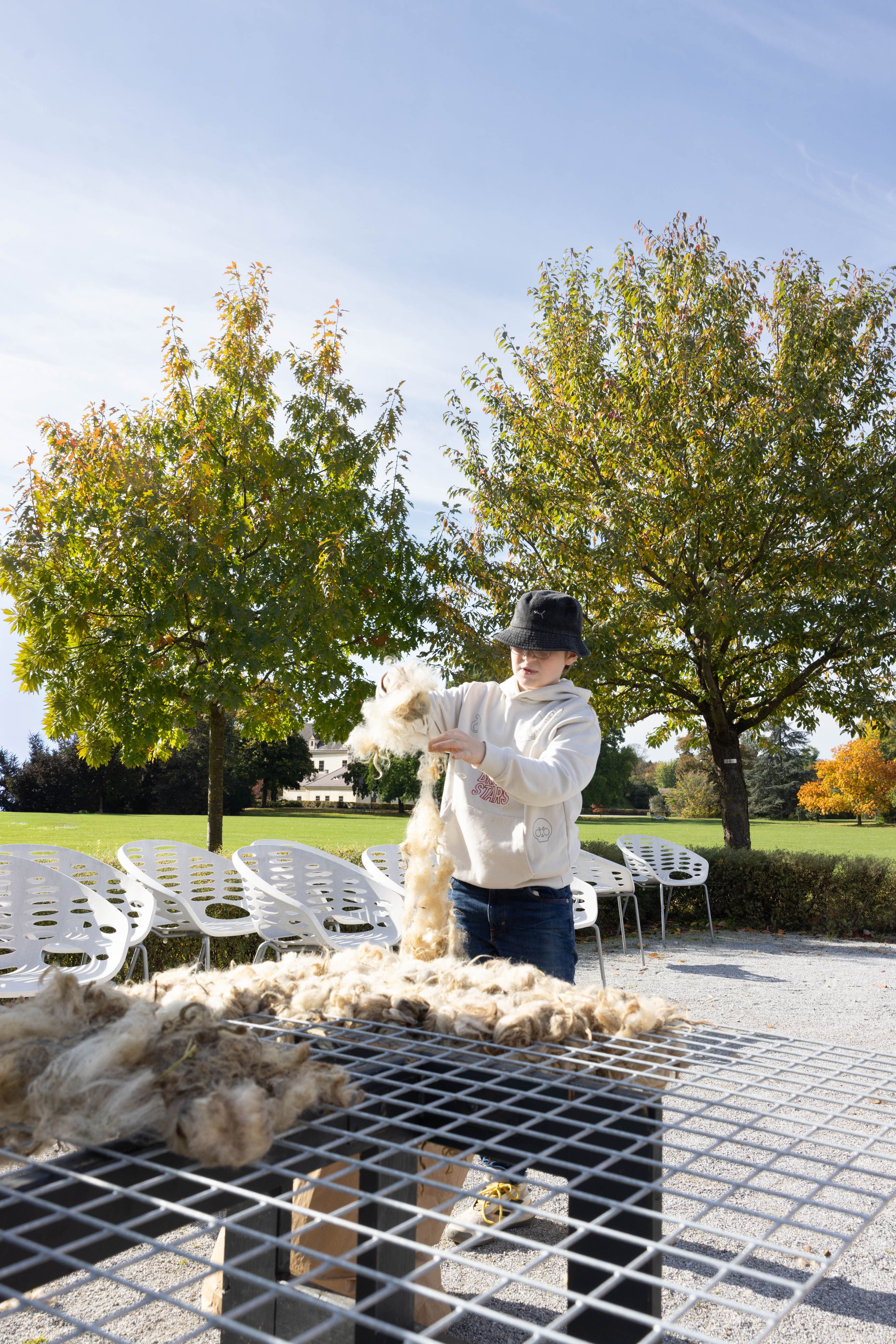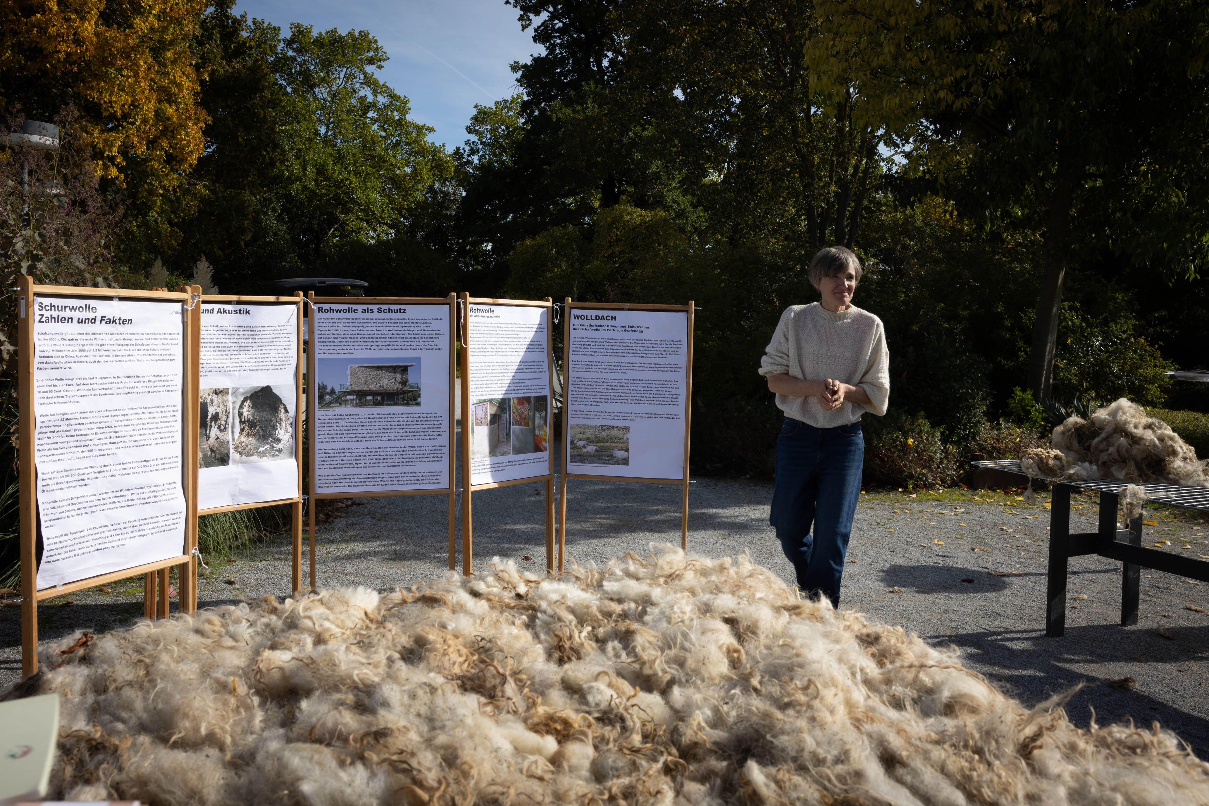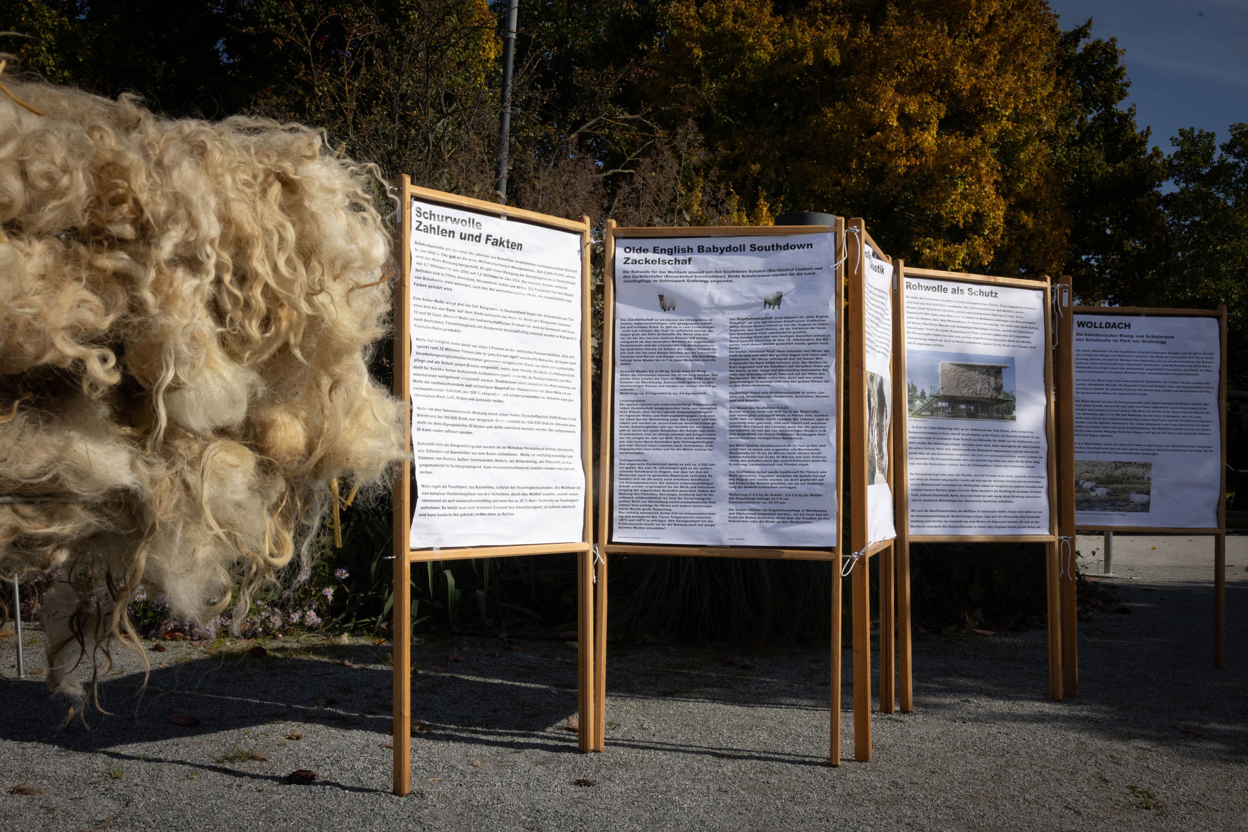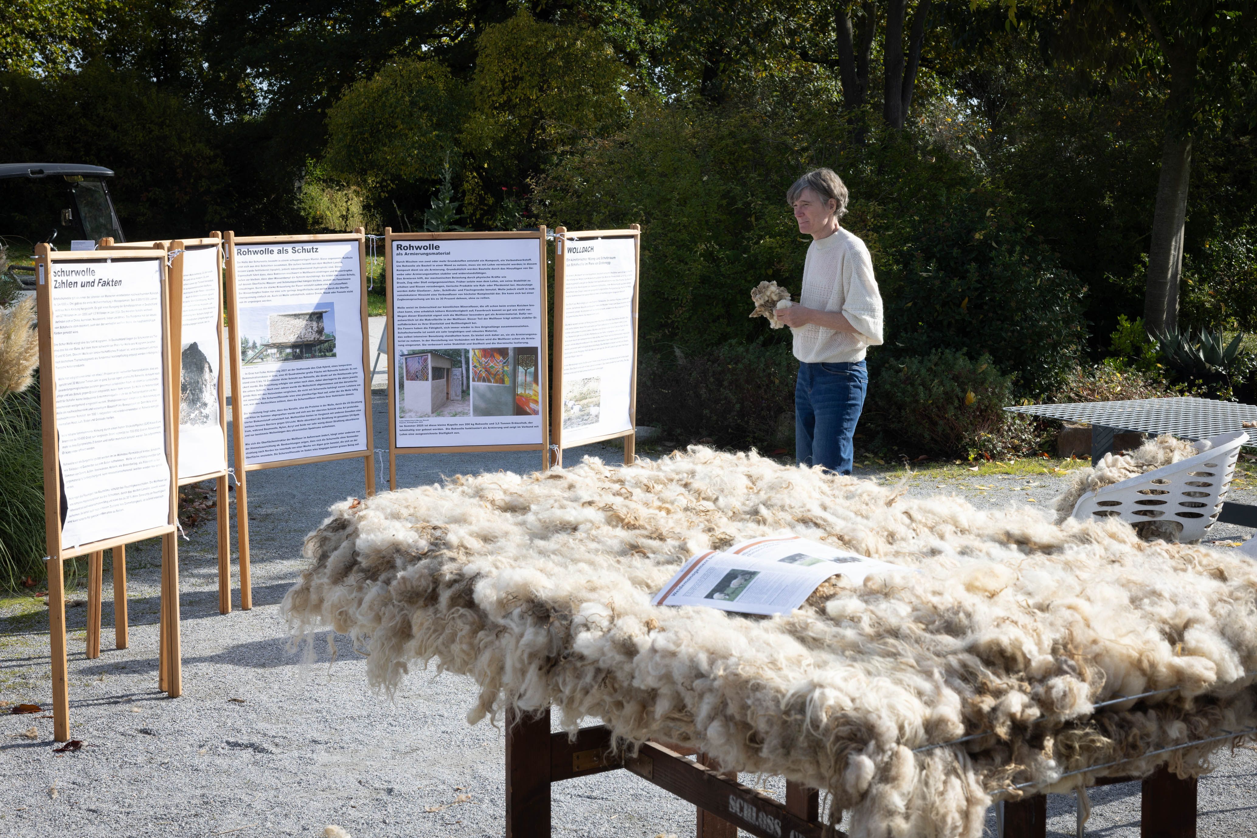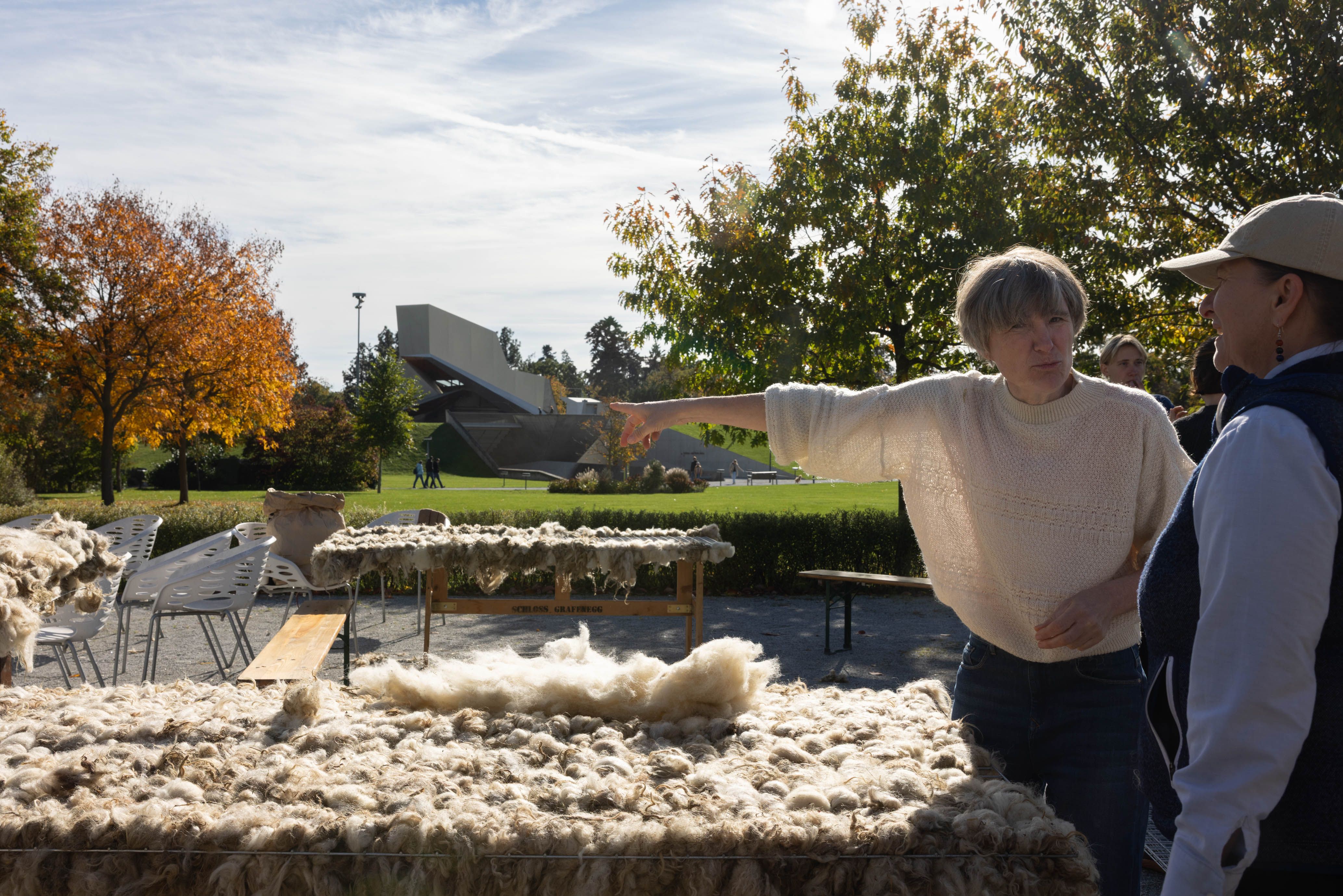 Von 17. bis 19. Oktober 2025 konnte man im Schlosspark Grafenegg bei der Entstehung einer künstlerischen Skulptur mithelfen: Folke Köbberlings WOLLDACH (Fertigstellung Frühjahr 2026), hat im Rahmen eines Workshops mithilfe vieler Interessierter bereits Form bzw. Wolle angenommen. Gemeinsam wurde bei schönstem Herbstwetter Rohwolle gewebt und die Künstlerin informierte über diesen faszinierenden und viel zu wenig geschätzten Rohstoff.