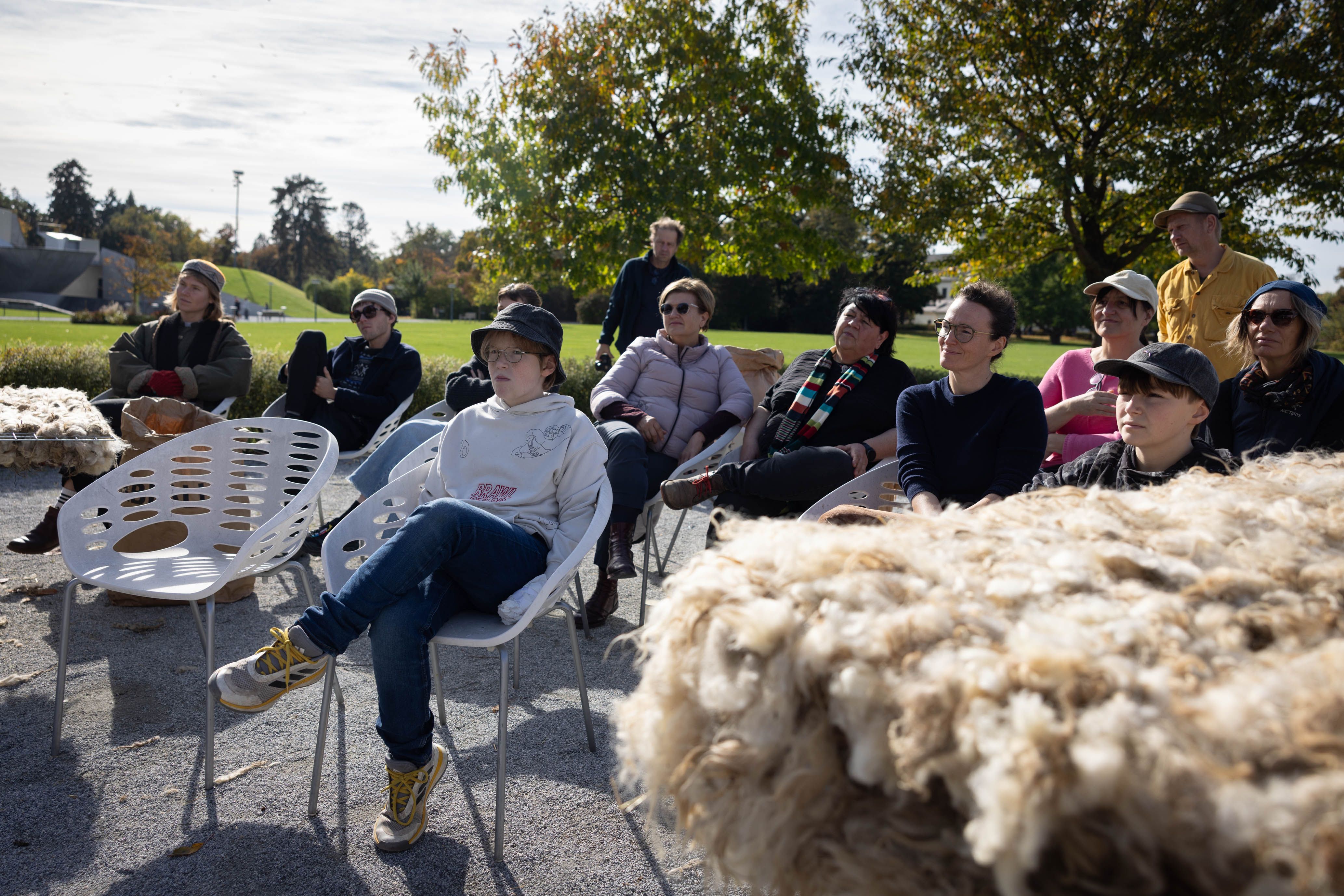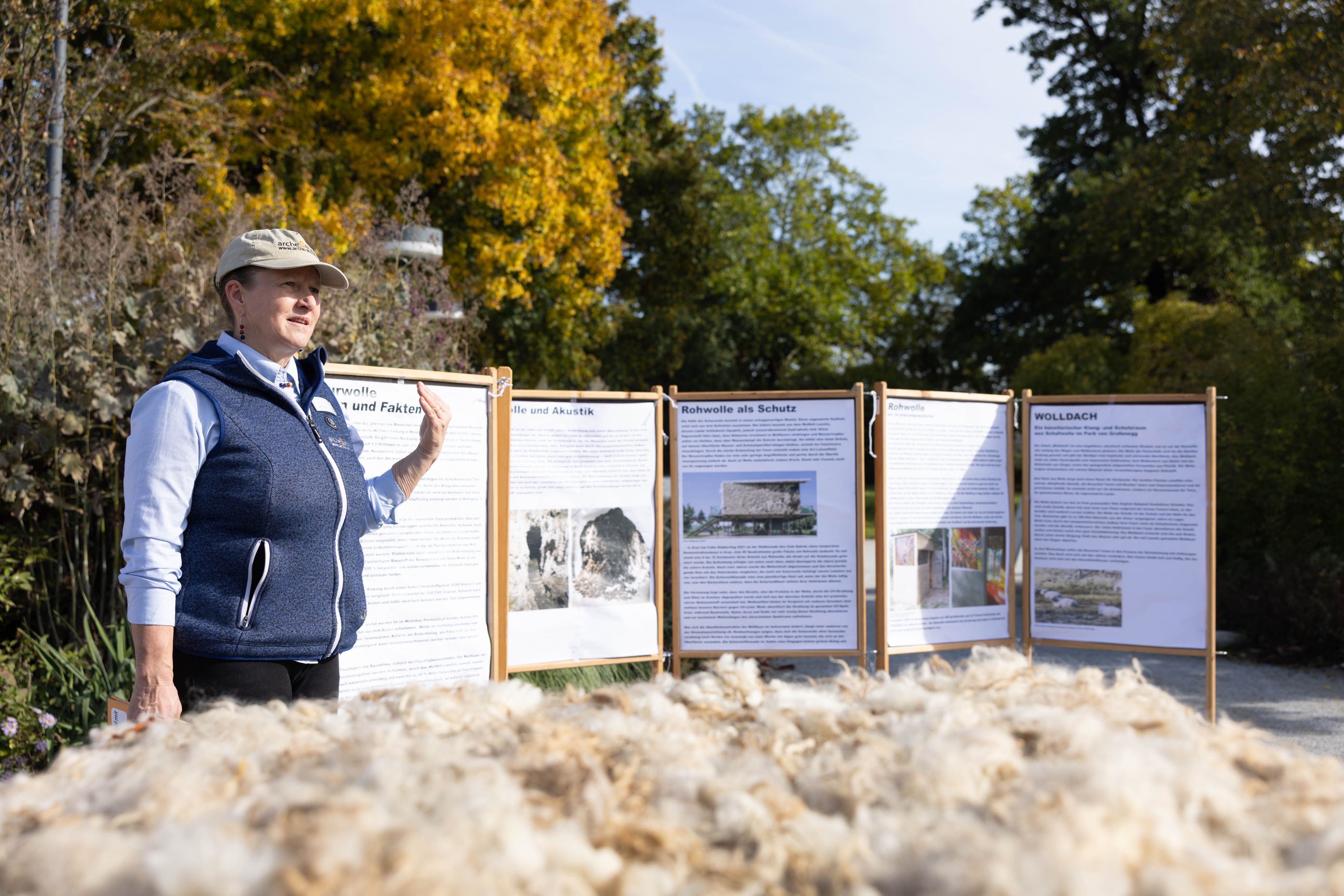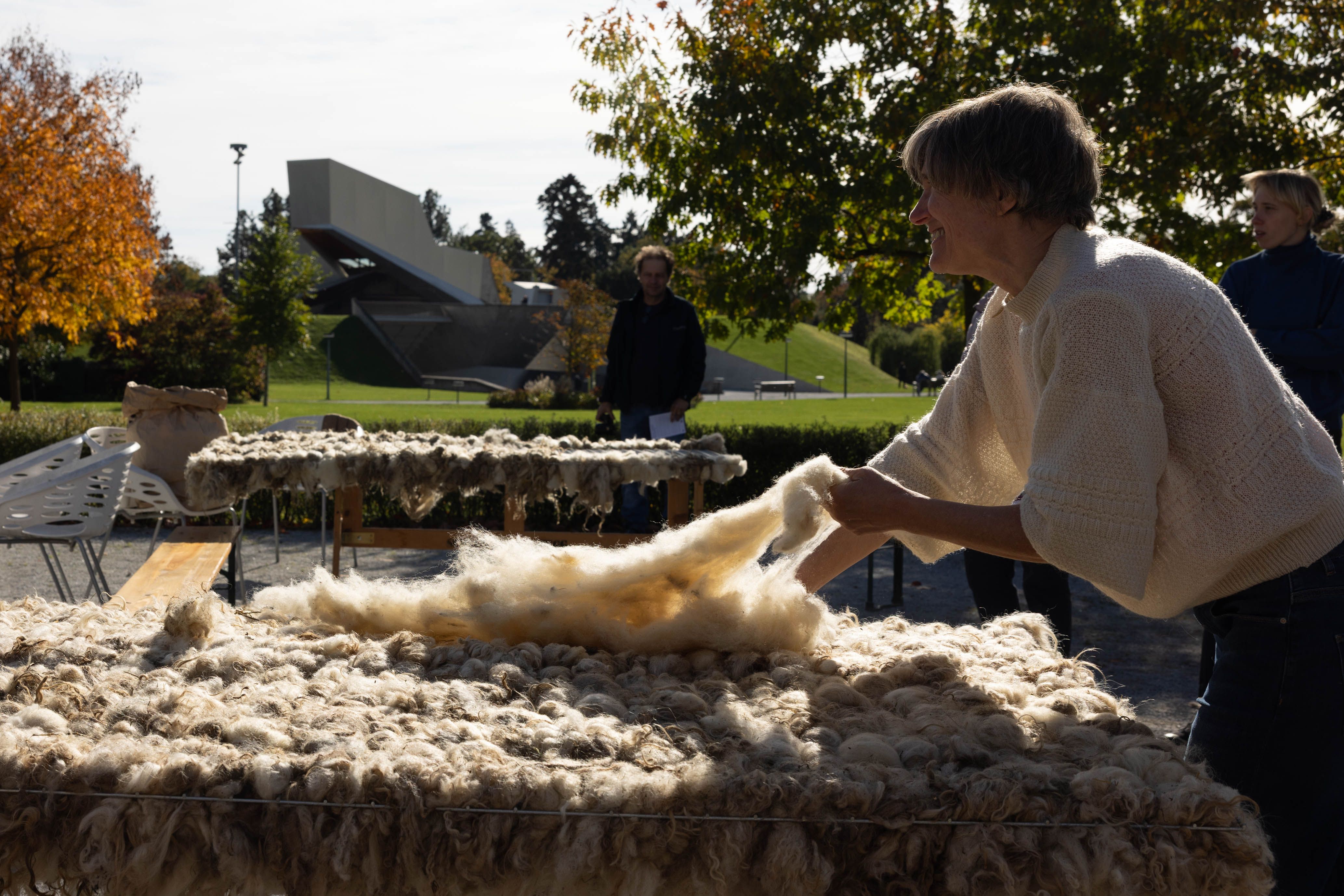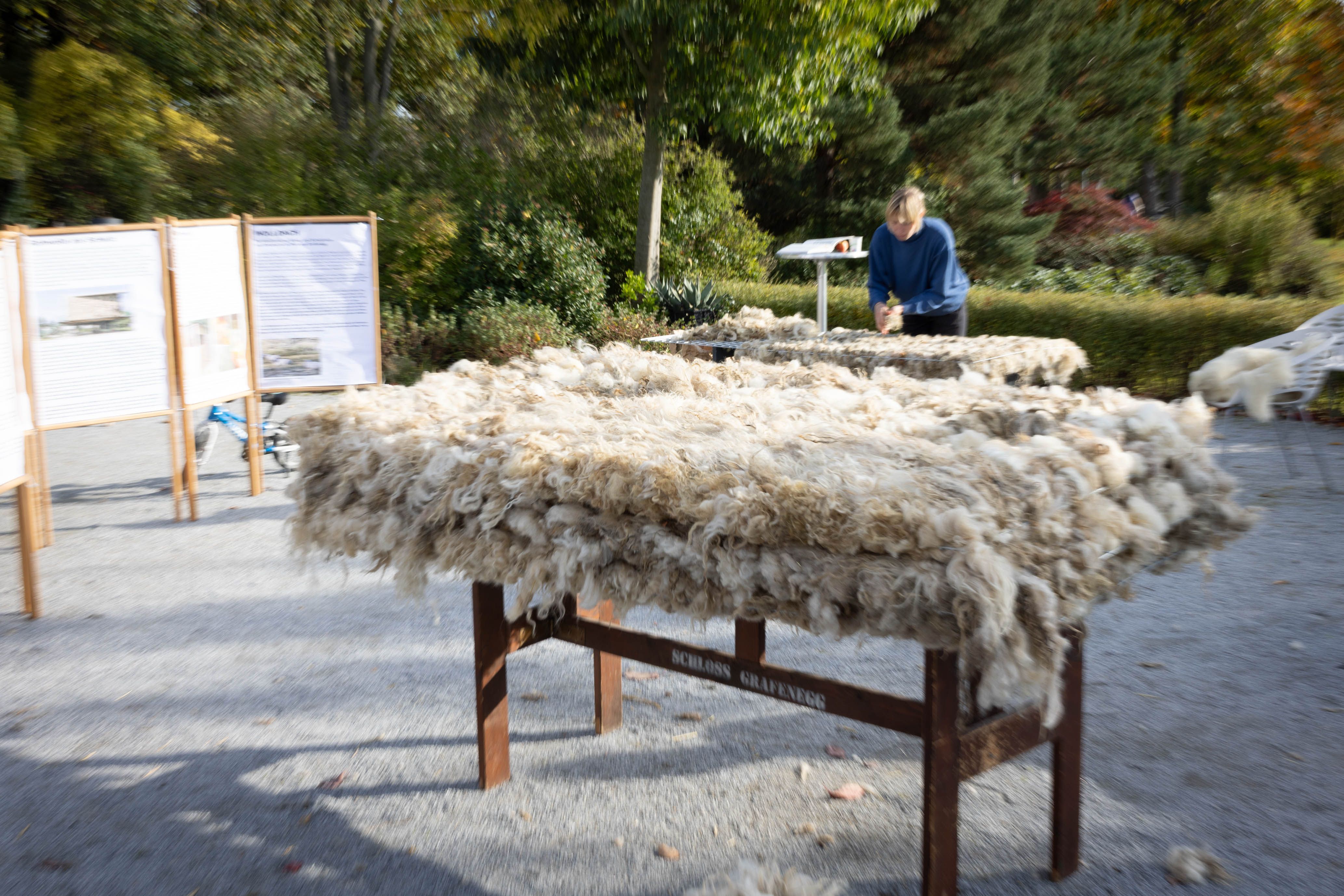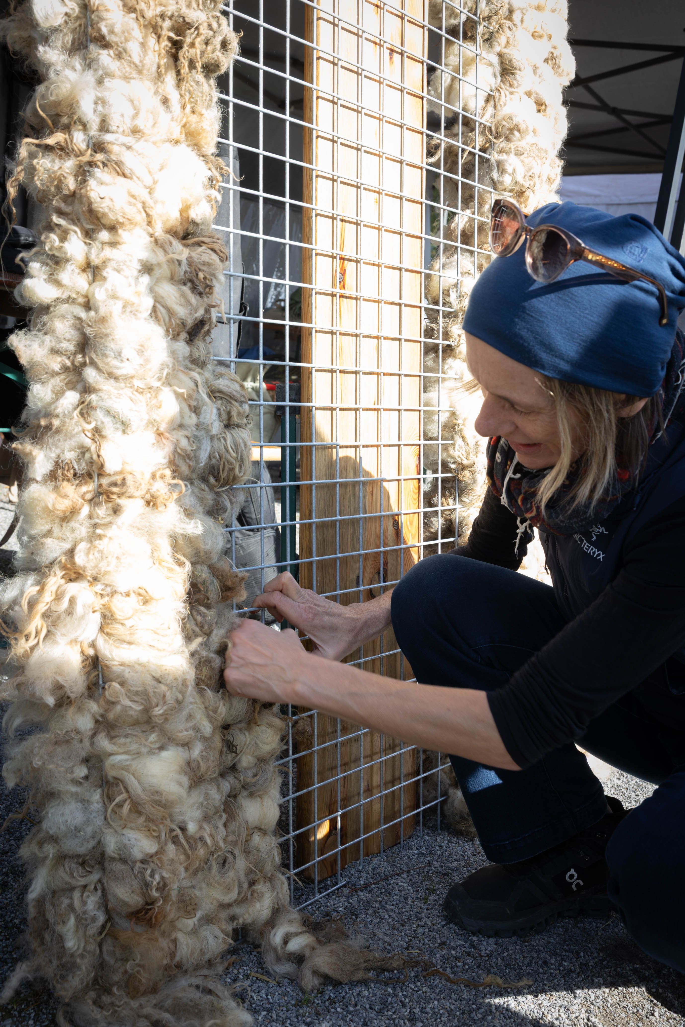 Von 17. bis 19. Oktober 2025 konnte man im Schlosspark Grafenegg bei der Entstehung einer künstlerischen Skulptur mithelfen: Folke Köbberlings WOLLDACH (Fertigstellung Frühjahr 2026), hat im Rahmen eines Workshops mithilfe vieler Interessierter bereits Form bzw. Wolle angenommen. Gemeinsam wurde bei schönstem Herbstwetter Rohwolle gewebt und die Künstlerin informierte über diesen faszinierenden und viel zu wenig geschätzten Rohstoff.