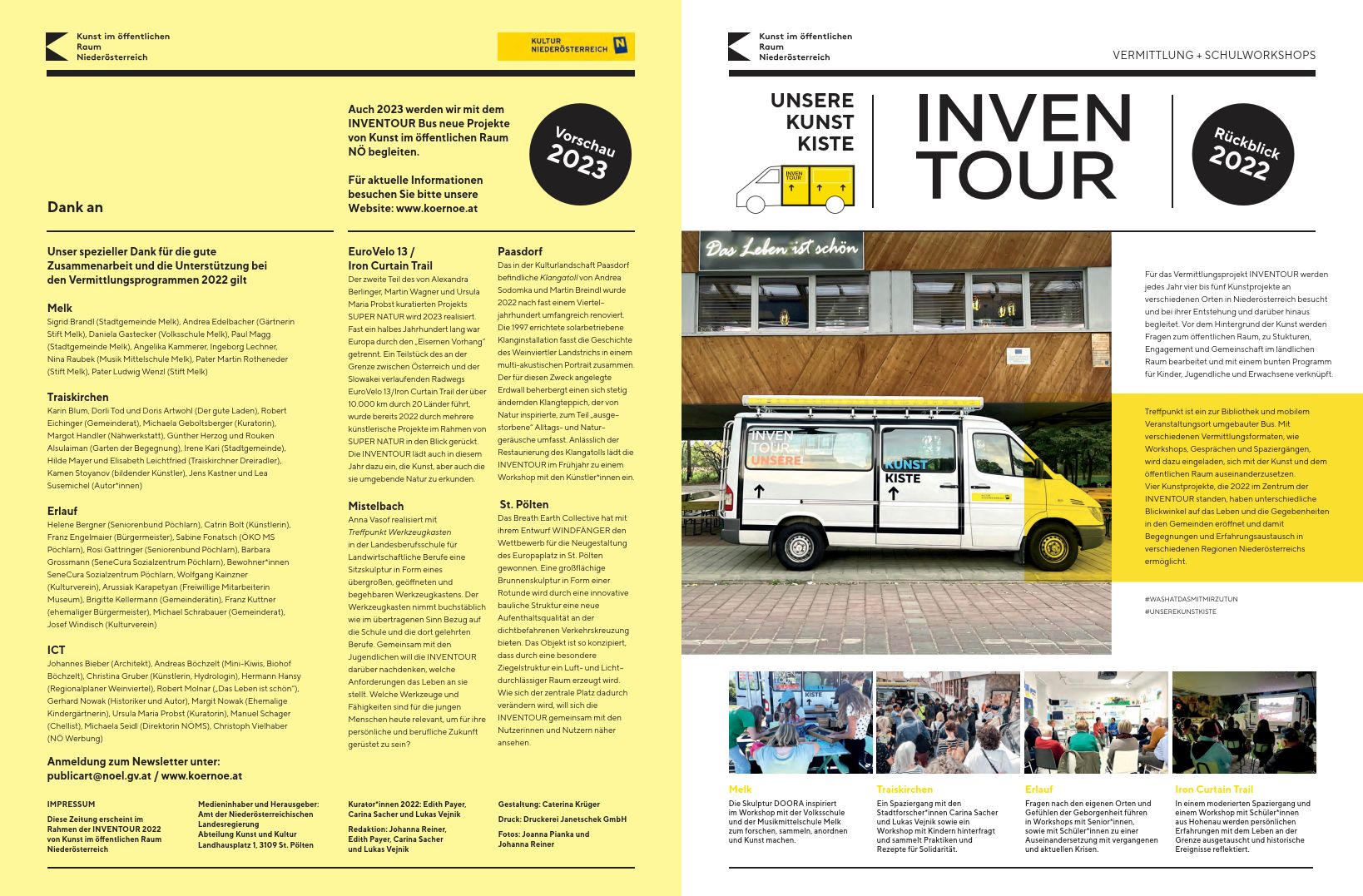 Edith Payer gestaltete die Vermittlung für DOORA von Kris Lemsalu in Melk und für das Projekt dazwischen von Catrin Bolt in Erlauf. Carina Sacher und Lukas Vejnik konzipierten moderierte Spaziergänge für zwei Projekte: zum einen für die Ausstellung What can be done – Praktiken der Solidarität in Traiskirchen und zum anderen für das Projekt SUPER NATUR, Teil 1, Kunst am Iron Curtain Trail in Hohenau und Angern an der March.
