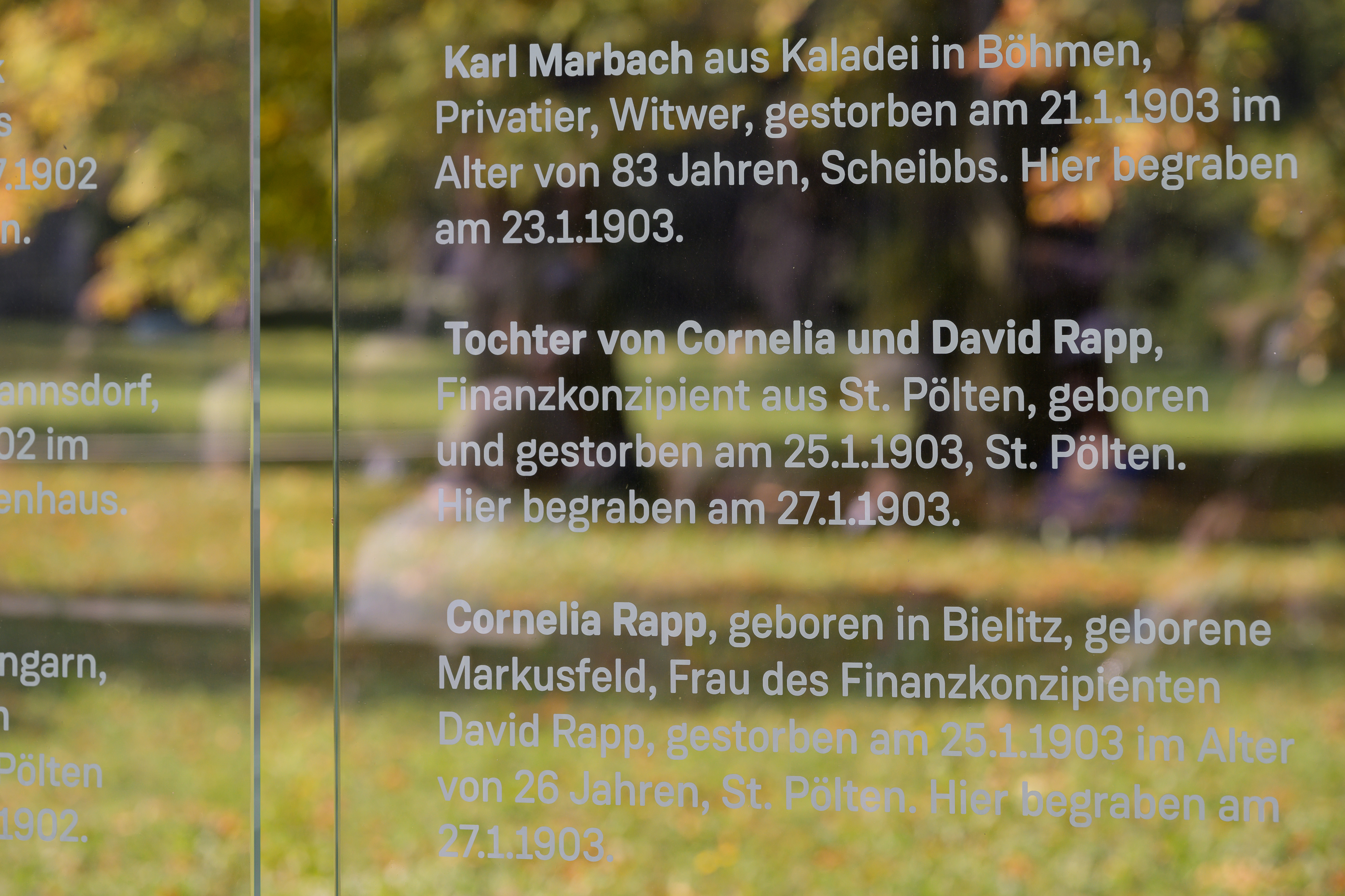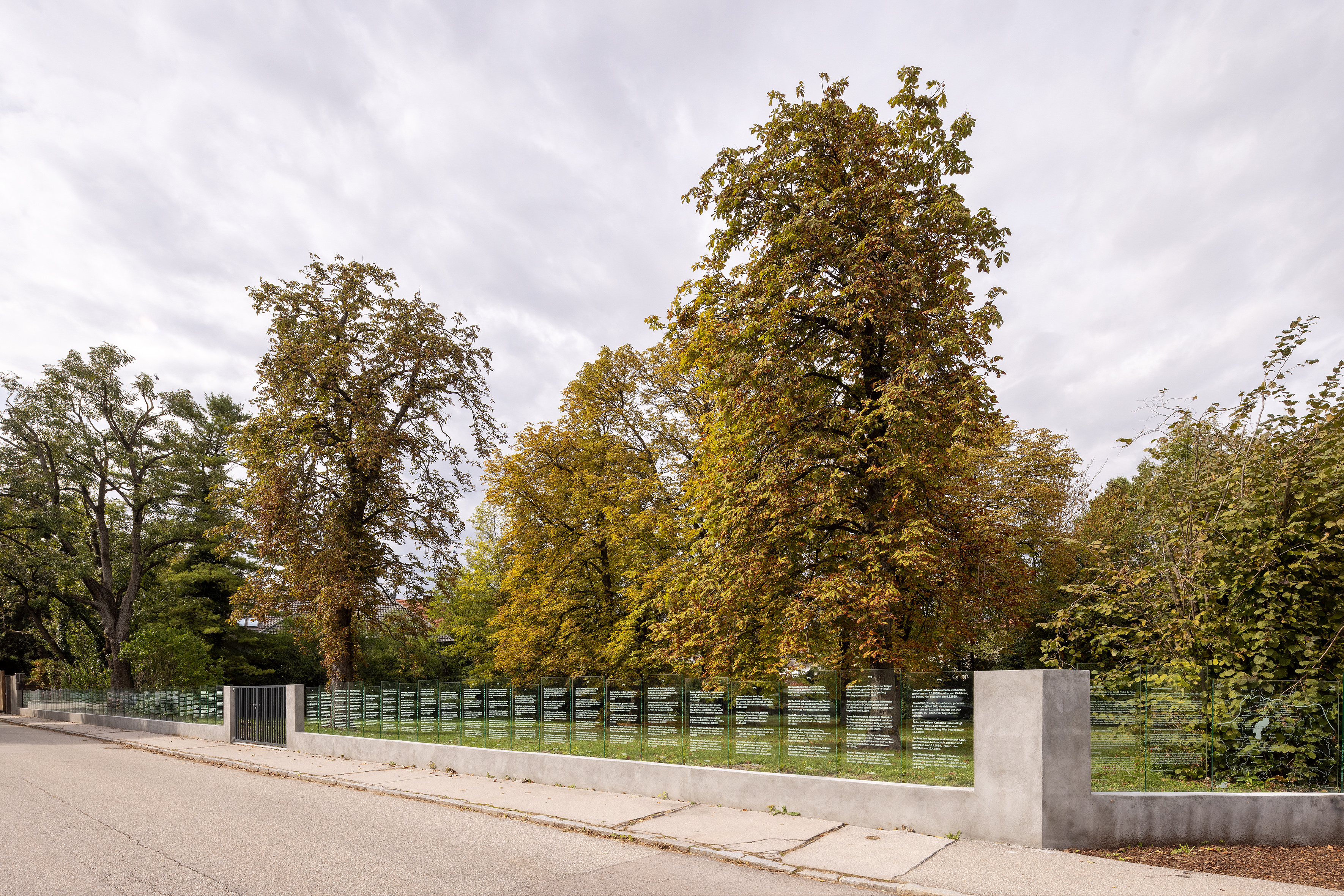 Mit Anna Artakers zurückhaltender wie präziser Gestaltung für den alten jüdischen Friedhof in St. Pölten wird den hier zwischen 1859 und 1906 beerdigten Mitgliedern der jüdischen Gemeinde, deren Grabsteine in der NS-Zeit geschändet wurden, eine Sichtbarkeit zurückgegeben. So entsteht eine neue Möglichkeit zur Erinnerung. Auf 116 in den historischen Sockel der Umfassungsmauer montierten Glasplatten sind ihre Namen zu lesen. Sie setzen eine Markierung, ohne den Blick zu verstellen, und geben diesem Teil der Geschichte St. Pöltens Präsenz und Bedeutung zurück.