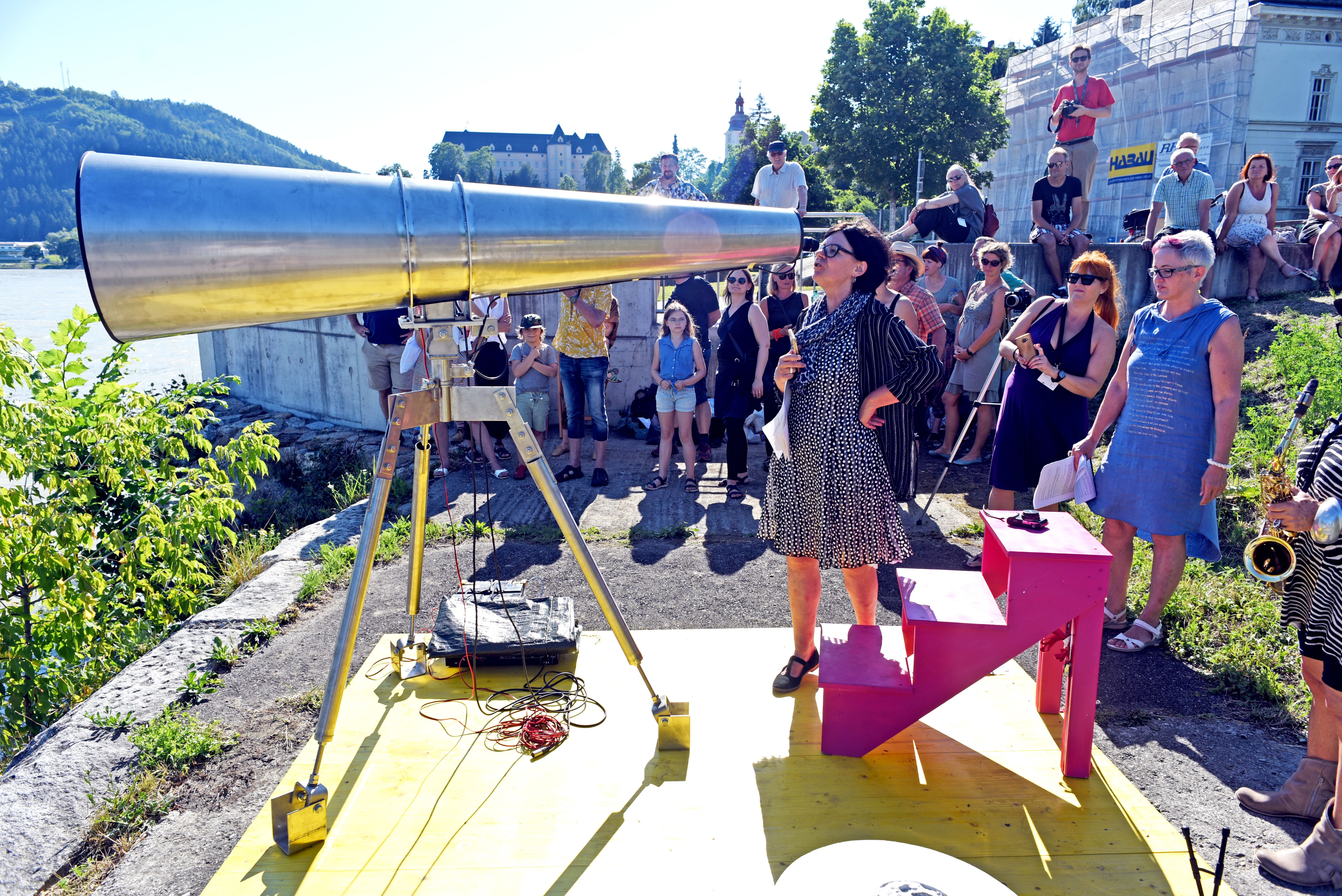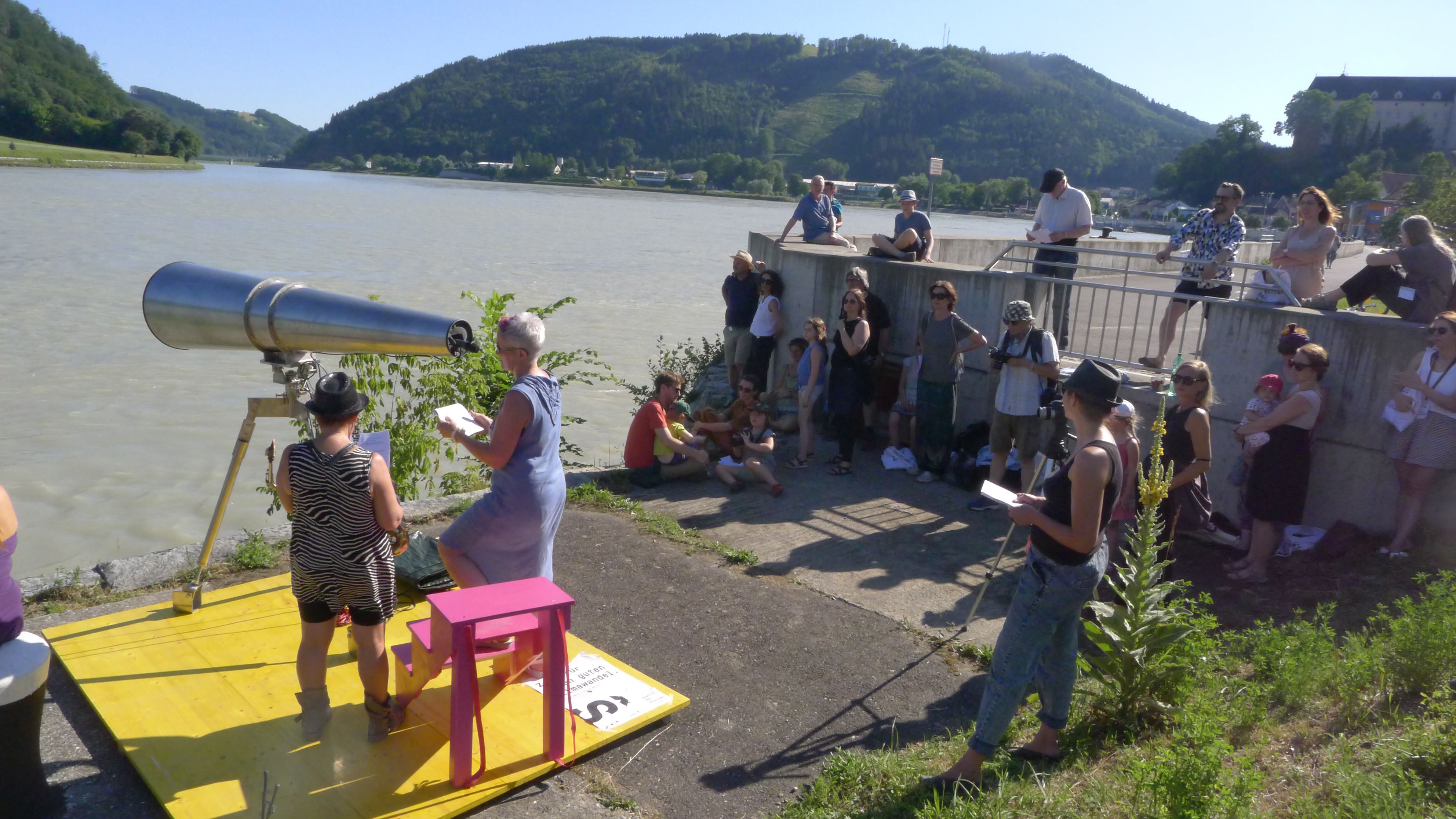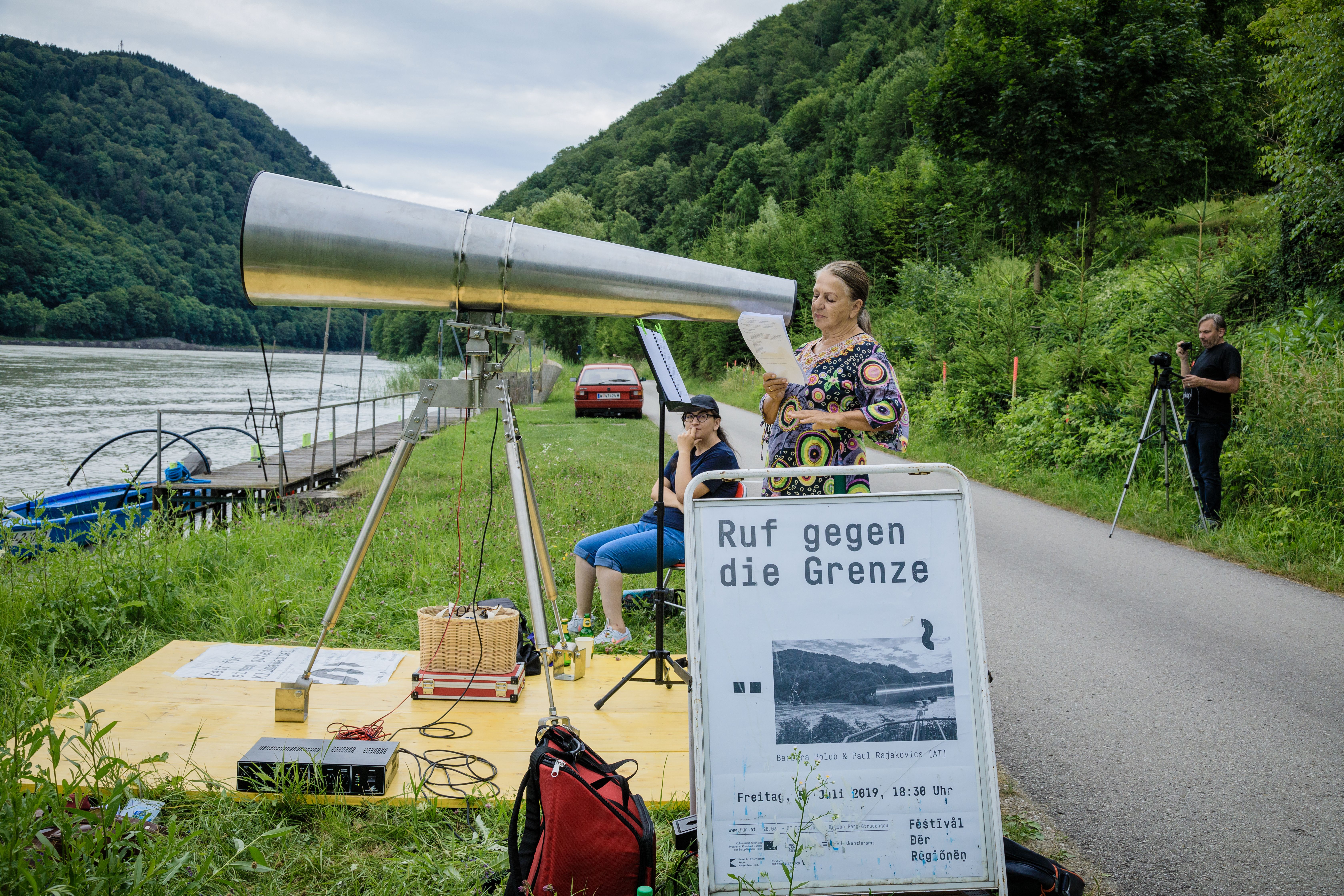 Based on workshops and conversations with locals transparadiso developped a visionary, fictional, experimental dalog "across the border" in a collaborative process, including excerpts of the correspondence between August Strindberg and Frida Uhl (1893-1894). The Call Against Borders was performed with two large scale megaphon-sculptures (connecting to "Times of Dilemma") across the River Danube which constitutes the fluid border between these two regions in Austria.