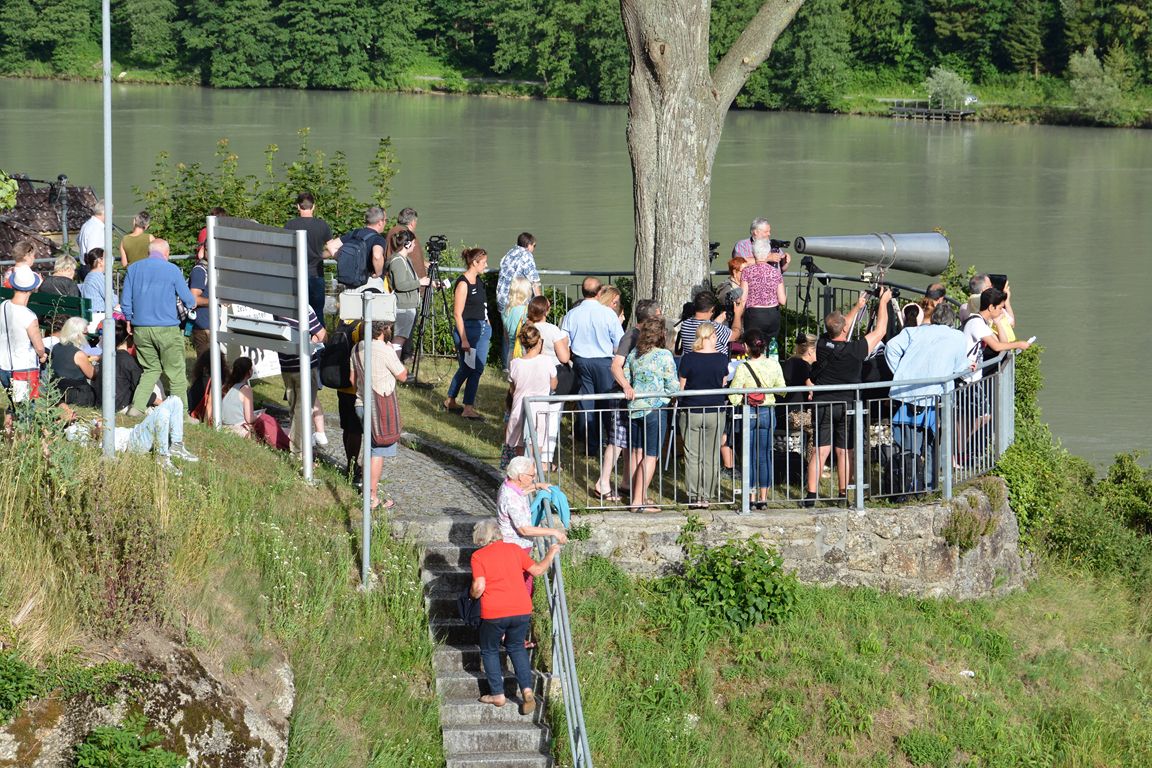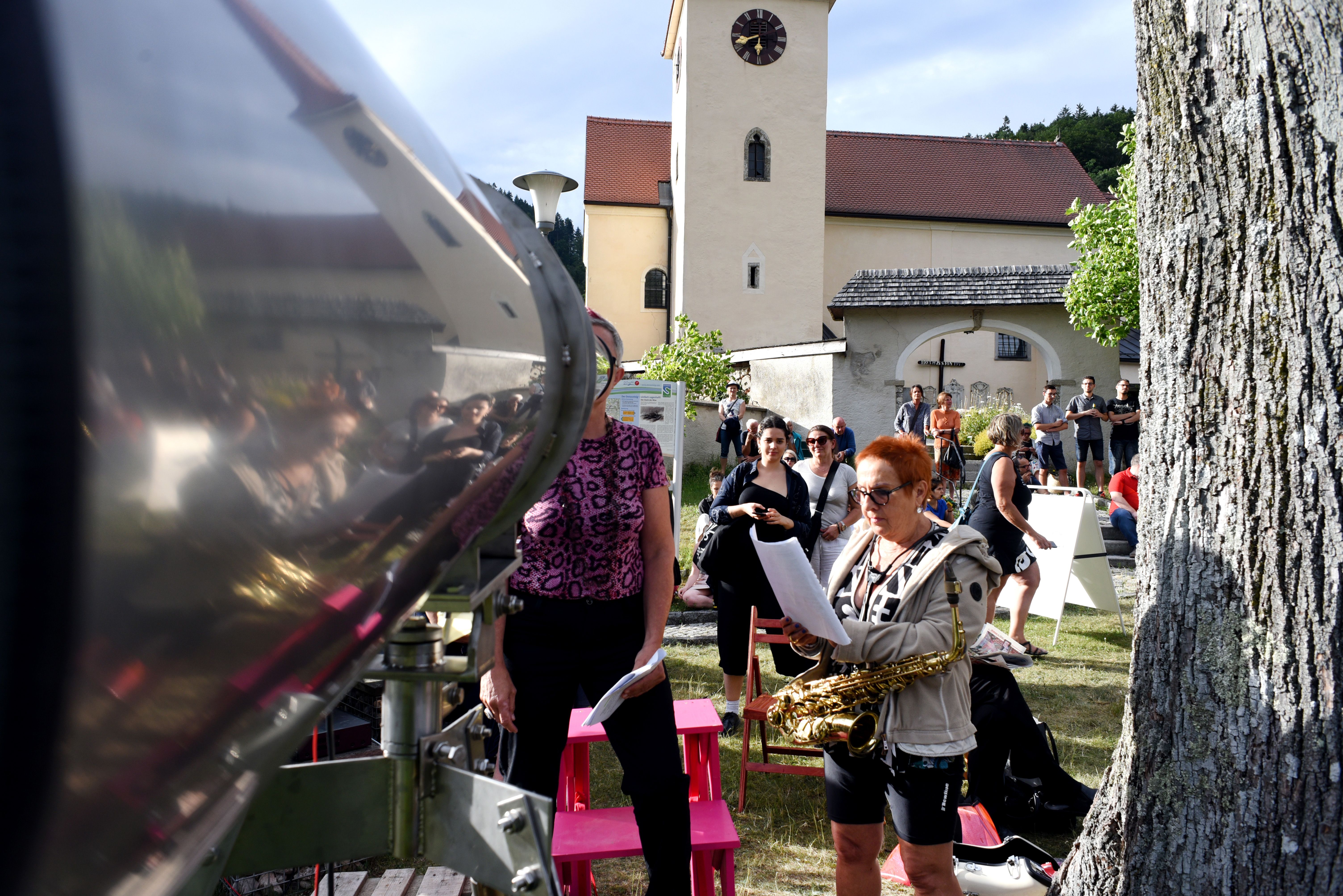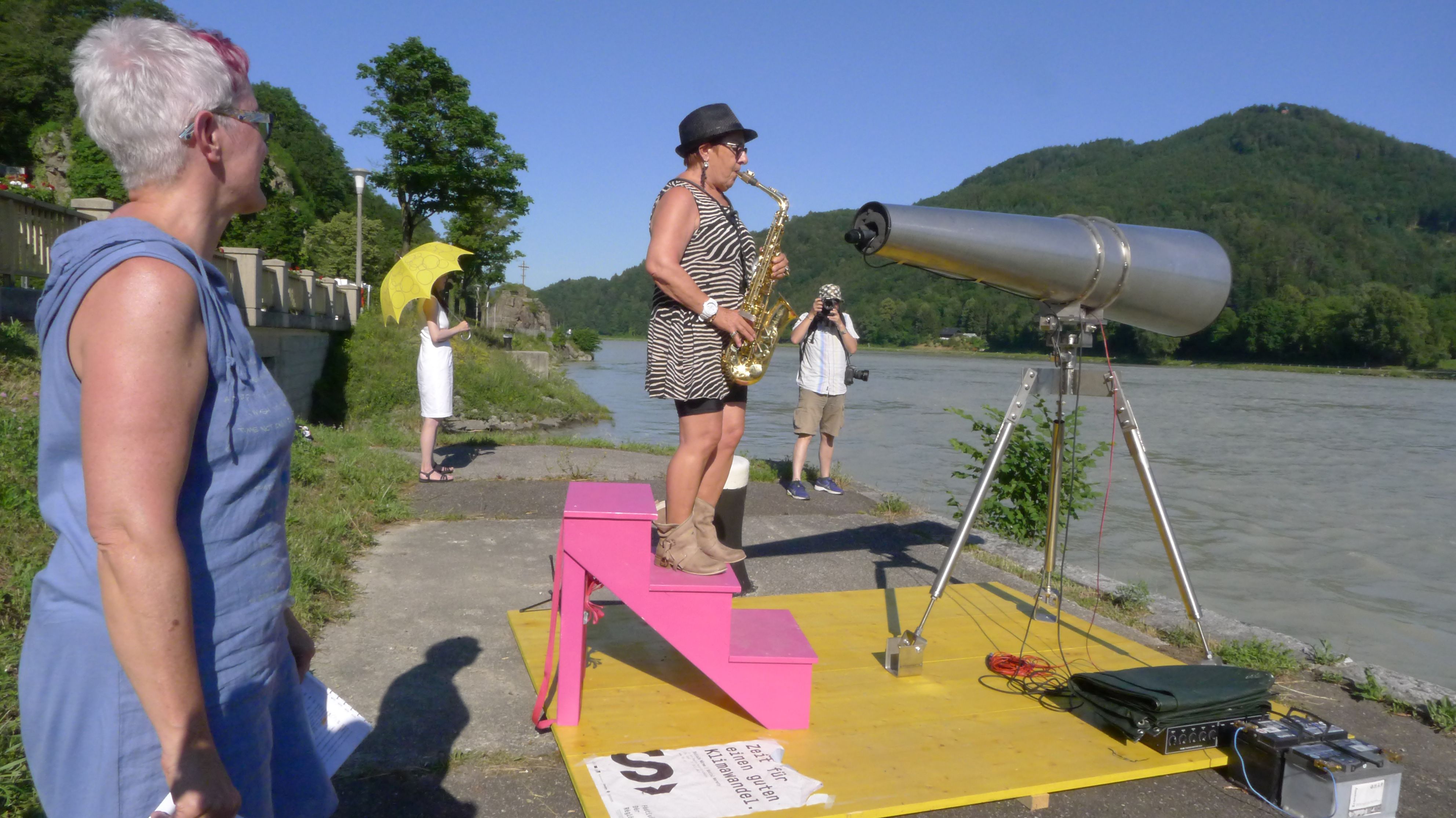 Based on workshops and conversations with locals transparadiso developped a visionary, fictional, experimental dalog "across the border" in a collaborative process, including excerpts of the correspondence between August Strindberg and Frida Uhl (1893-1894). The Call Against Borders was performed with two large scale megaphon-sculptures (connecting to "Times of Dilemma") across the River Danube which constitutes the fluid border between these two regions in Austria.