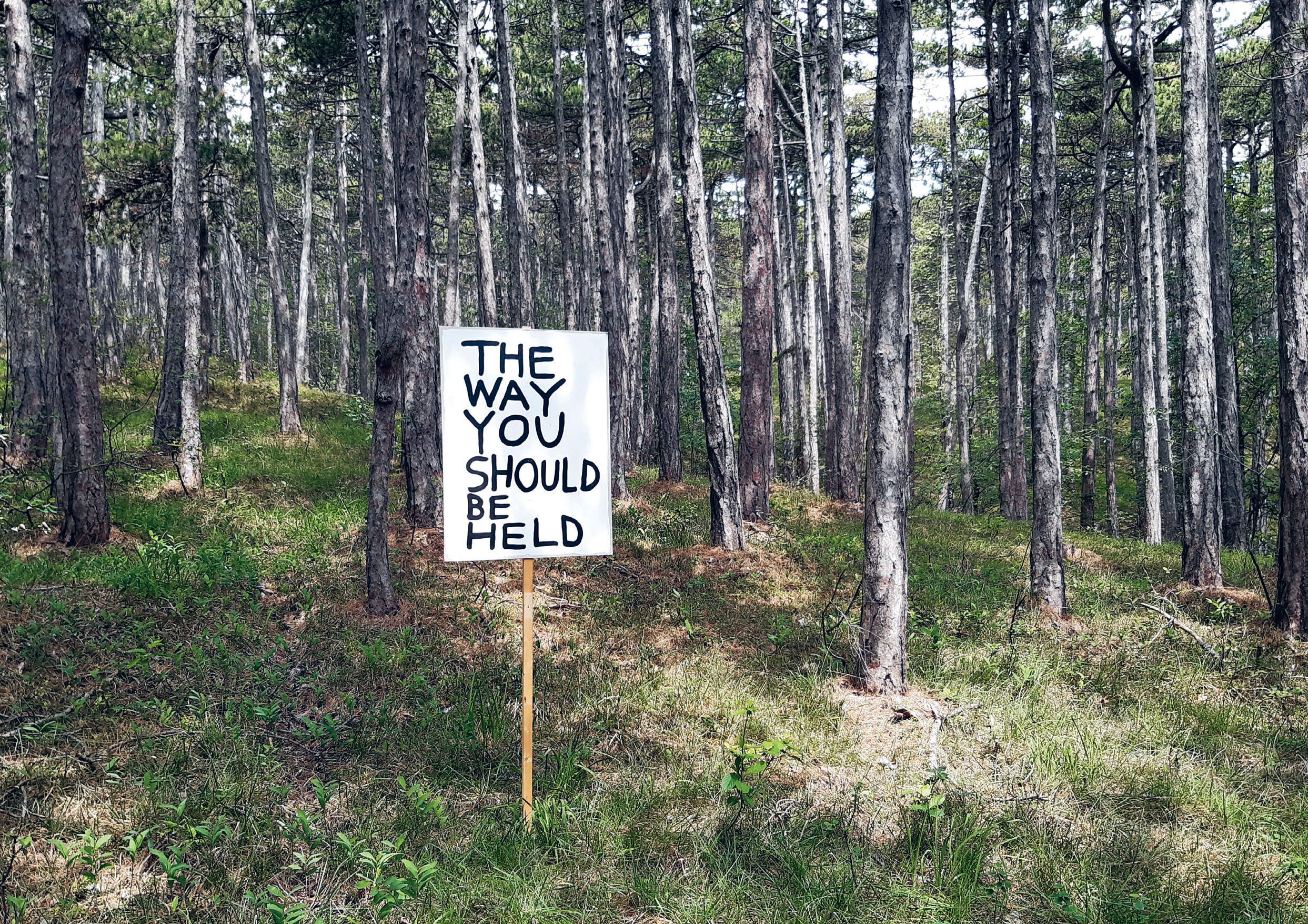 The card THE WAY YOU SHOULD BE HELD by Andrea Lüth is also performative in the broadest sense and shows a sign printed with these words in front of a forest flooded with sunlight. Both the subject and object of this statement are left suggestively open. This short sentence, which she borrowed from a pop ballad, creates a feeling of insecurity and trust at the same time, while also condensing the emotions and moods triggered by the pandemic and its consequences in a poignant way.5