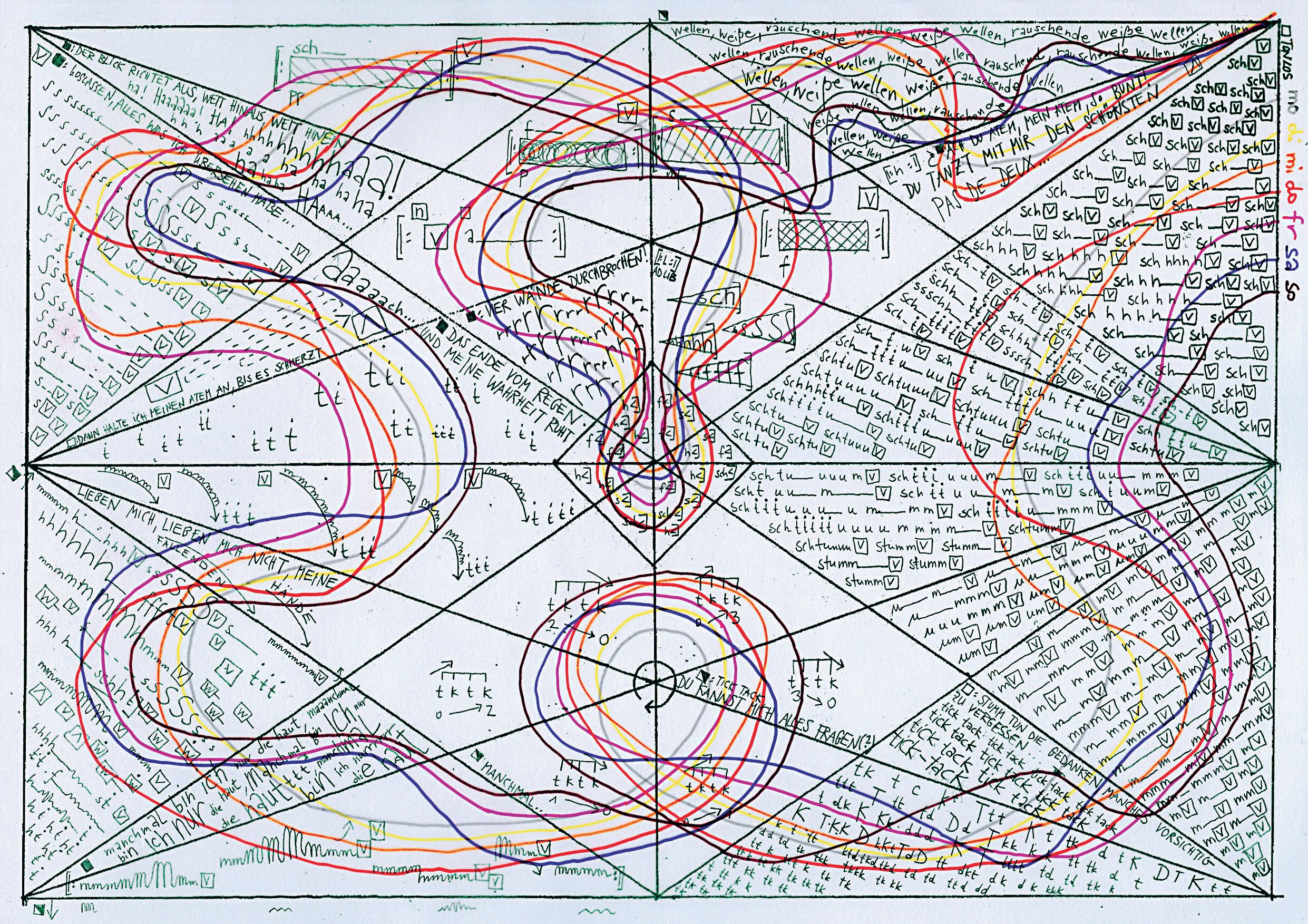 Osojnik’s card Doorways 8/META (ATEM RÜCKWÄRTS) (Doorways 8/META (Breath Backwards)), which is structured with letters and words and lines of movement, is a graphic work that is a musical score, choreography, and poem all at once. It is designed for one or more people to be played as a way to communicate with themselves through movement and speech in a “kind of Dadaistic fashion of talking to yourself, a little meditation about the poem interwoven in the play between your own voice and breath,” says Osojnik.