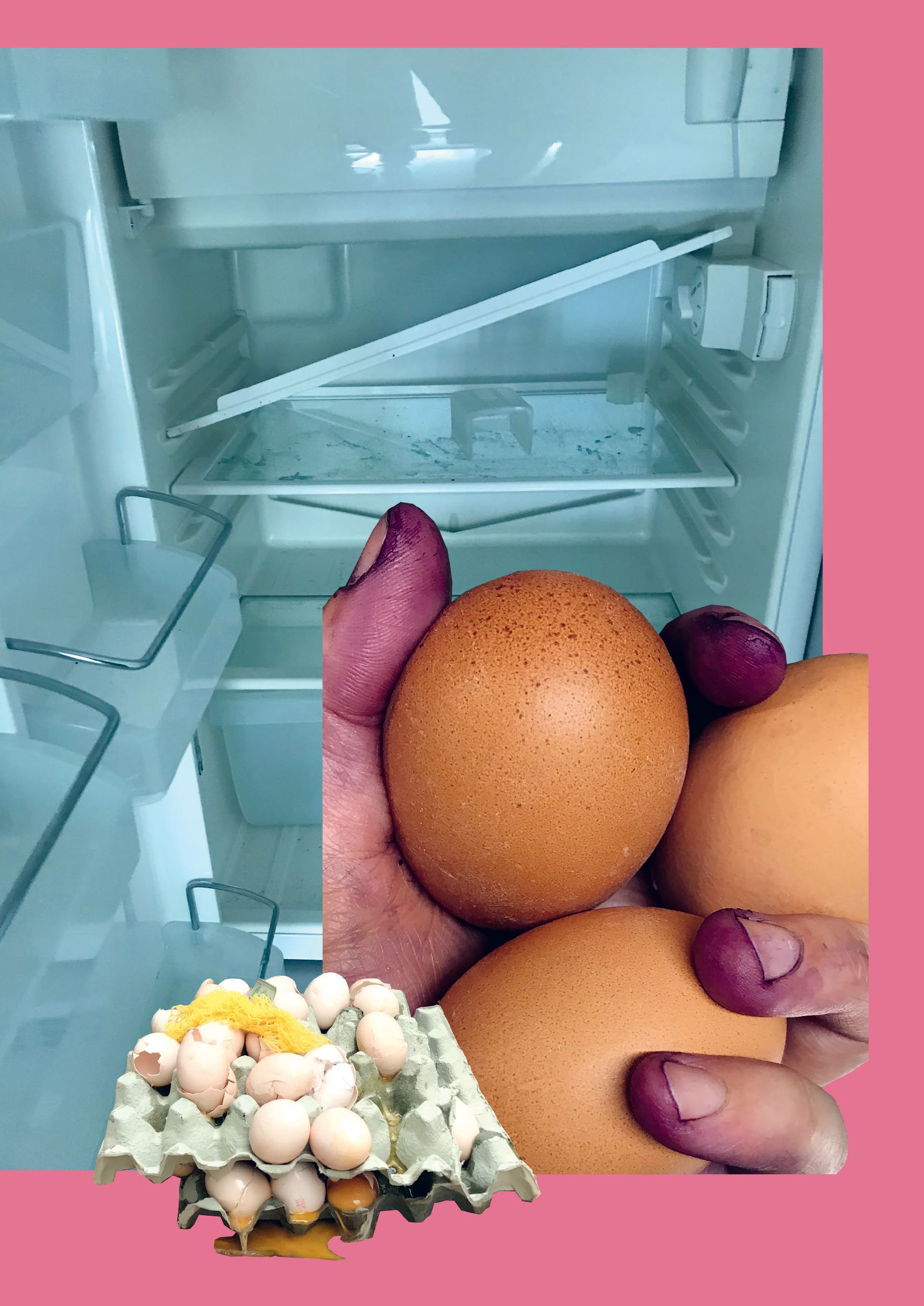 Steffi Parlow chose the opposite perspective with her humorous approach in Parlsches Senfei für dich (Hard-Boiled Eggs with Mustard Sauce for You). She draws our attention to the indoors—to how we have had to withdraw to our homes because of the lockdown. The empty refrigerator in her collage becomes a (slightly frightening) metaphor for the unusual restrictions, while her robust cook’s hand with red fingers appear ready to make the best out of the situation. On the back of the card, she includes a detailed recipe for the eggs in mustard sauce indicated in the title.