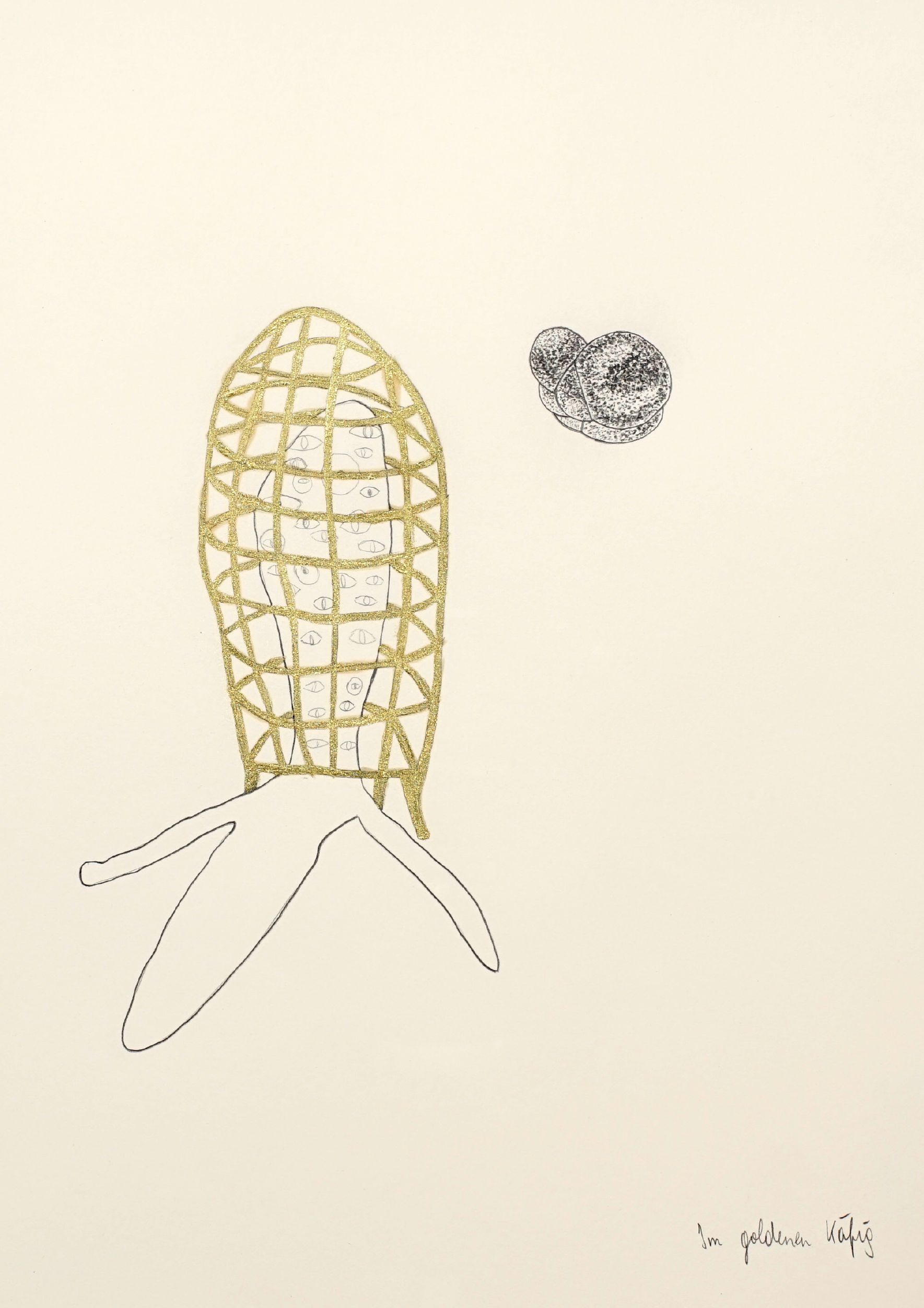 „Sich einzuschließen, um mögliche Gefahren auszuschließen war das Gebot der Stunde.“, so die Künstlerin. Ein unbekanntes Wesen, ein Kopf mit unzähligen Augen und darüber ein Käfig aus Gold. Es ist kein menschliches Wesen, wenngleich es uns nicht gänzlich unähnlich ist, aber hier wohl ganz bewusst Zuschreibungen jeglicher Art ausgespart sind. Der goldene Käfig steht hier sinnbildlich für die Reglementierungen und stellt die Frage, wie wir damit umgehen, wenn diese Einschränkungen zwar dem Gemeinwohl dienen, wir aber die individuellen Auswirkungen weitgehend alleine bewältigen müssen. Wie alle schwierigen Situationen bietet auch diese die Möglichkeit, Bedingungen für gemeinschaftliches Zusammenleben oder gesellschaftliche Visionen neu zu denken und den goldenen Käfig für einen Perspektivenwechsel zu nutzen.