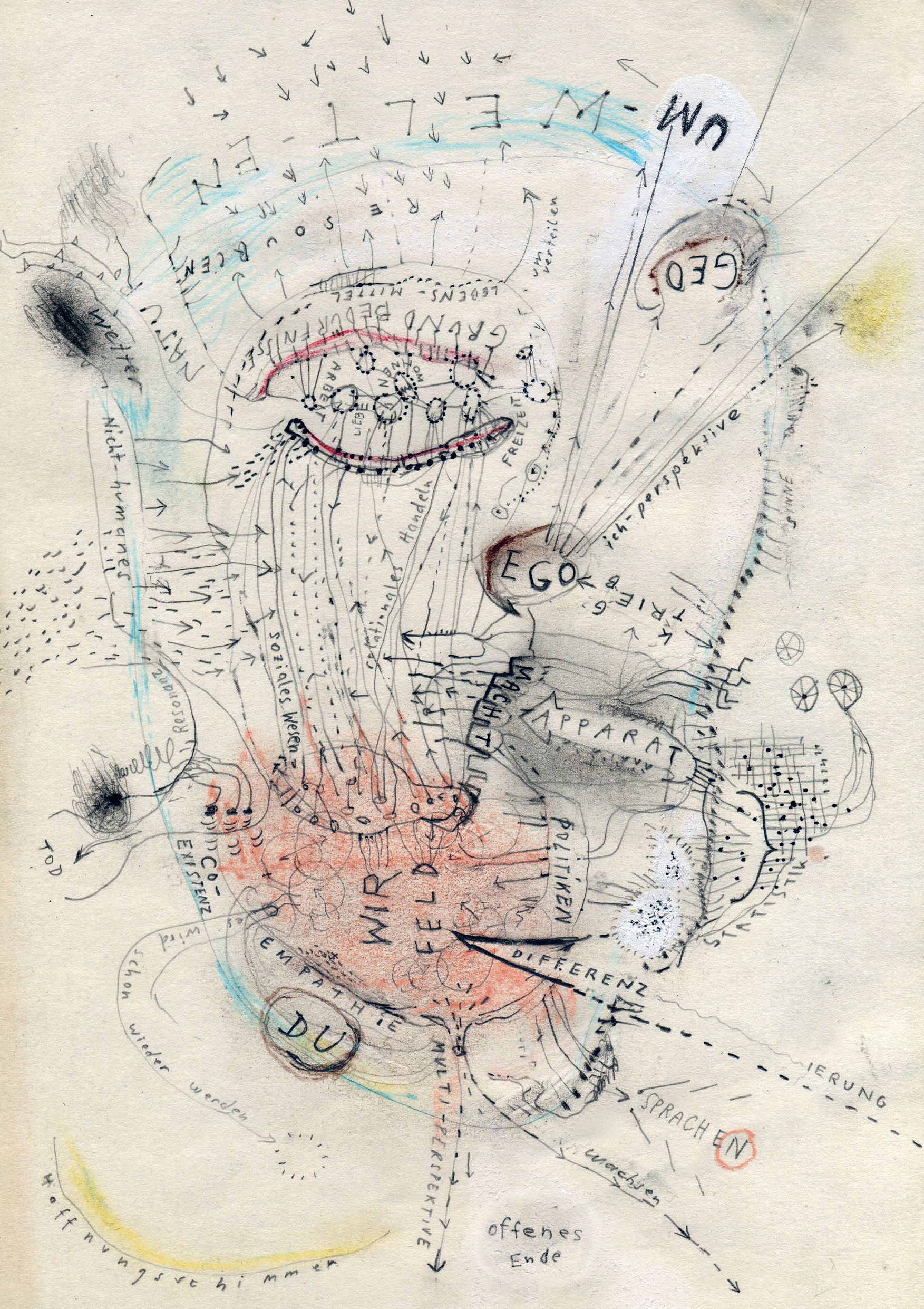 For Nikolaus Gansterer’s card, whose title ja wie wollen wir unser zusammen leben gestalten? (how do we want to all live together?) is meant as a global question to himself and us, he shows a drawing in which he combines philosophical, ethical, social, economic, and geopolitical themes. The subtleness of the drawn lines and the delicate coloring corresponds to the theme of the substantial fragility of the “global fabric” he seems to have sketched here. For Gansterer, this is about “open systems” addressing the “non-representability of complexities,” which is why the sketch does not follow “any fixed direction of reading.” Instead, it “marks tensions, axes of thinking, zones of conflict” and calls for a “change in perspective” and “self-empowerment.”6