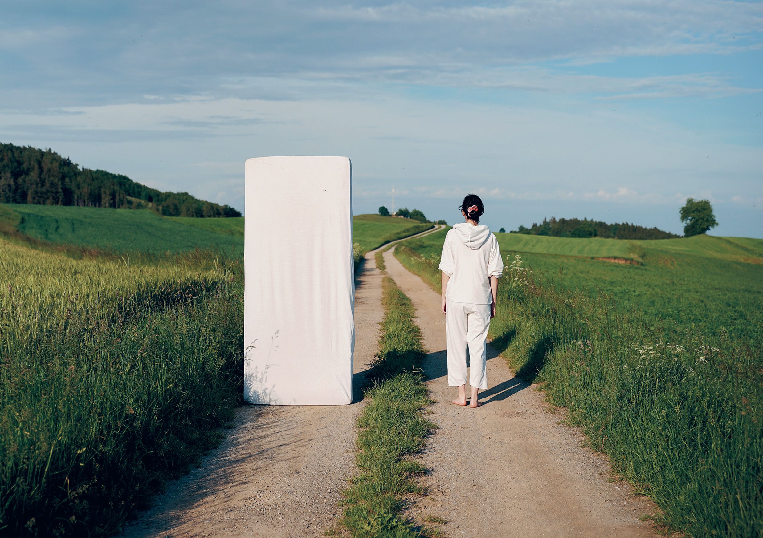 We see a young woman from behind. She is barefoot and wearing a white sweat suit, standing upright on a slightly curving path that cuts through green meadows and fields only to disappear into the blue sky on the horizon. Next to her, also standing upright, is a kind of companion: a white covered mattress. The two figures in bright white reflect in the sunlight and cast slanted shadows. Anne Glassner’s photograph Spaziergang mit Matratze (Walk with Mattress) draws us into its orbit with its ambiguity. Is it about inertia or a new beginning? The intimacy of the private realm or the performativity of the public realm? Vulnerability or strength?