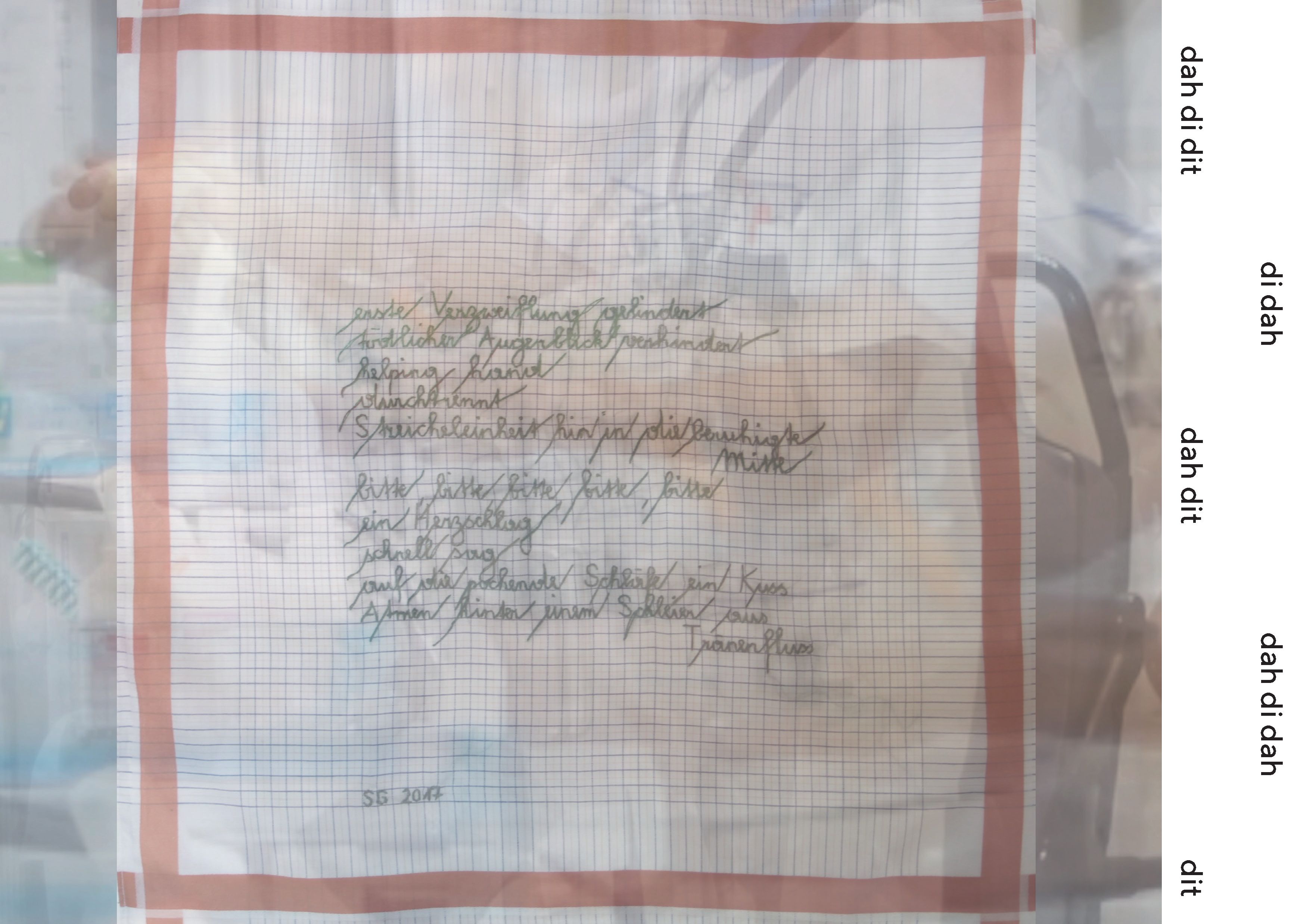 With her card DANKE (THANKS), Sabine Groschup superimposes an image of a vaguely recognizable hospital situation (perhaps an intensive care unit?) with a picture of one of her older works from 2017. In it, we see a handkerchief on which she has stitched a poem she wrote about someone near her being saved from death at the very last second through medical intervention. On the edge of the card, she embossed the word “DANKE” (thanks) in Morse code, illustrating the problems of communication in times of crisis.