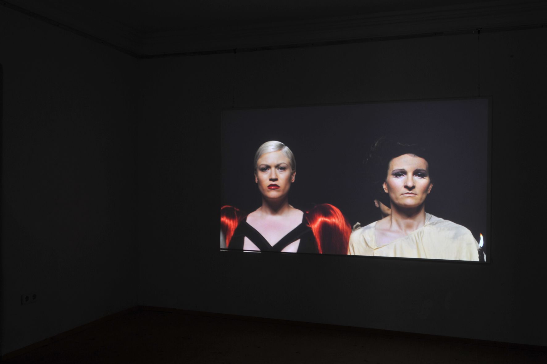 In reality, Bertha von Suttner’s story was modern and adventurous. After having been engaged several times and having tried to become a singer, she had an amour fou with Arthur Gundaccar von Suttner. Leaving the social constraints and prohibitions of Vienna behind, she fled with him to the "wild" Caucasus and its wonderful promise of freedom. Katrina Daschner has interpreted this exotic and excessive side of the Nobel Prize laureate as a flamboyant travesty. Daschner created a burlesque film called Bertha, for which she found a glamorous location: Carlo Mollino’s Teatro Regio in Torino, a setting that is a symphony of red velvet, Plexiglas, and female curves. A choir of women wearing Bertha von Suttner outfits function as narrative protagonists located somewhere between Bertold Brecht, performance, modern dance, and political satire. This bold film celebrates self-confident women who are very determined, cheerful, and high spirited.