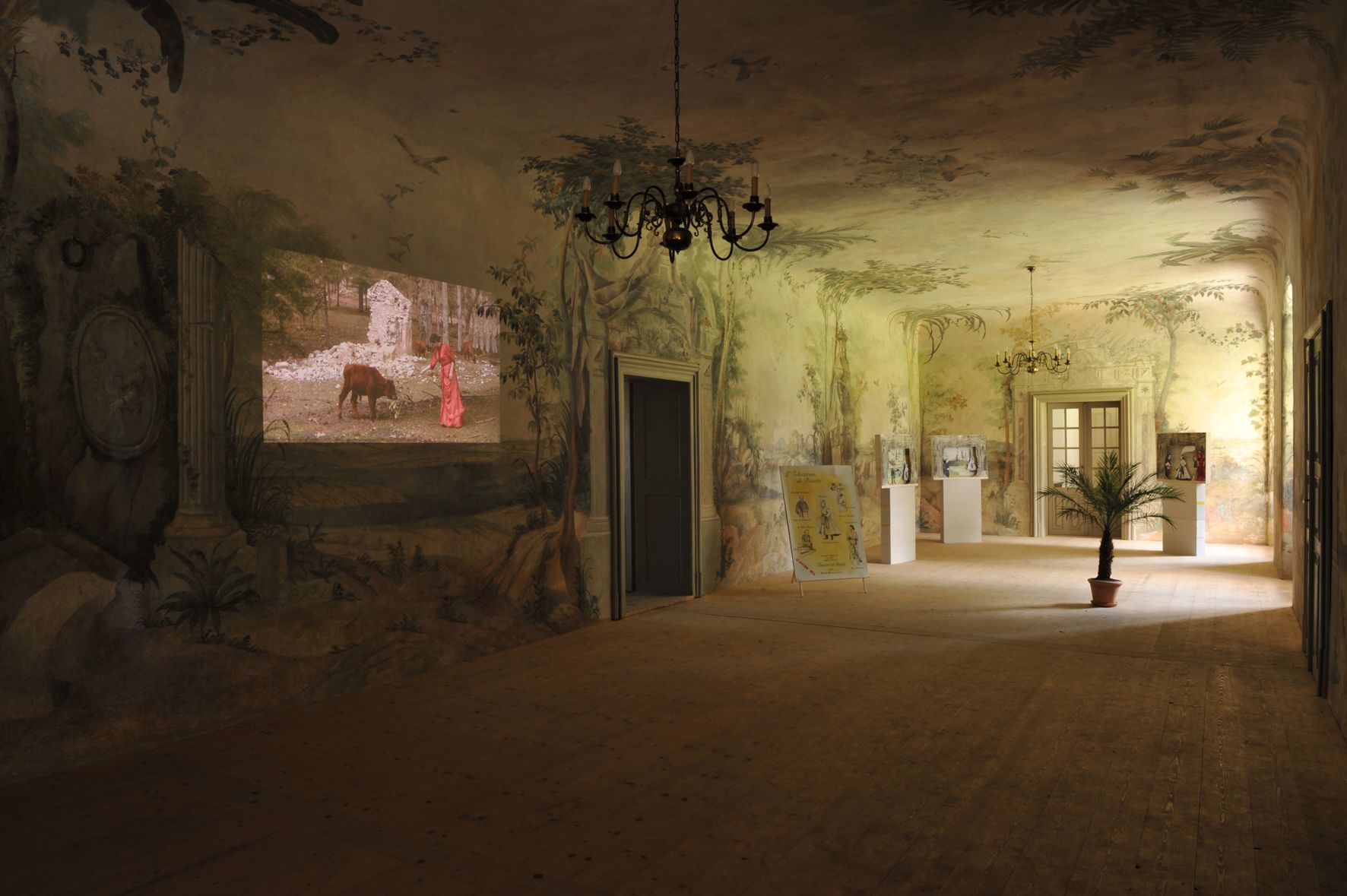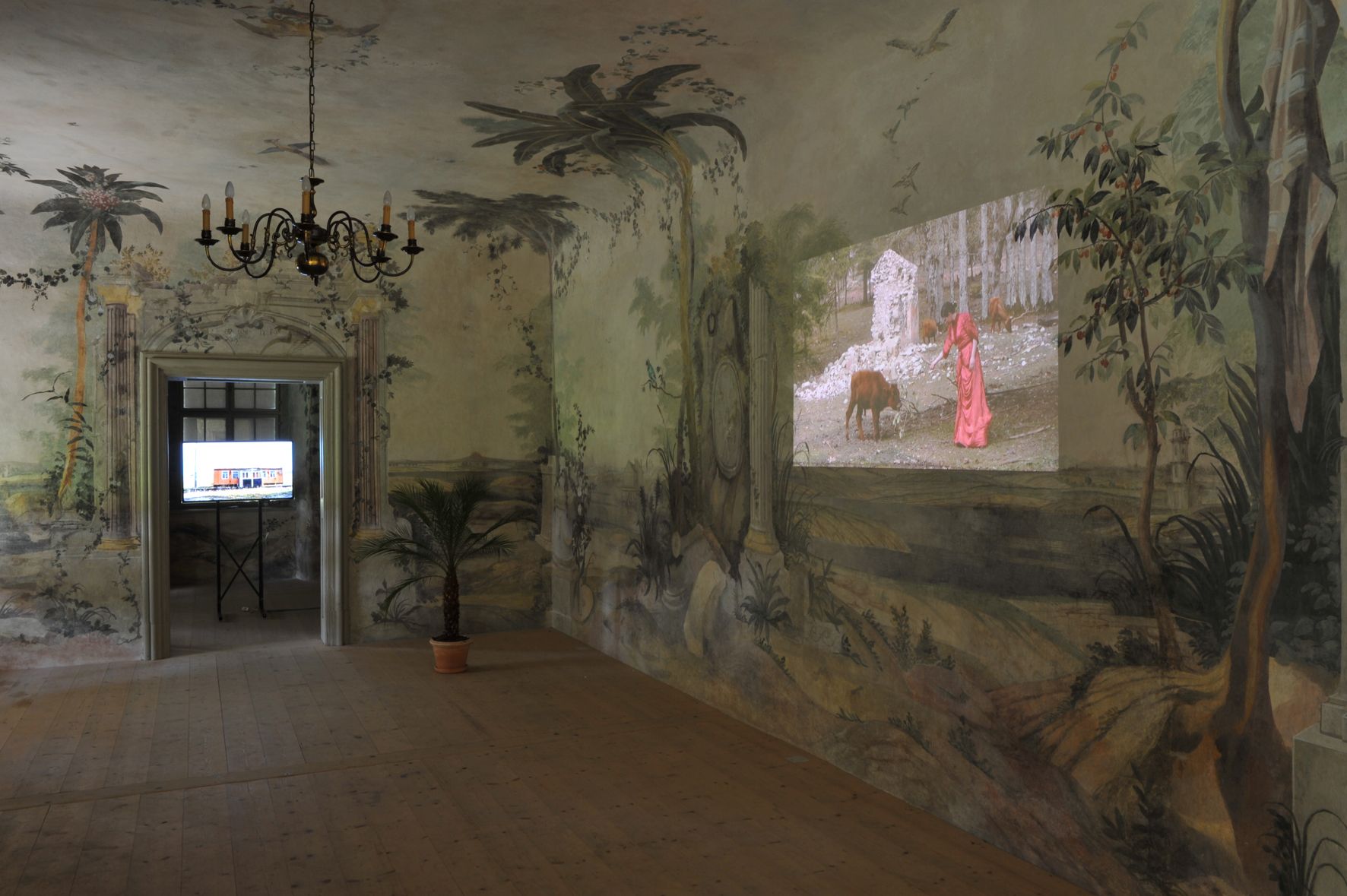 In this video, the two forgotten arias are brought back to life. Helmut & Johanna Kandl recorded them in the surroundings of the derelict ruins of Gordi Palace, the Dadianis’ old summer residence, thus referring to the ancient area of Colchis, Medea’s home, as well as the motif of the flight of the lovers (Medea & Jason, Manon & Des Grieux, Bertha & Arthur). The artists combine Greek mythology with the story of Bertha von Suttner, comparing and contrasting history with the mundane world of streets, markets, and survival strategies in modern day Tbilisi. "Wir holen uns das Goldene Vlies" (We’re After the Golden Fleece) combines film, sculpture, and painting (tempera on paper) in an installation in the theater of the Schüttkasten (the former granary) in Harmannsdorf. Incorporated in the work is also the famous Baroque illusionary painting by Johann Wenzel Bergl and his associates. To the Kandls, this work represents the spirit of Bertha von Suttner, who was a legendary builder of bridges between different worlds.