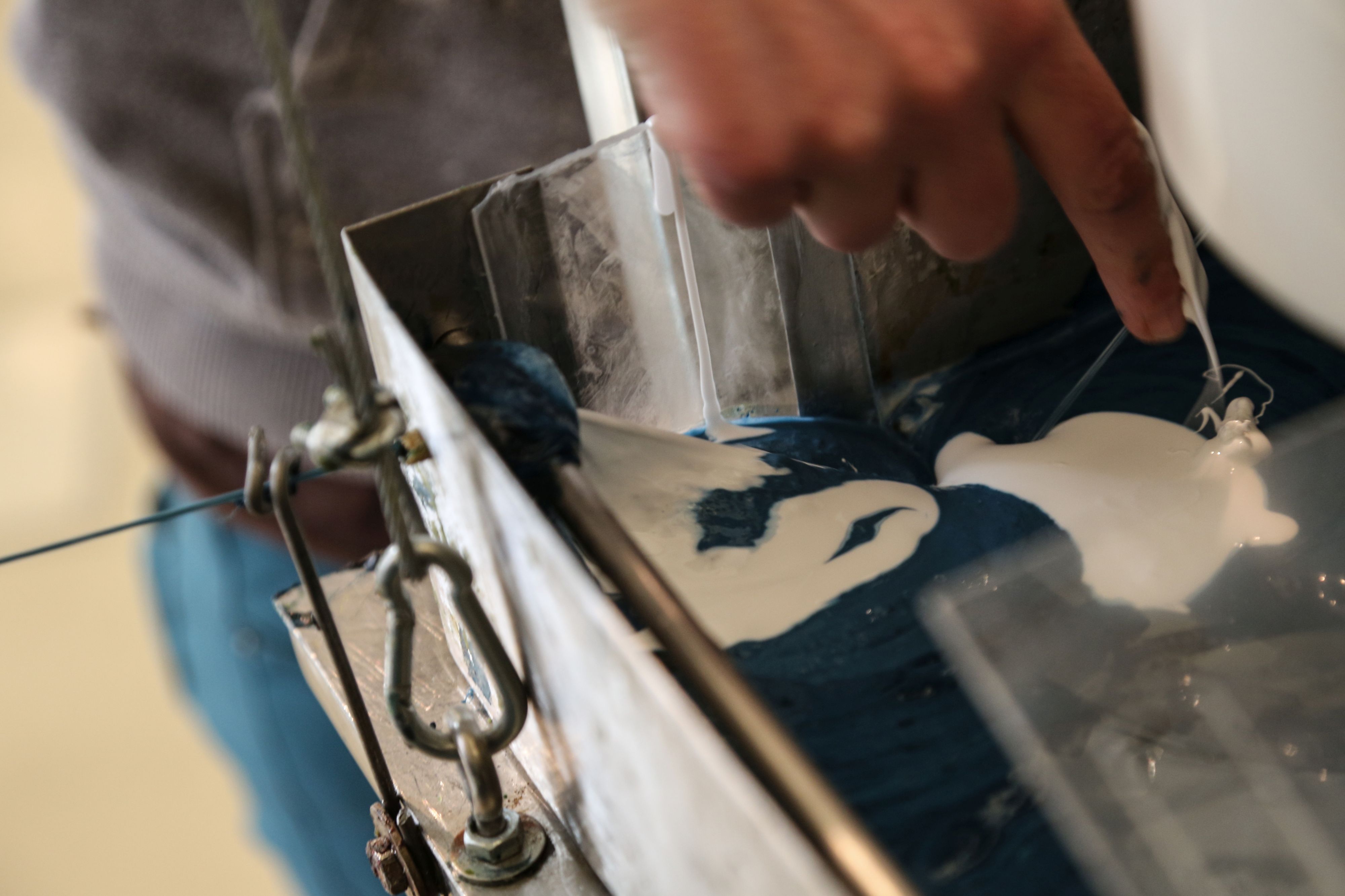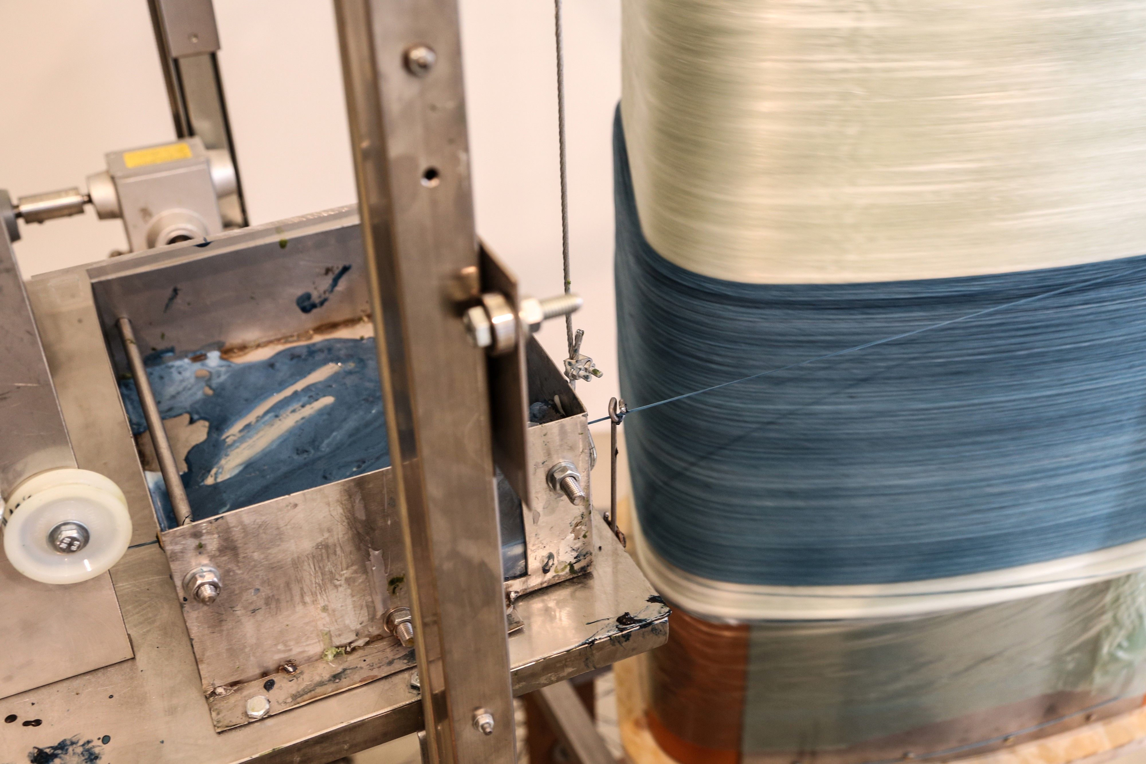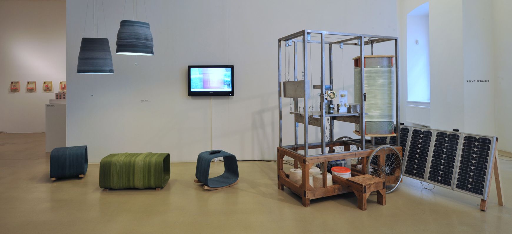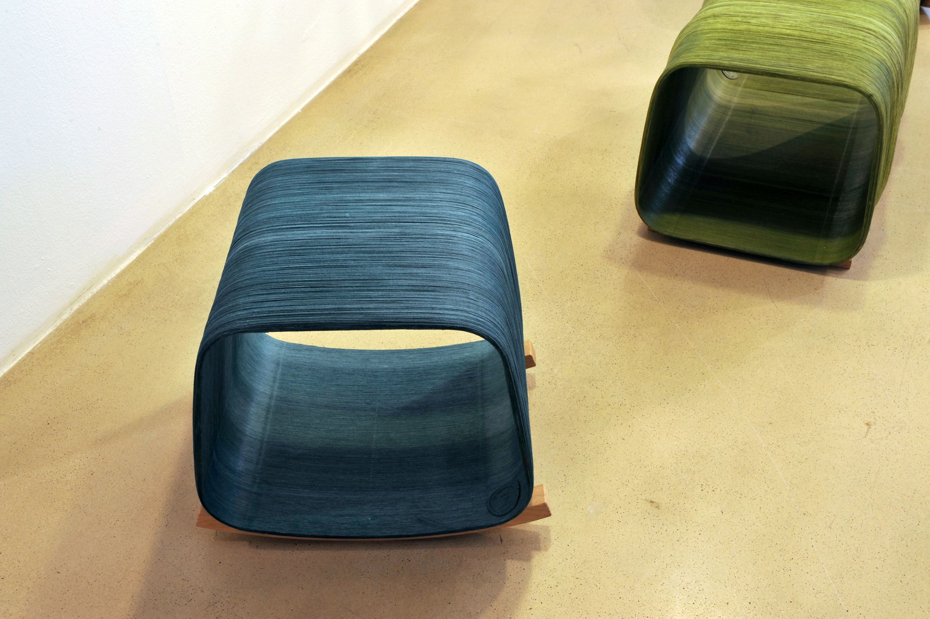 Auch hier wird Produktivität von den ökonomischen Gesetzmäßigkeiten des "Time-to-Market" ausgelagert und in ein anderes, viel langsameres System gebracht, dem des natürlichen Stoffwechsels und des Klimas. Eine temporär in der Landschaft installierte "Maschine", betrieben durch einen Sonnenkollektor, produziert je nach Wetter und Licht ein zylinderförmiges Objekt aus einem gefärbten Baumwollfaden, der im Verlauf der Herstellung durch Tischlerleim gezogen, auf einer zylinderförmigen Achse aufgespult und nach dem Trocknen und Abnehmen zu einem nutzbaren Sitzobjekt wird. Jedes einzelne Stück, das so entsteht sieht farblich wie strukturell anders aus. Je nachdem wie die Sonneneinstrahlung war, wickelt sich der Faden langsam oder schneller auf den Zylinder und verändert durch die Geschwindigkeit auch seine Farbgebung. Der Wachstumsprozess des dabei entstehenden Objekts erinnert an die Dynamik eines wachsenden Baums durch dessen Ringe im Stamm bestimmte meteorologische Situationen in seinem Leben gespeichert sind und für immer dort abgelesen werden können. Irgendwie ist man auch an die Einzigartigkeit des menschlichen Fingerabdrucks erinnert.