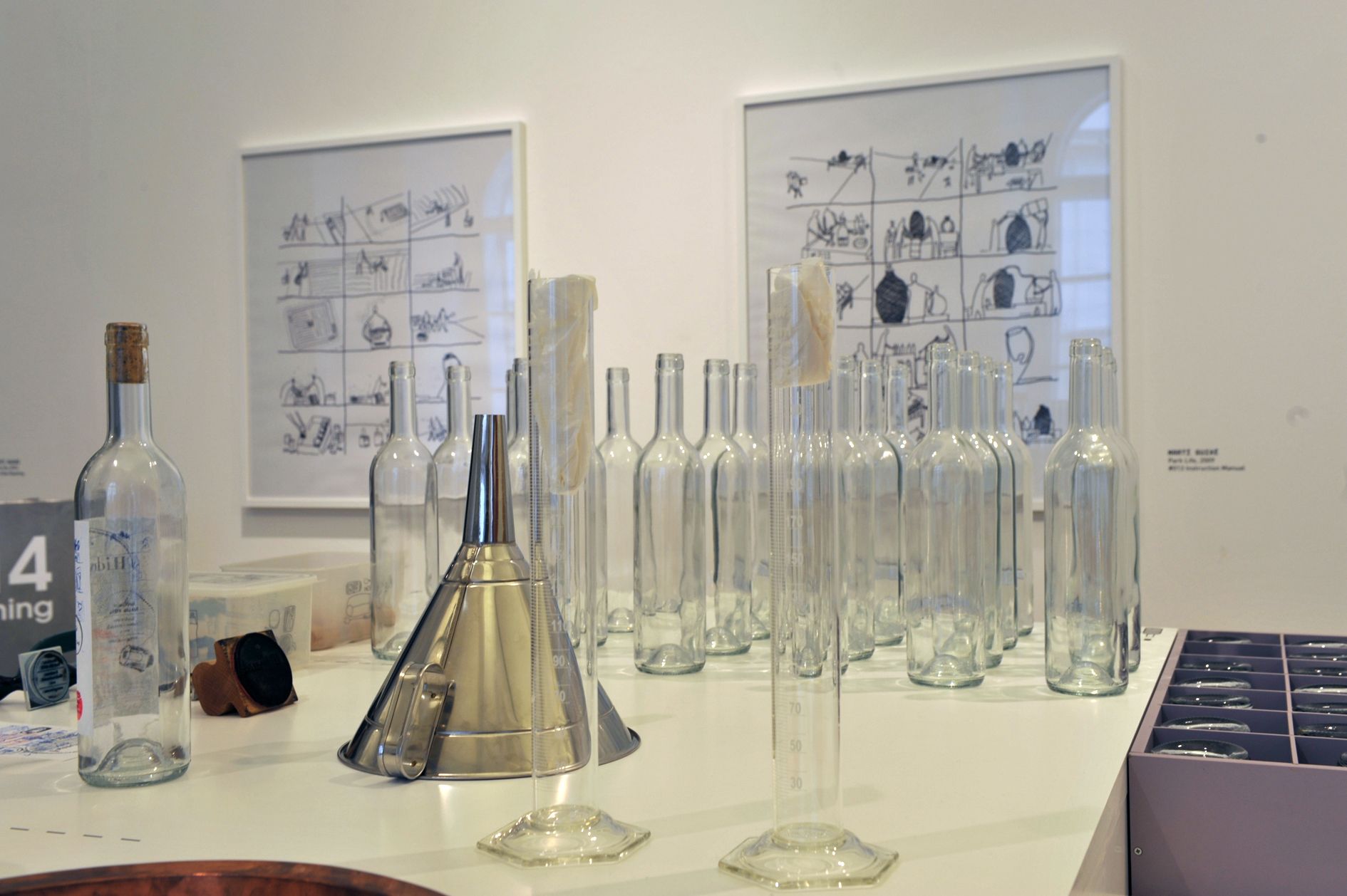 In seiner Arbeit "Hidromel Factory", die in der Ausstellung gezeigt und verwendet wird, hat Martí Guixé ein Dispositiv zur Herstellung von Met, also Honigwein, geschaffen. In Form einer an alchemistische Versuchsanordnungen erinnernden Installation benützt er den Galerieraum als Produktionsstätte und Freihandelszone für ein in Vergessenheit geratenes alkoholisches Getränk, das bereits 3500 Jahre vor unserer Zeitrechnung bekannt war. In bewusst parasitärer Weise nutzt er die mythologisch-narrative Kodierung von Met als Opfer und Trank der Götter ohne visuell direkt darauf hinzuweisen. Als zweite Arbeit von Guixé wird "Bee Roaming" in der Ausstellung gezeigt. Es handelt sich um einen transportablen Bienenstock, der es ermöglicht bestimmte lokale Spezies von Blüten, Gräsern oder Getreidesorten durch die Arbeit der Bienen einzufangen um sie dann als Geschmacksnoten und Düfte im Honig selbst zu speichern, ähnlich der Methode des romantischen Landschaftsmalers im Freien, der versucht sinnliche Eindrücke der Natur mit Pinsel, Farbe und Leinwand einzufangen und so in ein kulturelles Produkt zu verwandeln.