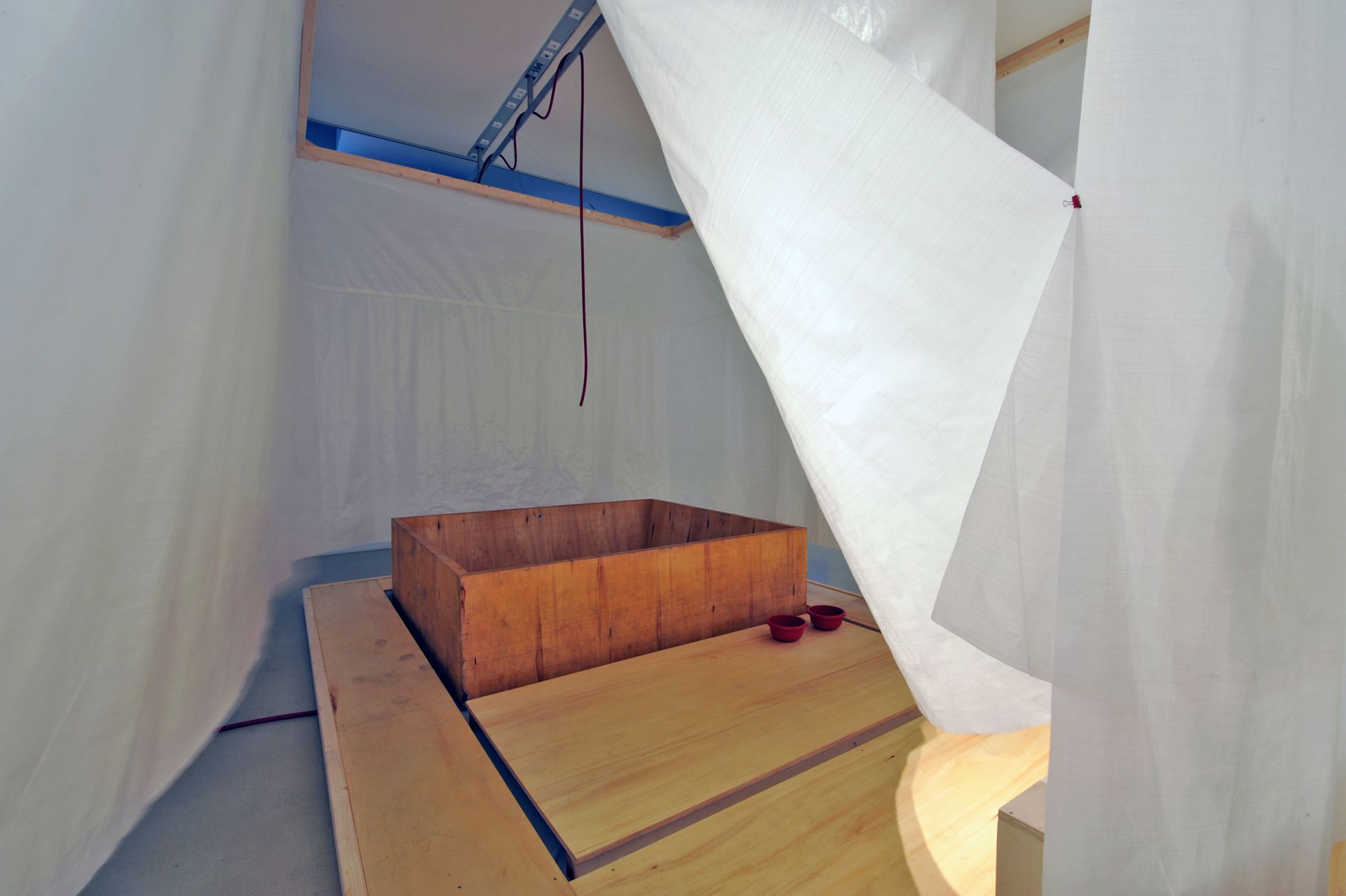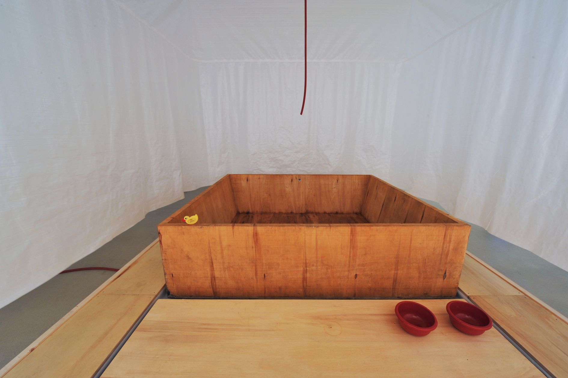 Eine andere mittelalterliche Tradition, auf die sich der oberösterreichische Designer Andreas Strauss in seiner Arbeit bezieht, ist die des kollektiven Badens. Die Badehäuser als soziales Zentrum sind in den orientalischen Ländern stets offen und zugängig geblieben, das Hammam genauso wie die traditionellen japanischen Bäder. Für Strauss entsprechen diese traditionellen Modelle in keinster Weise der konsumorientierten Wellnesskultur. Das "soziale Baden" bedeutet eher ein Ritual, eine Zelebration des alltäglichen Lebens ohne Firlefanz. Die freie Zusammenkunft von Familie und Freunden in einer entspannten aber auch respektierenden Athmosphäre. Strauss nistet temporär eine große hölzerne Badewanne für sechs Personen mit getrennter Reinigungseinheit und zirkulierendem Warmwasserkreislauf in die Räumlichkeiten der Galerie ein. Sein Projekt "Hotpot" entspricht der parasitären Idee temporärer Umkodierung definierter Bereiche, wie hier die Kunstgalerie, die zum Badehaus mutiert. Die freie Benutzung wird an bestimmten Tagen unter Einhaltung der Baderegeln in der Galerie ermöglicht.