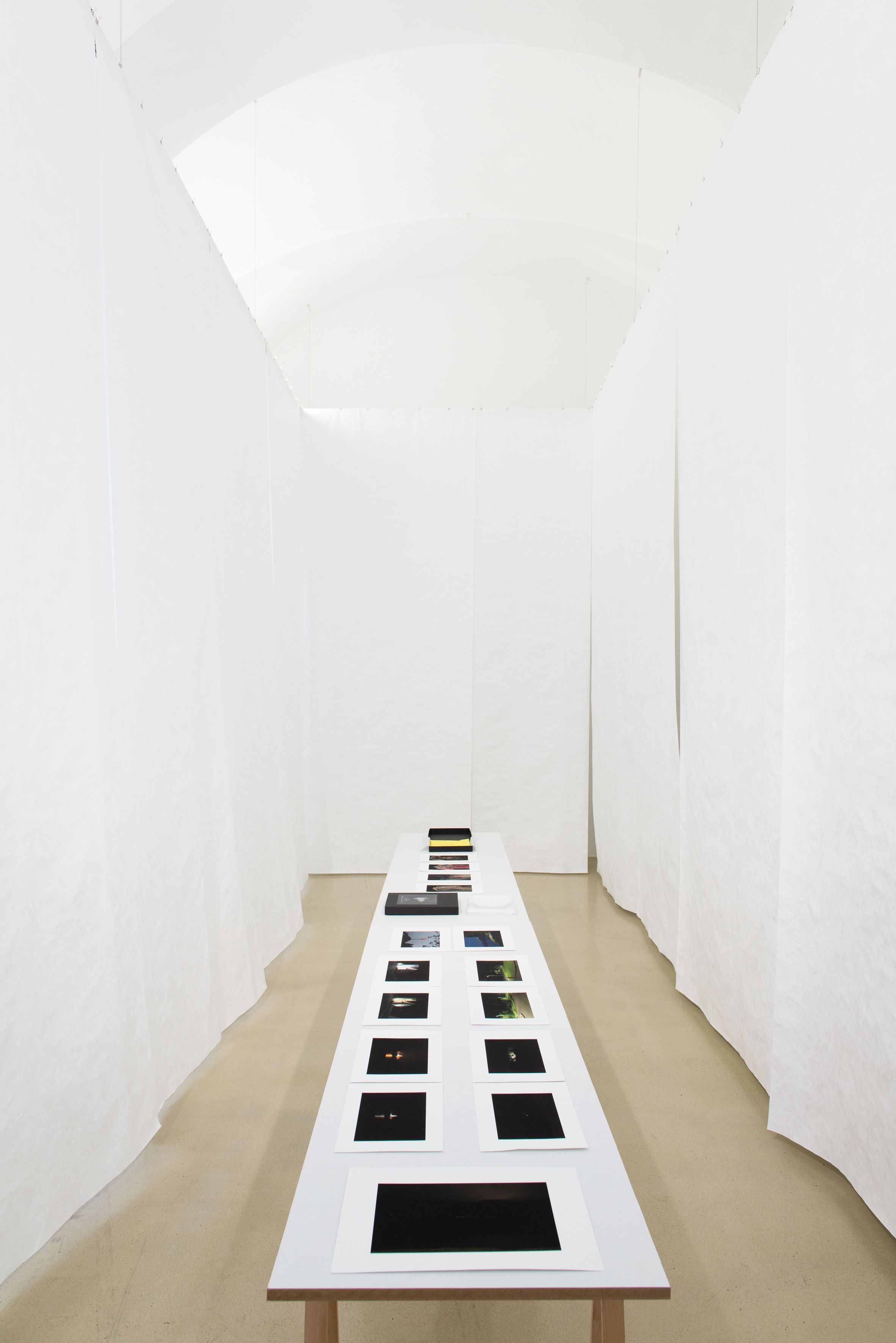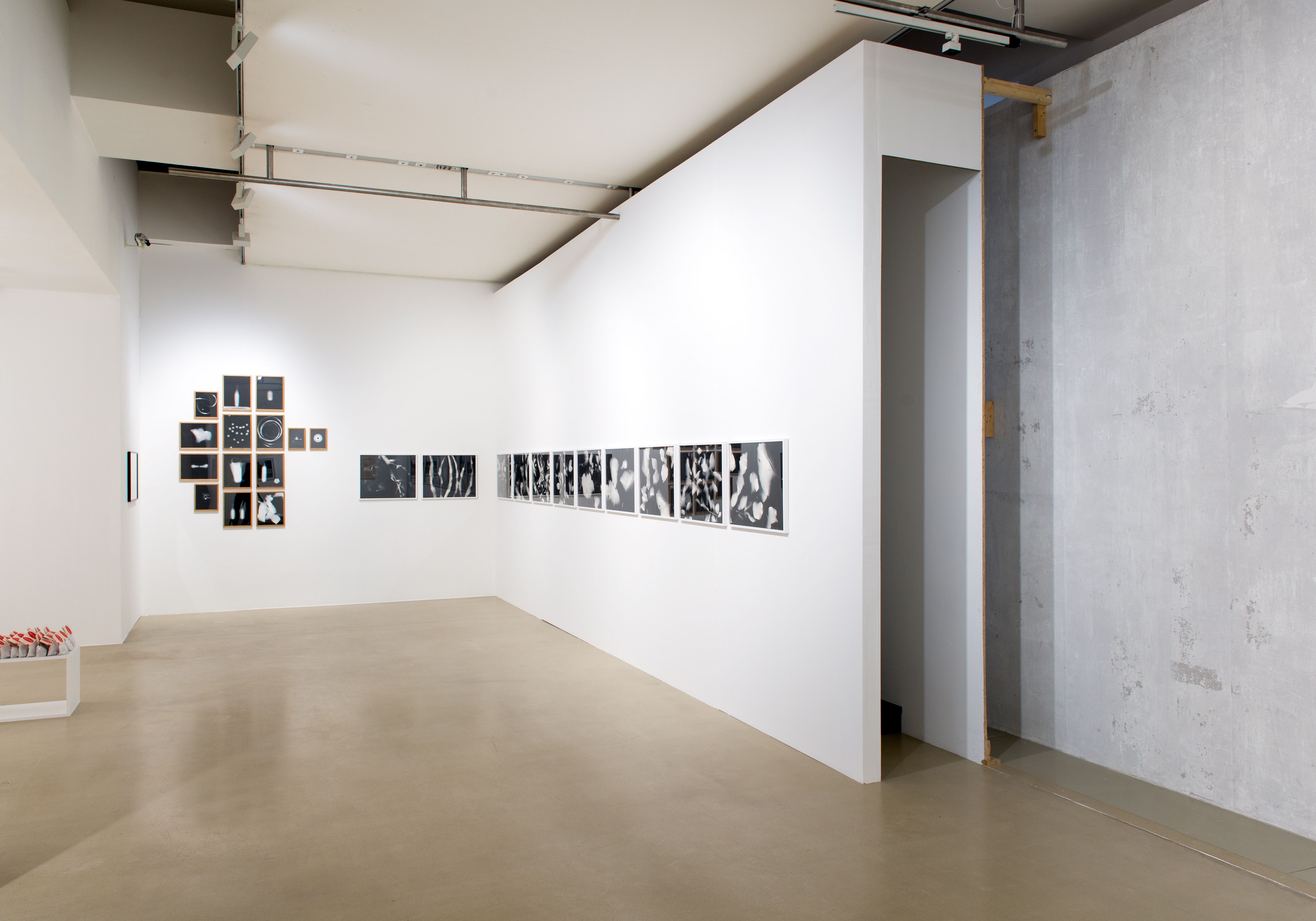 Beatrix Bakondy präsentiert Bildwelten mit dem Titel Aerosole und Galaxien . Die Arbeiten scheinen beim ersten Blick Fotografien zu sein. Doch sie sind de facto Skulpturen. Geschaffen wurden sie mittels technischer Aoerosole, also einem Gemisch aus festen und flüssigen Schwebeteilchen und einem Gas. Es sind Sprayarbeiten, die mittels Auftrag von Farbströmen auf reale dreidimensionale Objekte räumliche Schatten auf das Papier werfen. Der Raum, den ein Objekt einnimmt, wird sichtbar gemacht. Die beiden Werkgruppen handeln von Objekten unterschiedlicher Welten.