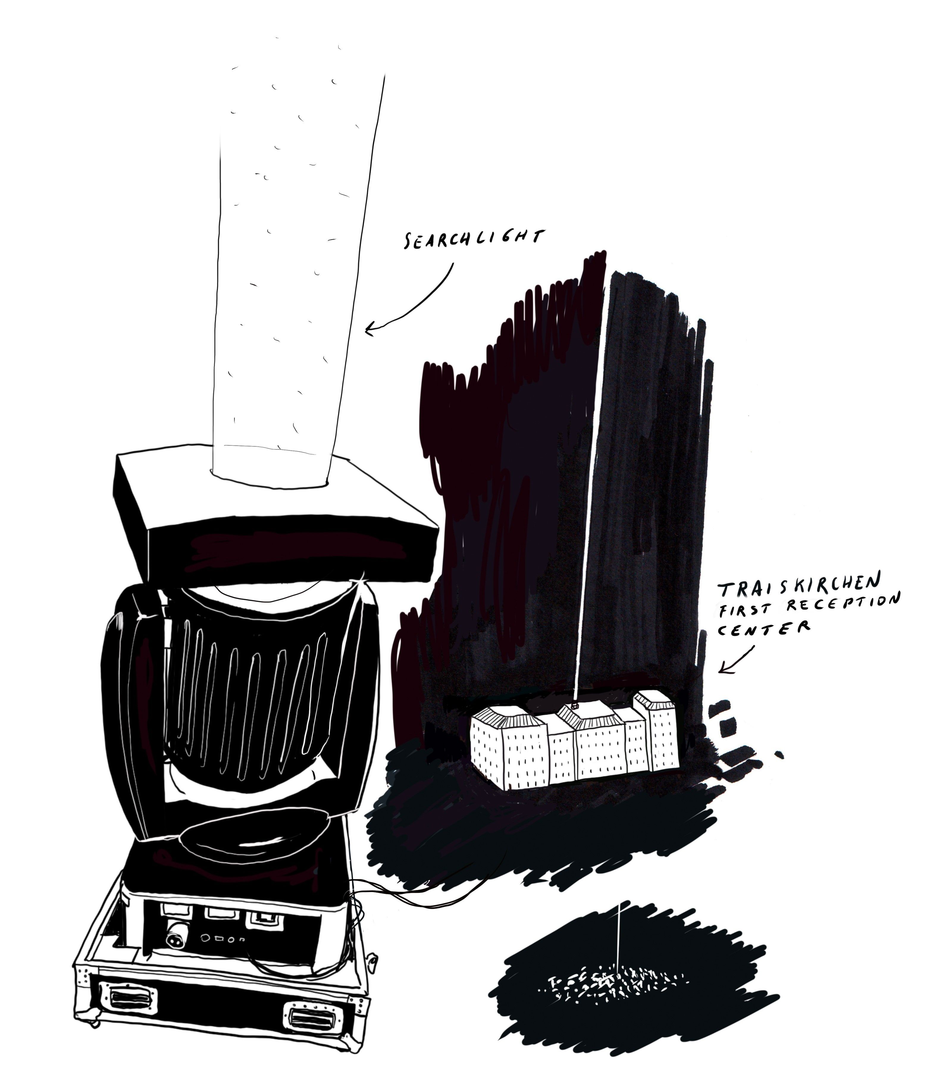 Aldo Giannotti places a simple mark, a point of light, in Traiskirchen near the reception center for refugees. It is a column of light that can be seen from afar that aims to raise the visibility of people who are in a situation that is all too often overlooked.