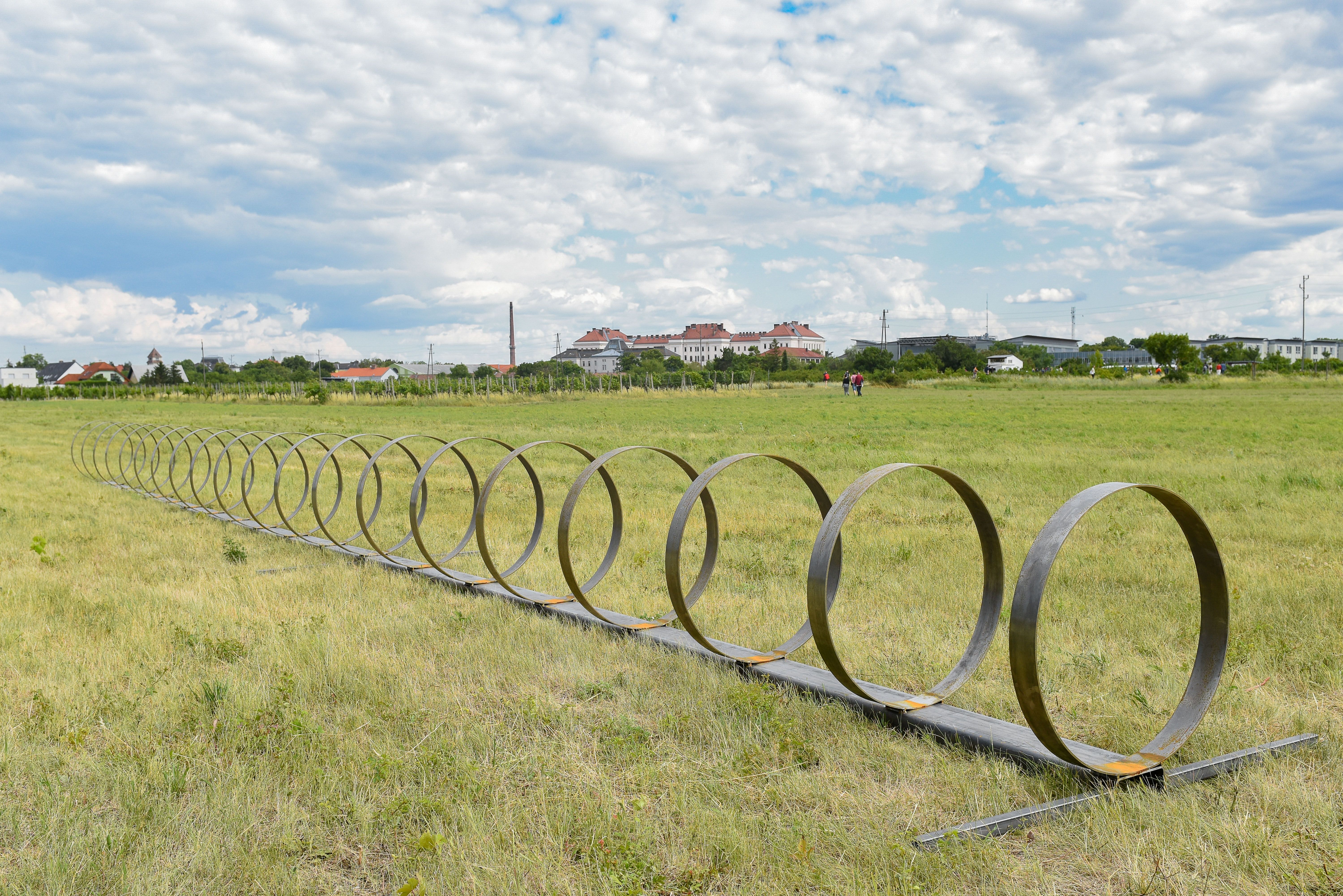 Steel Rings is a sculpture that reproduces segments of this now retired pipeline. Each segment has the same diameter and is made of the same material as the original pipeline. Each ring represents a kilometer of the original and is marked with the latitude and longitude of the original location. In Traiskirchen, Tabet is presenting a segment about twenty meters long from the Golan Heights.