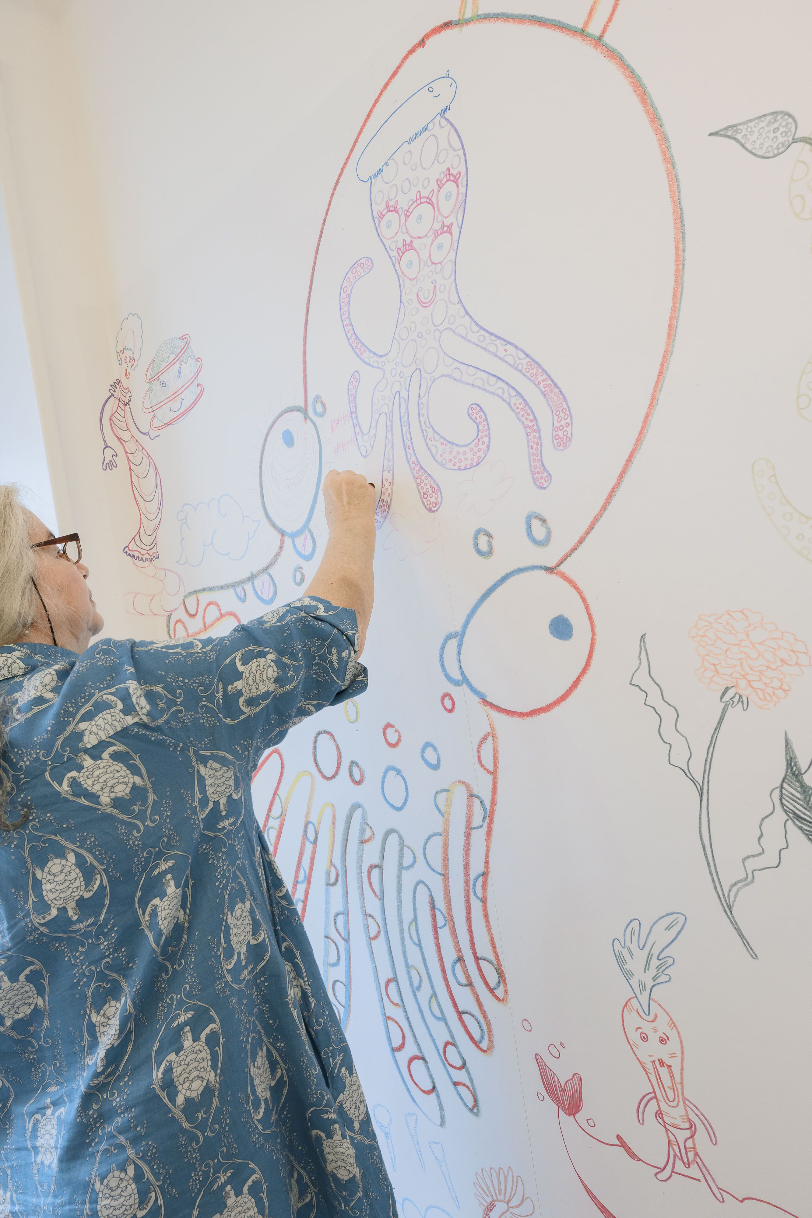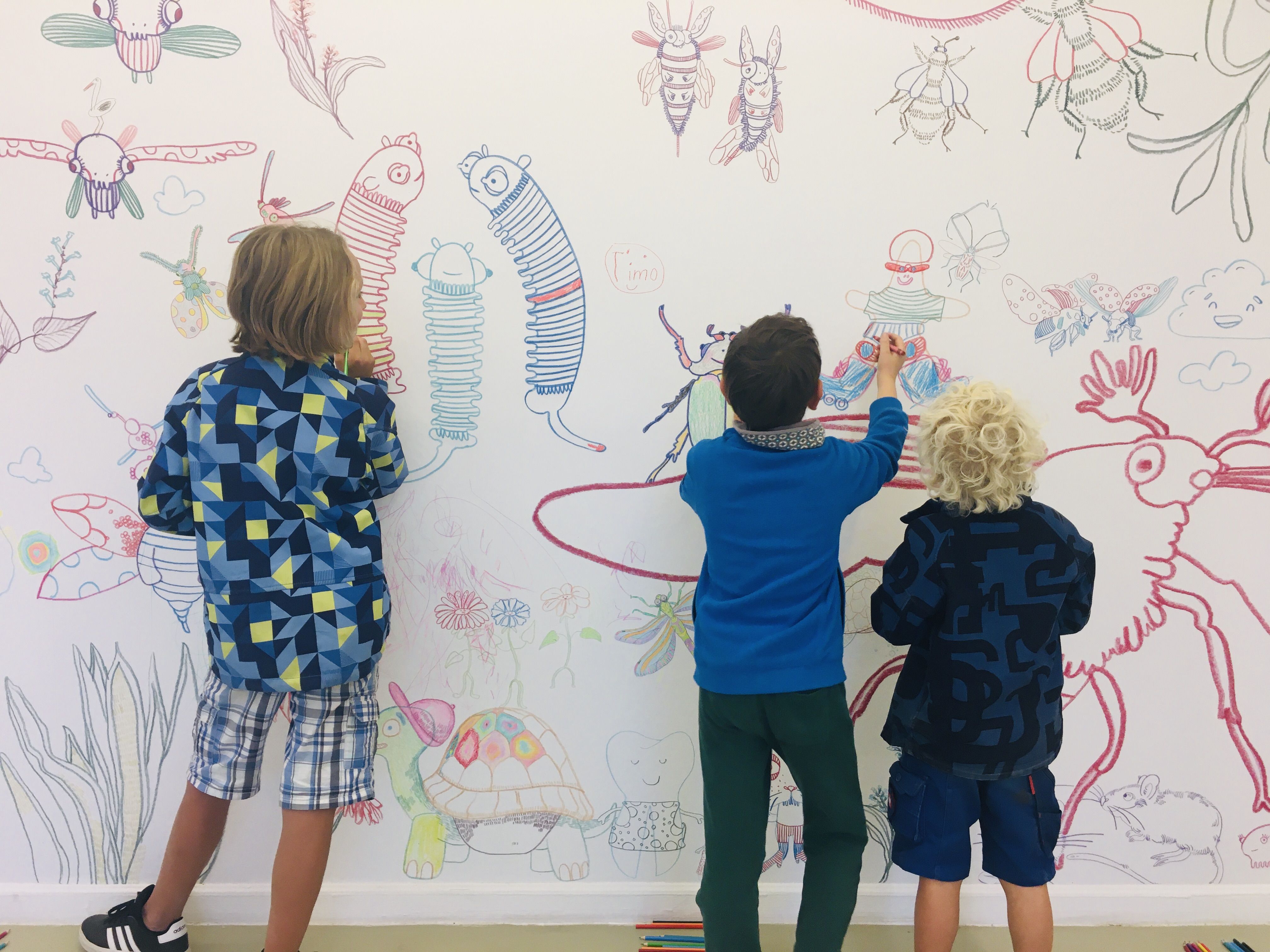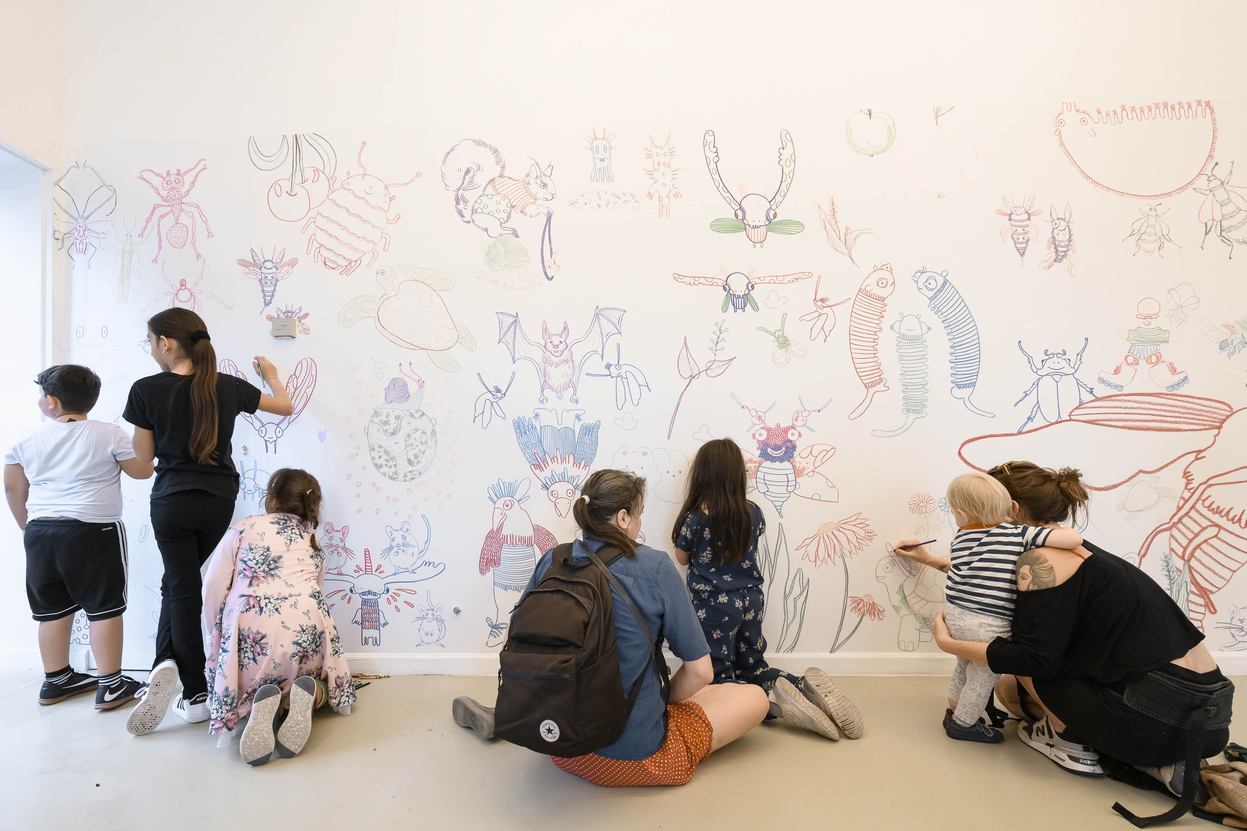 Teilhabe spielt auch für das zweite Projekt 2023 im Kunstraum Weikendorf eine zentrale Rolle. Robert Gabris und Theodor Moise laden uns ein, in eine imaginierte, fabelhafte Welt einzutauchen. An den drei Wänden des Kunstraums schweben, wandern und verwurzeln sich bunt gezeichnete Silhouetten von Tieren, Mischwesen, Pflanzen, organischen Formen über und in die Fläche des Papiers. An die 200 äußerst detailliert wie liebevoll gestaltete Zeichnungen wurden von den beiden Künstlern für das Projekt angefertigt. Dabei haben sie sich selbst die Vorgabe gemacht, möglichst keinen Vorgaben zu folgen, um diese phantastische Welt so frei wie möglich und ohne Beschränkungen, die unseren Alltag regeln oder begrenzen, zum Leben erwecken zu können.
