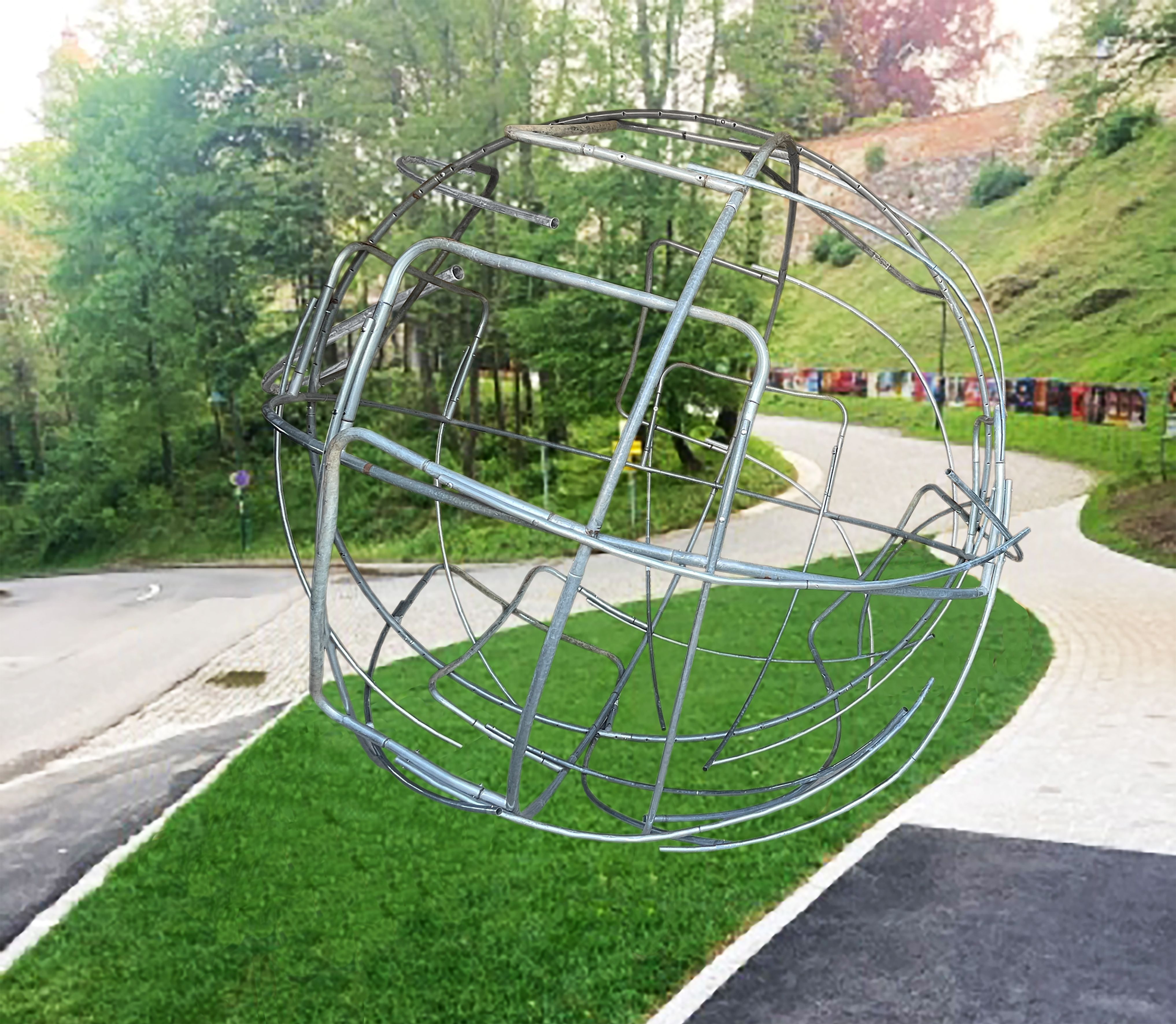 Hiesleitner’s Steppenroller (Tumbleweed) is a group of collages made of the metal rods taken from discarded trampolines, pieces of silage film, and wire mesh fences: materials that define the appearance of the immediate surroundings. The artist translates natural tumbleweeds into mobile “mechanical Renaissance plants” that refer to our individual behavior as consumers as well as what consequences this can have. Our prosperity today is based on the intensive use of nature, and its exploitation has effects on people and the environment all over the world. The tumbleweeds remind us that global interrelations, capitalism, and colonialization began during the Renaissance. They invite us to reflect on our treatment of nature and the traces we leave in it.
