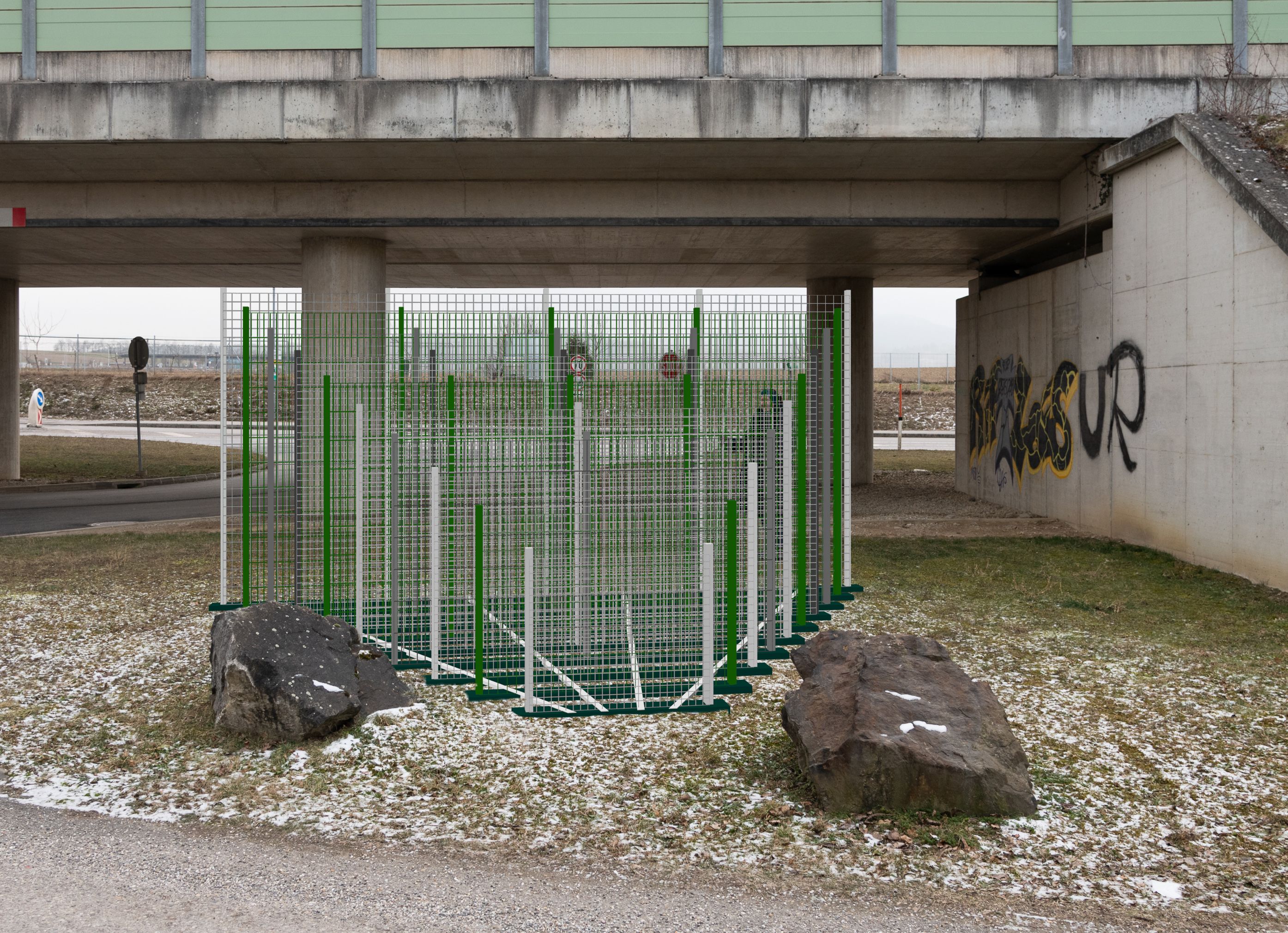 A house, a car port, a lawn—and a fence all around it: If we look at the Austrian cultural landscape, we will find us locked in a pattern of living that is defined by capitalism. When humans as individuals became the main focus for the first time about 500 years ago, they began to distinguish themselves in their role as highly motivated administrators of their own (small) happiness. As personal property, colonization, and global conquest spurred the ambition of individuals, what was conquered had to be demarcated. Linear perspective can be understood as a visual translation of this process of individualization. The work refers to the technique of rendering perspective using a grid. Leon Battista Alberti explained this for the first time in his treatise De Pictura (1435) as a means to represent space on a two-dimensional surface by focusing on a vanishing point.