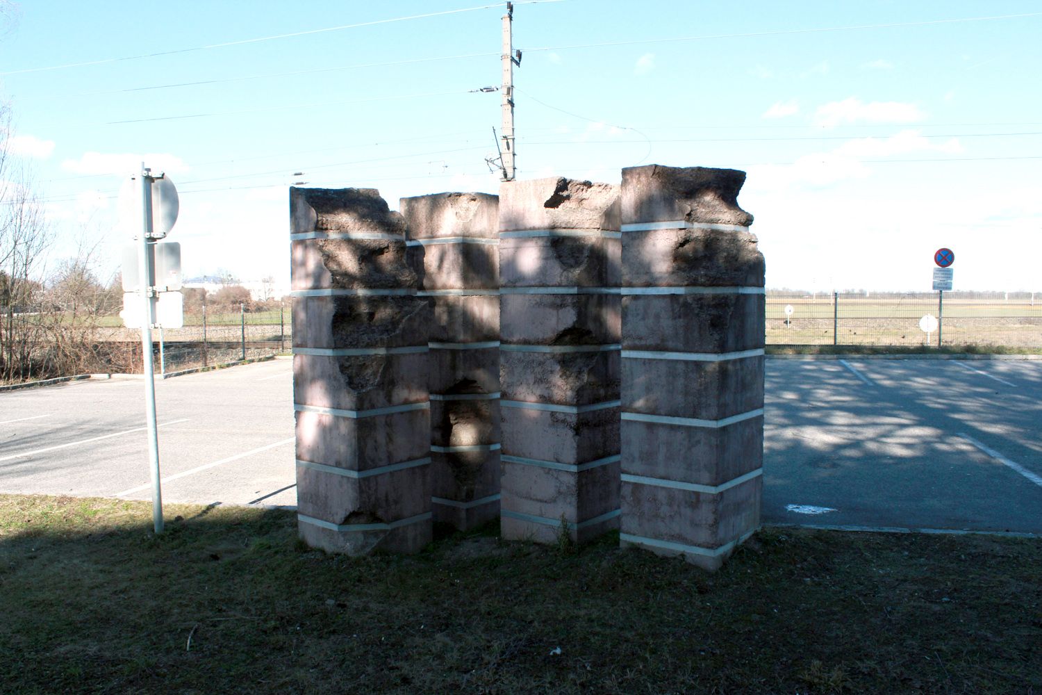 The sculptural group E4 + W4 consists of a total of 8 pillar-like objects, of which 4 (E4) have been installed near the school in Ebenfurth, and a further 4 (W4) opposite the Military Academy in Wiener Neustadt. In Ebenfurth the pillars are arranged equally spaced from one another in an L-shape. In Wiener Neustadt the group stands symmetrically on a base, an aluminium cross. The size, dimensions and form of the pillars have been designed for the two different locations. Each object is 240cm high and has floor plan of a square 60cm. More than life-size in height, it still does not create a monumental effect. The artist suggests a division into individual segments, layers these one on top of the other and formally cuts through the artificial stone with metal bands. The pillars bear visible signs of destruction, although these have been artificially imitated and do not correspond to any real decay of the material: artificial erosion as a sign of transience, symbol of the ruins of a city. Ljubomir Levacic has dealt with the subject of 'pillars' in a wide range of variations. Pillars as bodies, as human structure. The pillar in its relationship to nature, to human beings. Formally, he is interested in classical beauty and proportions, the pillar as a simple edifice, its aesthetics and history. Pillars that have survived as a fragment, including the remains of great and archaic edifices. Witnesses of their time and undisplaceable signs in a square.