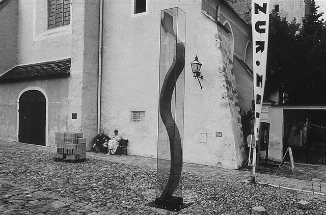A square in a city is primarily something static, a goal, a destination point, yet on the other hand it is also a place of communication, i.e. of movement. The inner part of my sculpture is like a snapshot of movement. Just as the sculpture becomes part of the square, so the surroundings become part of the sculpture by means of reflections in the glass surface of the sculpture. The sculpture stands in relation to the space surrounding it and creates negative spaces. In the same way, the sculpture contains negative spaces within itself with which the surroundings (passers-by) have to form a relationship. The exact standpoint in Minoritenplatz resulted from a gash in the paving of the square, which has been closed by setting up the sculpture there.