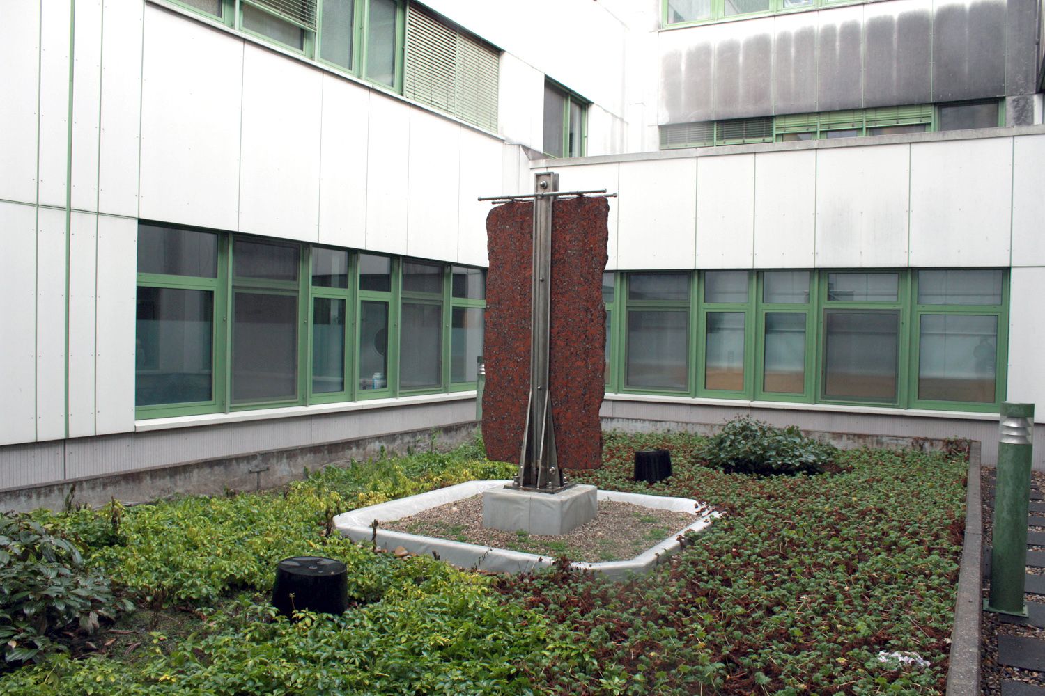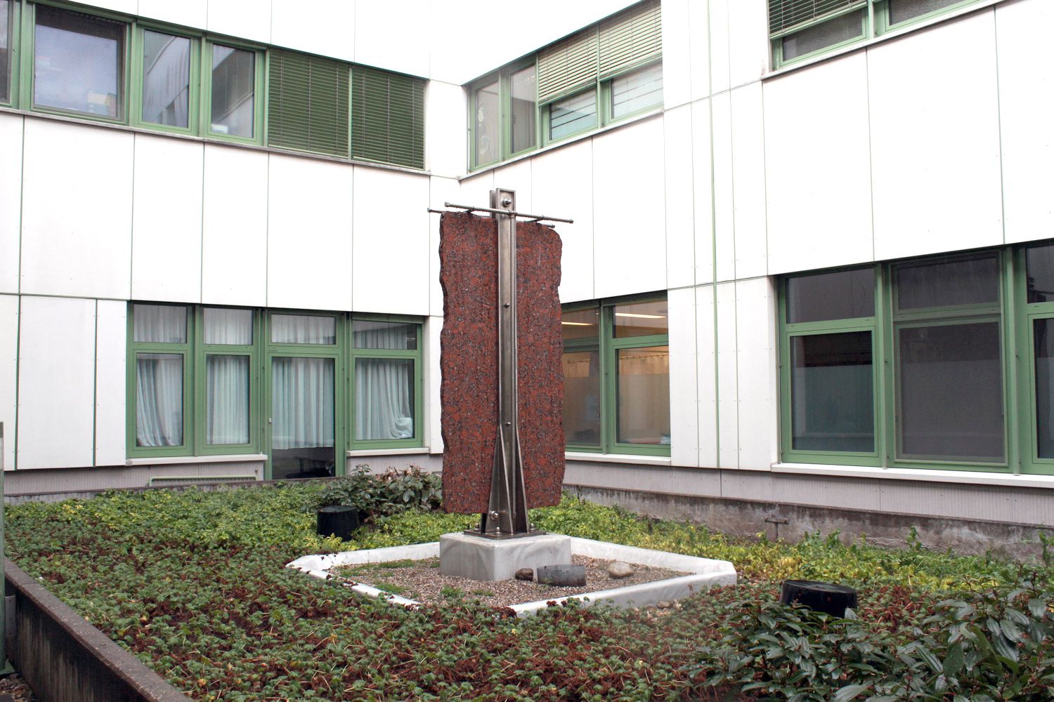 Fountain in the courtyard: A vertical slab of granite (coral red) held by an upright (stainless steel) has water trickling down both sides. The upright and the visible pipe are design elements of equal value.