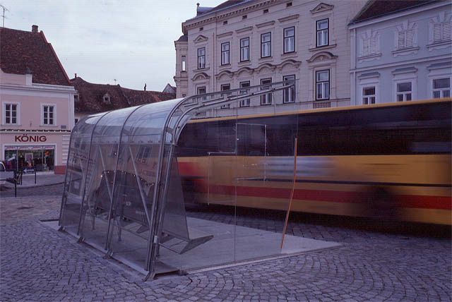 Construction: Section tubes, spacers and flat bar steel to carry the glass form an overall support system - the height of the spacers corresponds to the static stress at the respective site (a higher distance between girders and flat steel in the area of curvature to absorb the flexion moment, lower overall girder height around straight ends). The girders' partition in the vertical area and their V-shaped arrangement produce a spatial column base so that a rigid fixation of the girders is not required. This makes foundation work easier and also permits the construction of elegant base points. In the "outer shell" (glazing), the back wall and the roof consist of clear safety glass, mounted lengthwise, with horizontal cross joints (no section covers) and stainless metal clamp ledges, with curved glass elements between the back wall and the roof. The side glazing on the (western) weather side serves as an "information carrier" with a map and brief history of the town; the panes are mounted along the roof girder with ground rails and single-spot fixtures. In the "inner shell", translucent stainless metal nets (woven from wires in a textile-like fashion) are mounted into the construction as prefabricated elements, constituting a second layer which not only serves as a protection against glass falling off and as a sunshade on the ceiling (sky), but also forms the bench and its back wall.