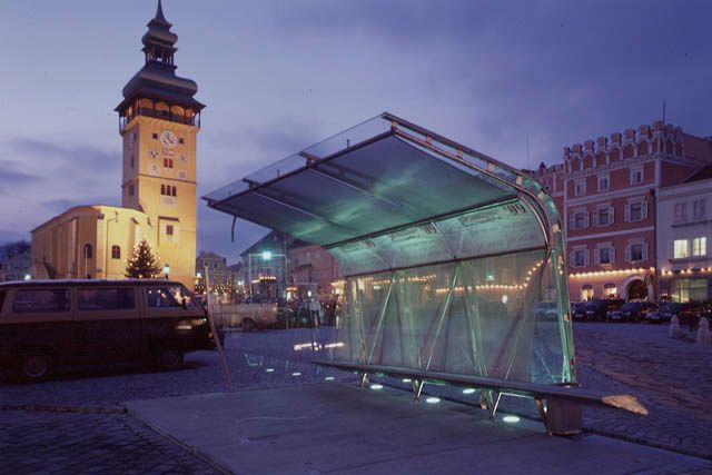 The box is constructed out of section tubes, spacers and flat bar steel to carry the glass form an overall support system. The side serves as an "information carrier" with a map and brief history of the town. In the "inner shell", translucent stainless metal nets serve as a sunshade on the ceiling, but also form the bench and its back wall.