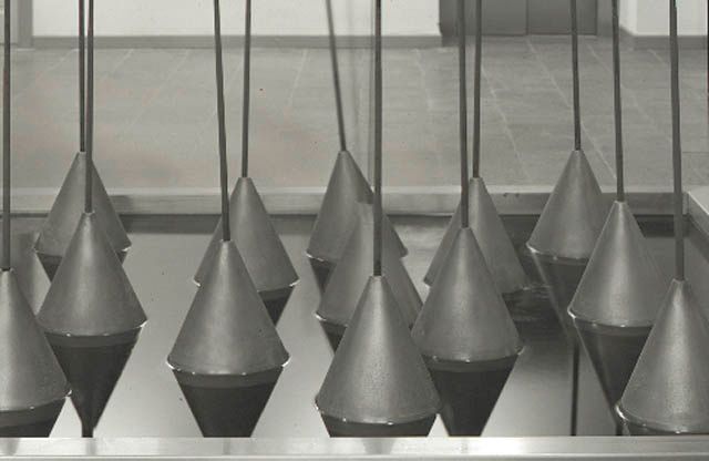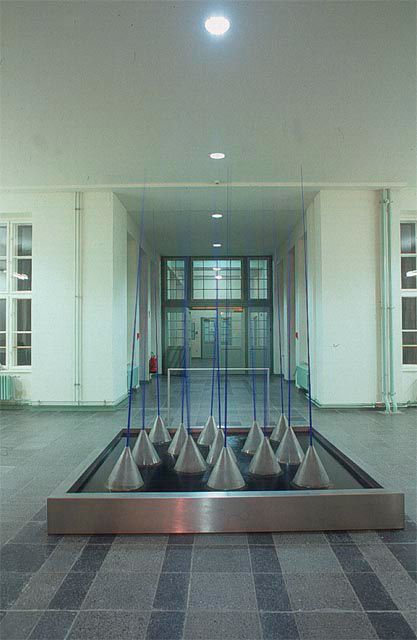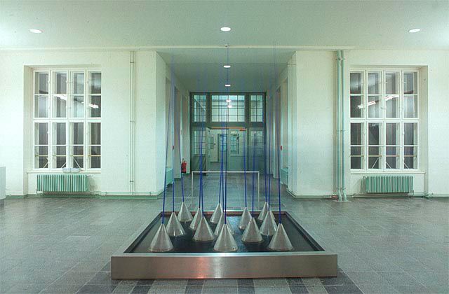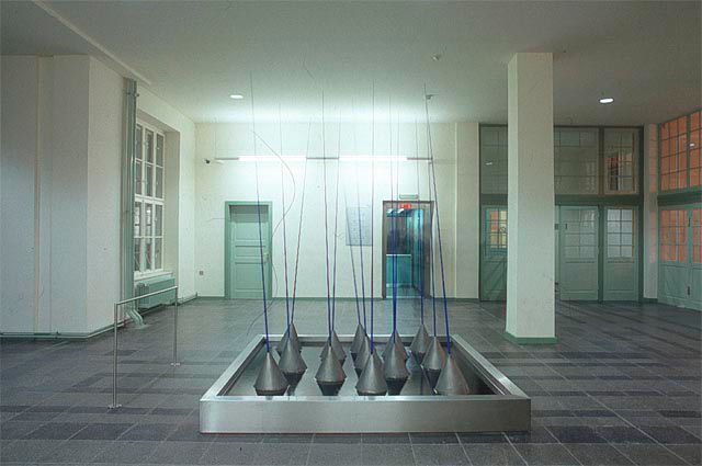The fountain in the entrance area of the Donau-Universität is also a hydro-pneumatic object. 13 stainless steel cones in the steel basin are linked to the cellar via an air pump. Movement sensors triggered off by passers-by set-off the pumps that move the steel cones, to which blue fishing rods have been attached.