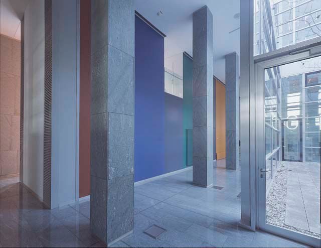 The colour scheme by Oskar Putz is the result of an analysis of the architecture, which forms its basis as well as the support but does not provide the overall framework for his concept. The rectangular coloured surfaces are essential autonomous constructions that alter the space and structure it. This applies both to the interior and to the façade, whereby Oskar Putz is also responsible for the colour scheme concept for the buildings of the Regierungsviertel.