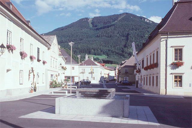 The fountain at the center and the drinking fountain at the bottom of the market square at Ybbsitz are made in a reduced and clear design using Herschenberg granite.