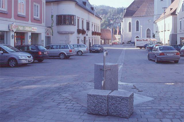 During the reconstruction of the market square traffic was reorganised, the square itself was resurfaced. Sepp Auer's work in the framework of this overall concept focused on a fountain at the centre and a smaller drinking fountain at the bottom of the square. The fountain made of Herschenberg granite has been positioned along the square's longitudinal axis. It has a surface area of 3.4m x 3.4m and the basin stand 80cm high. At the centre of the fountain there is an upside down pyramid of steps which forms a separate basin rising above the rim of the fountain. Water runs from the upper to the lower basin, turning into a sheet of water which can be lit from inside the fountain. At the other end of the longitudinal axis, indicated by a narrow granite gully, there is a drinking fountain (40cm x 40cm x 80cm) also made of Herschenberg granite.