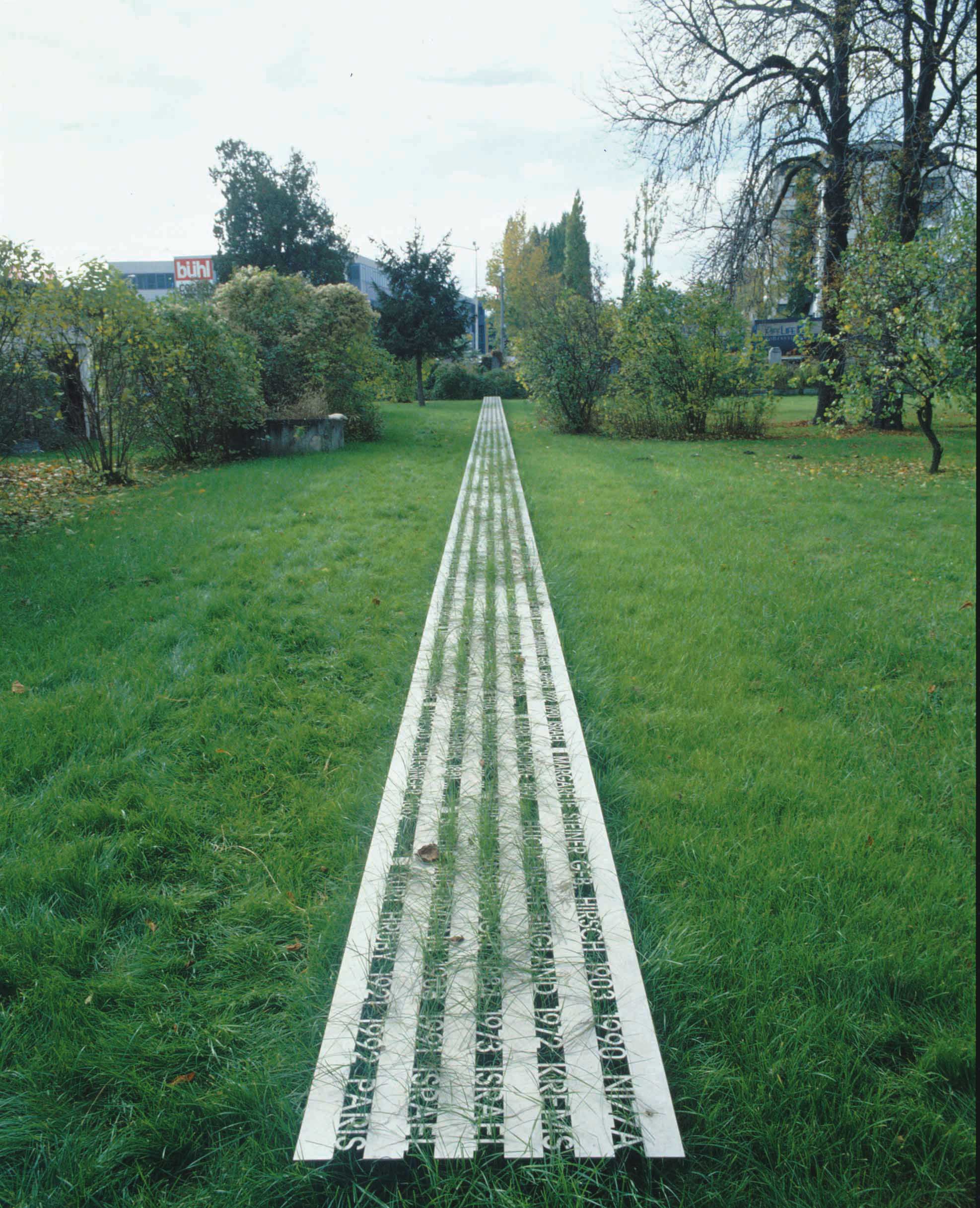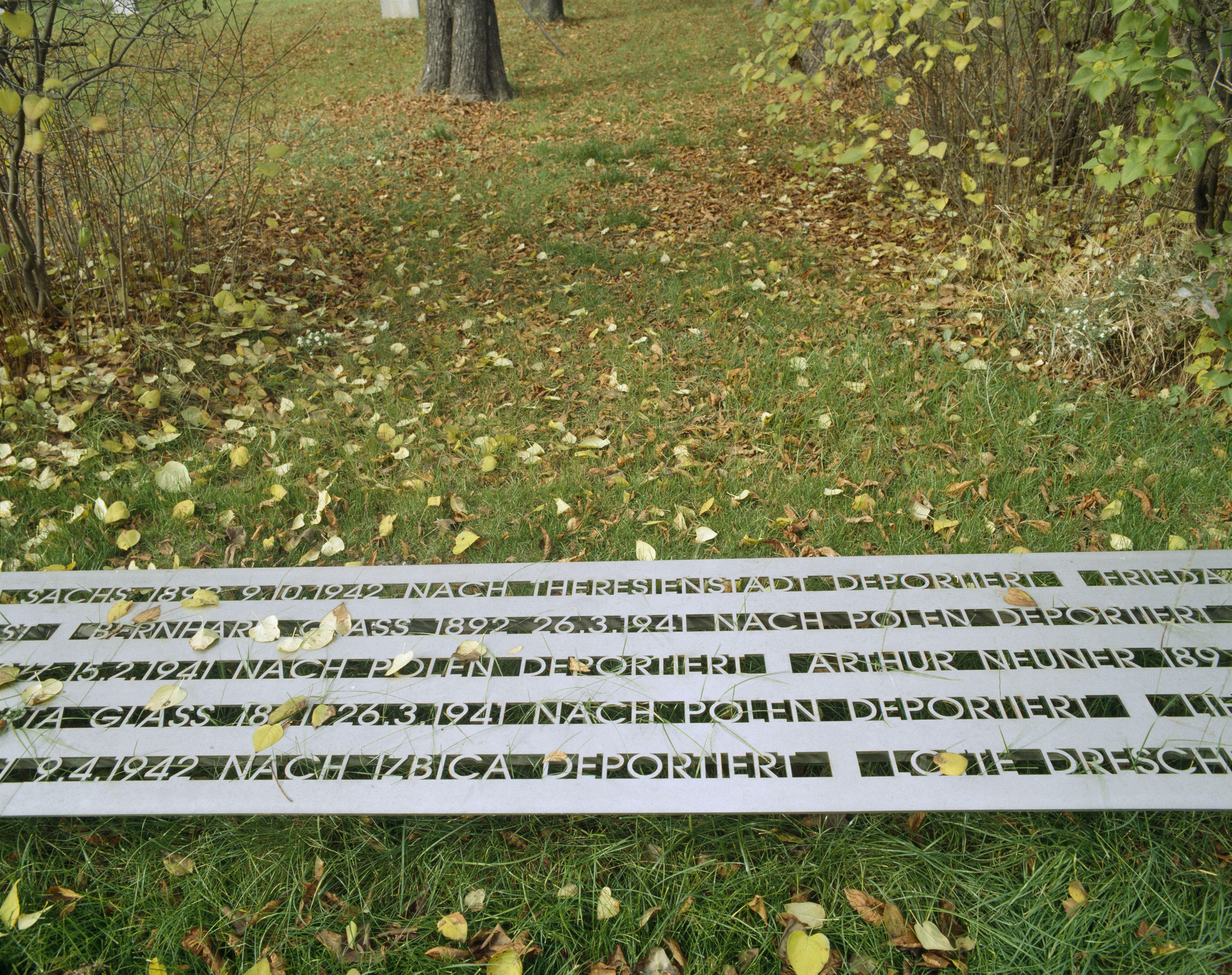 The artist has installed a 48m long band of steel in the entrance zone of the Jewish Cemetery in Krems. The names and dates of 129 persecuted and deceased Jewish residents of Krems have been carved into the steel.