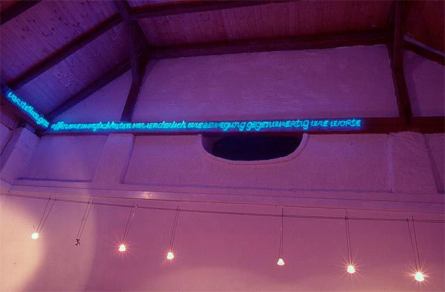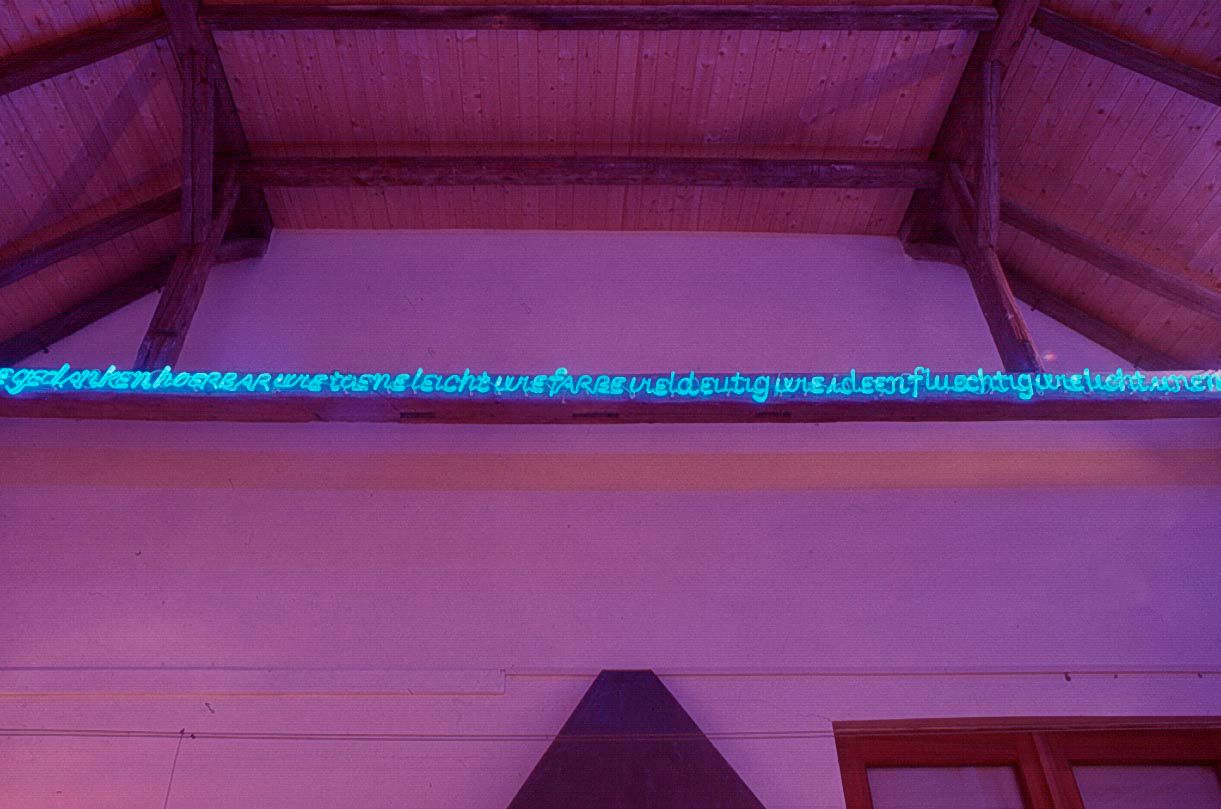 While looking for a suitable location for his work in Loosdorf Maurizio Nannucci opted for the Kulturhaus Winkelau. Its one corner room ñ situated on the side towards the guesthouse or the sculpture garden ñ struck him as suitable for this purpose since it is relatively high and the traverses seemed to work as supporting elements of an illuminated text strip. Moreover, thanks to the windows and a separate entrance door there seemed to be a way to establish a link between the outdoor space and the inside. The bluely illuminated text can be clearly recognized by drivers coming from the direction of Frättingsdorf as a sign; it also radiates into the courtyard of the Kulturhaus. Here it is always on view through a newly installed glass door (design: Walter Kirpicsenko). Maurizio Nannucci has selected the following text for a text running along the four walls: