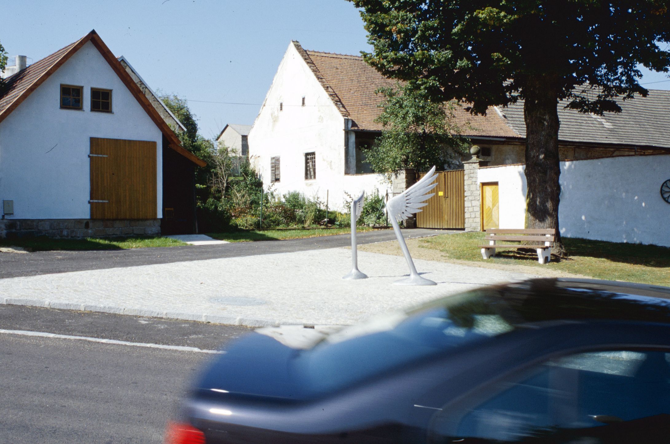 In the course of the redesign of the centre of Eisgarn the artist ANA won the competition for the artistic redesign of the square next to Stift Eisgarn, which was founded in 1330. As well as the redesign of the square, the brief was for a memorial to its founder, Johann von Klingenberg. Von Klingenberg's enormous significance for the monastery and the community lies not least in his vision, which was to combine spiritual guidance and culture. The initial basis was not simple. There was neither an illustration of the founder nor a description of his appearance to work from, and the square to be redesigned looked like a casually forgotten peak on the side of the road. The artist unified the gently downward sloping square with paving stones and designed a memorial where the person being commemorated was omitted and their memory left to the imagination of the viewer. Two 1.8 metre high, sketch-like abstract wings of cast aluminium leave space between them for the imagination. With these wings ANA has found a synonym for intellectual freedom and the integration of new and individual spaces. She did not want here to make the founder of the monastery into an angel. Instead the wings are more of a symbol for faith as a universal force. The memorial is an abstraction without being abstract to the extent that the absent is given a symbolic framework, not presuming to play on memory but to evoke it.