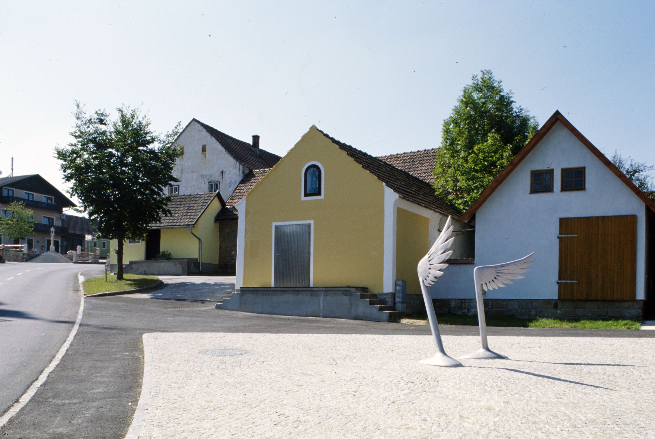 The artist ANA has redesigned the square next to Stift Eisgarn, which was founded in 1330 in the Waldviertel, and designed a monument to commemorate the founder of the monastery. The memorial consists of two abstract wings 1.8 metres high and made of cast aluminium. The square has been covered homogenously with paving stones.