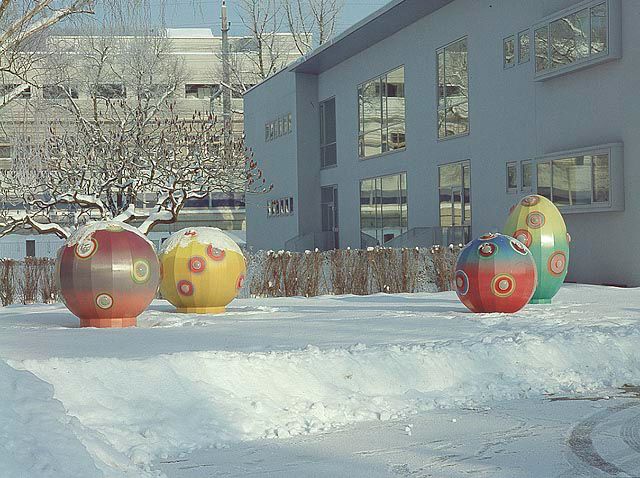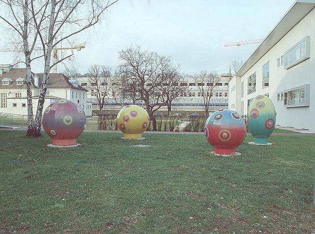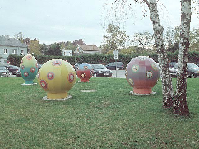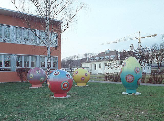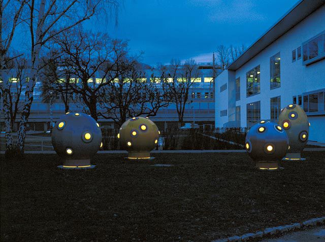 The second project completed by Irene and Christine Hohenbüchler for Lower Austria was also planned for a school. Whereas in 1998 together with the children they redesigned an area of the schoolhouse in Pulkau, in Amstetten the aim was to place a sign that would create an identity for the two buildings of the polytechnical school and the special school that lie next to each other. In working with children and also with psychiatric patients or prisoners a kind of 'multiple authorship' develops in which the artists adopt the role of a director or mediator. The result is works very different to the 'masterpieces' generally encountered in the market-oriented art business. Rather than serving the cult of the genius one of the Hohenbüchlers' starting points is to discover peoples' creative potential by taking a different approach. The four light globes that now connect the two buildings are derived from primary design principles and are suited to the needs and methods of perception of the pupils of different ages from six to fifteen. The four steel spheres of different sizes with a circular ornament have round openings at the centre for the light. They seem to have landed on the lawn between the two buildings like unidentified flying objects: cheerful colourful symbols that begin to glow in the evening.