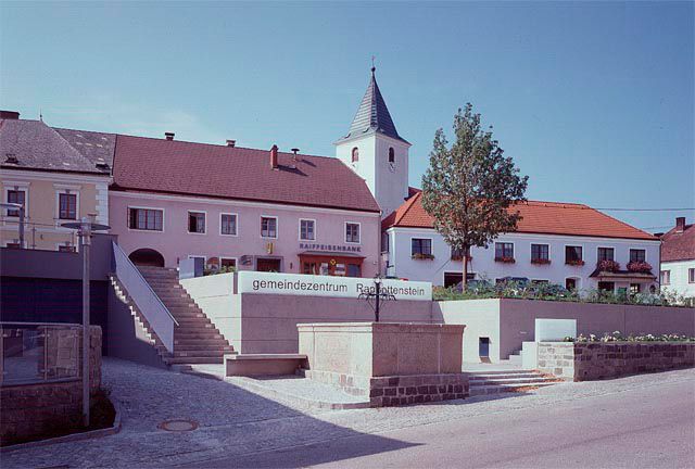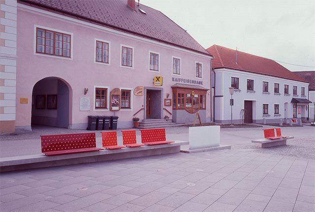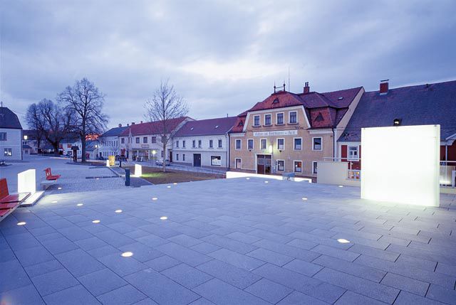The architect Ortrun Lanzner developed her concept for the design of the marketplace in Rappottenstein from the topographical situation and the existing lines, materials and elements. A succession of fixed surfaces with different spatial and functional qualities were arrived at in a two-year planning process in close collaboration with the community. The artistic concept consists of a band of sand-blasted concrete that links the existing furniture of the square, the fountain, the pillory and the main stairs. Several concrete objects border the granite surfaces of the upper square and Brunnenplatz (where the fountain stands), formulated differently according to requirements: as seating, as steps or as pedestals for translucent glass objects which make a setting of the square. On the surface of the square Ortrun Lanzner installed integrated screen-printed floor lighting with images that relate to the history and surroundings of Rappottenstein. With these somewhat distorted images Lanzner illustrates the square in front of the town hall with places from the administrative region. The various light bodies create a fascinating and very carefully placed play of light, introducing a strong atmospheric quality to the dark Waldviertel nights.