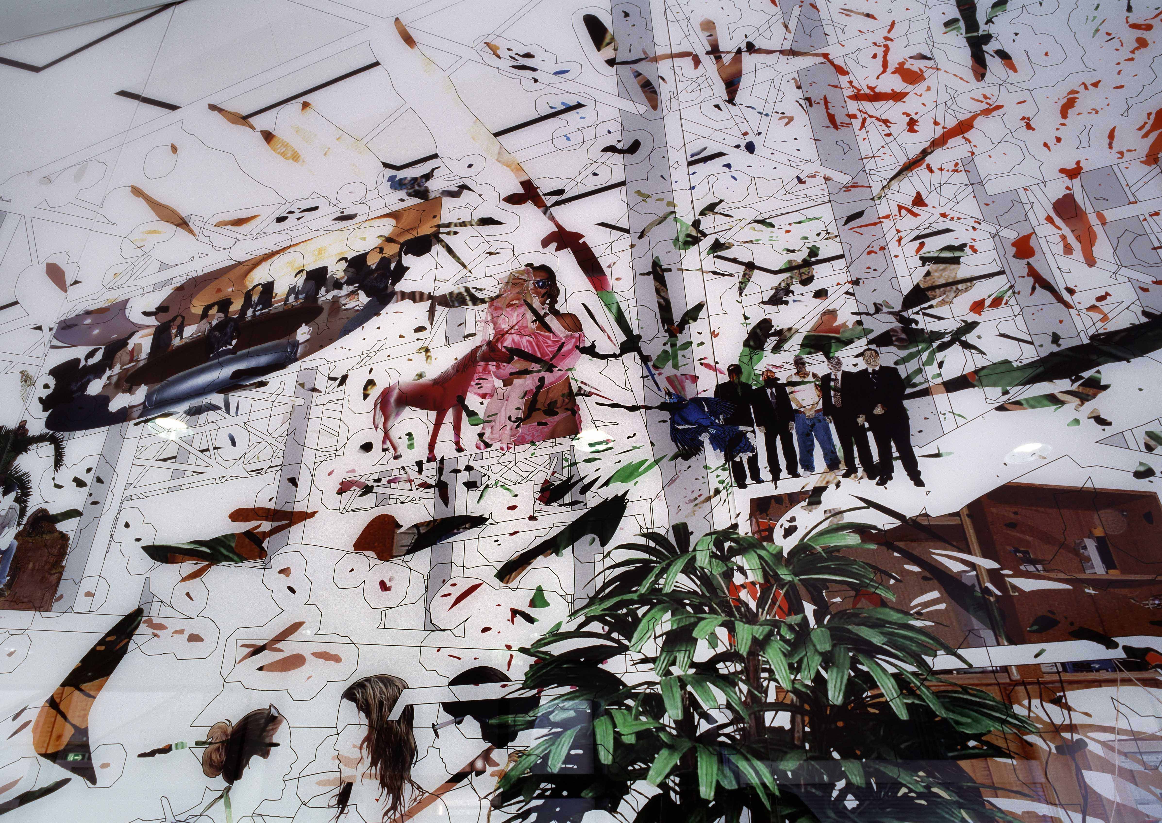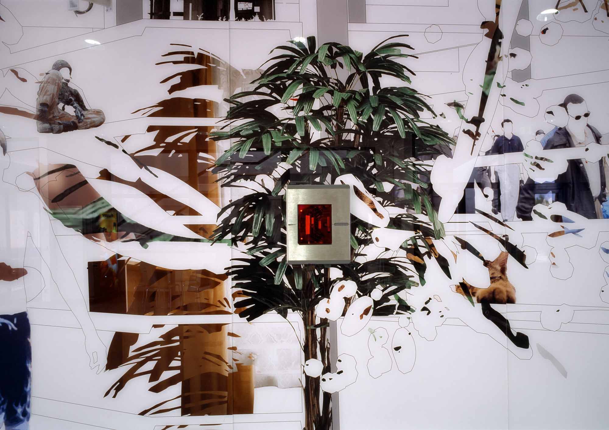 It is probably not easy to reach pupils of a vocational college with in-house art. For their proposal Susanne Schuda and Florian Schmeiser chose neither a decorative nor a functionalist approach, where the art would have provided a service. Their project is based on a profound consideration of the context. The resulting object has been provided for the pupils at Theresienfeld to use, and they even have a certain amount of creative freedom. Trade is central to the curriculum at the college. The EAN (European Article Numbering) or barcode provides the core for the optimisation of the flow of all data and goods between the retailer and the manufacturer. It stands for security, organisation, traceability and control – in contrast to the ubiquitous reigning chaos, i.e. seen in the fact that one does not know where something comes from or what exactly is inside it. Schuda/Schmeiser hung two images showing a perspective view of a supermarket. This supermarket is filled with images that alternate between confusion and order. When the barcode of any product is passed over an integrated supermarket scanner in the image, the series of numbers on it is translated into a succession of sounds. This 'order' is overlaid with parameters selected at random by a digital synthesizer, so each succession of numbers sounds completely different. And the sound produced by the same series of numbers is altered more each time it is scanned, becoming increasingly chaotic. Perhaps users with enough practise can still recognise goods by their sound, though. The scanner and the barcode comprise an 'intelligent instrument' capable of reflecting the principles of reality in the relationship between planned and random factors.