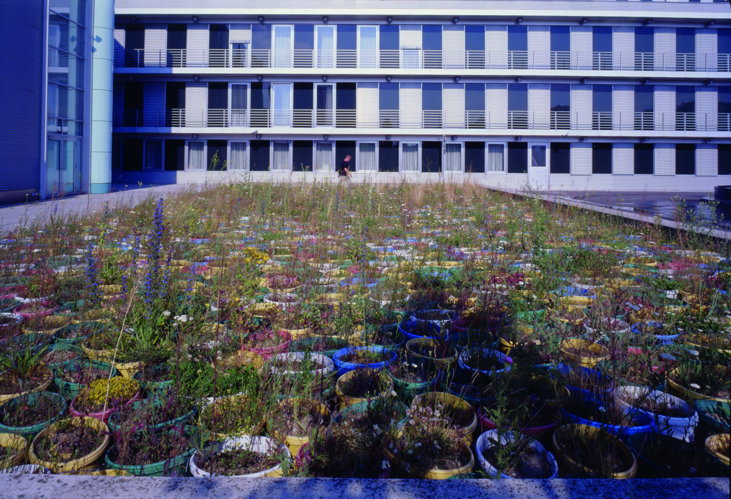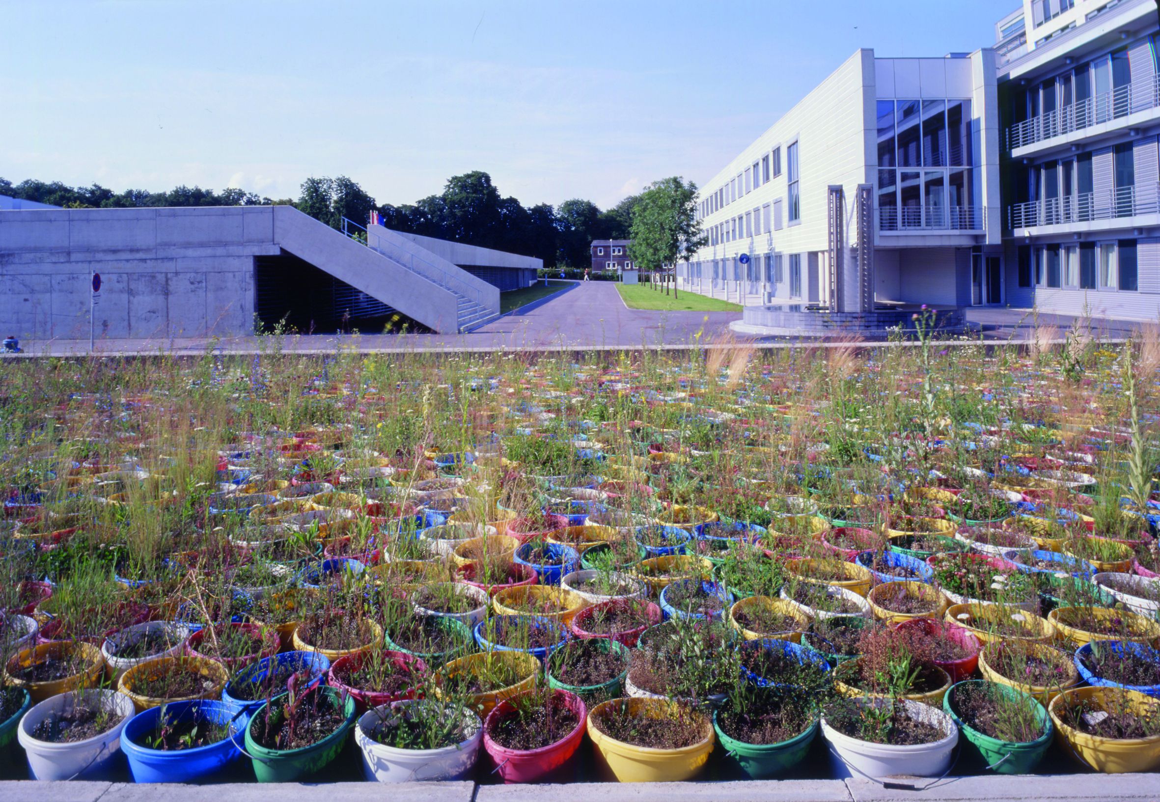Lois Weinberger selected a place to establish a plant reserve in the sculpture park of the Lower Austrian Landesmuseum. "The space intended as the garden is densely filled with colourful plastic containers. These are filled with soil / according to the pannonic space / the planting is left to the wind / the birds / the seeds already existing in the earth. 'With time' – seen as an integral aspect of time – the containers will dissolve, becoming visible only as colourful splitters on the solid – overgrown – flat surface. The shallow layer of soil on concrete regulates the height, and to some extent the type of vegetation itself – a work / which does not allow an idyllic place to come into being and which is constantly changing." (Lois Weinberger)