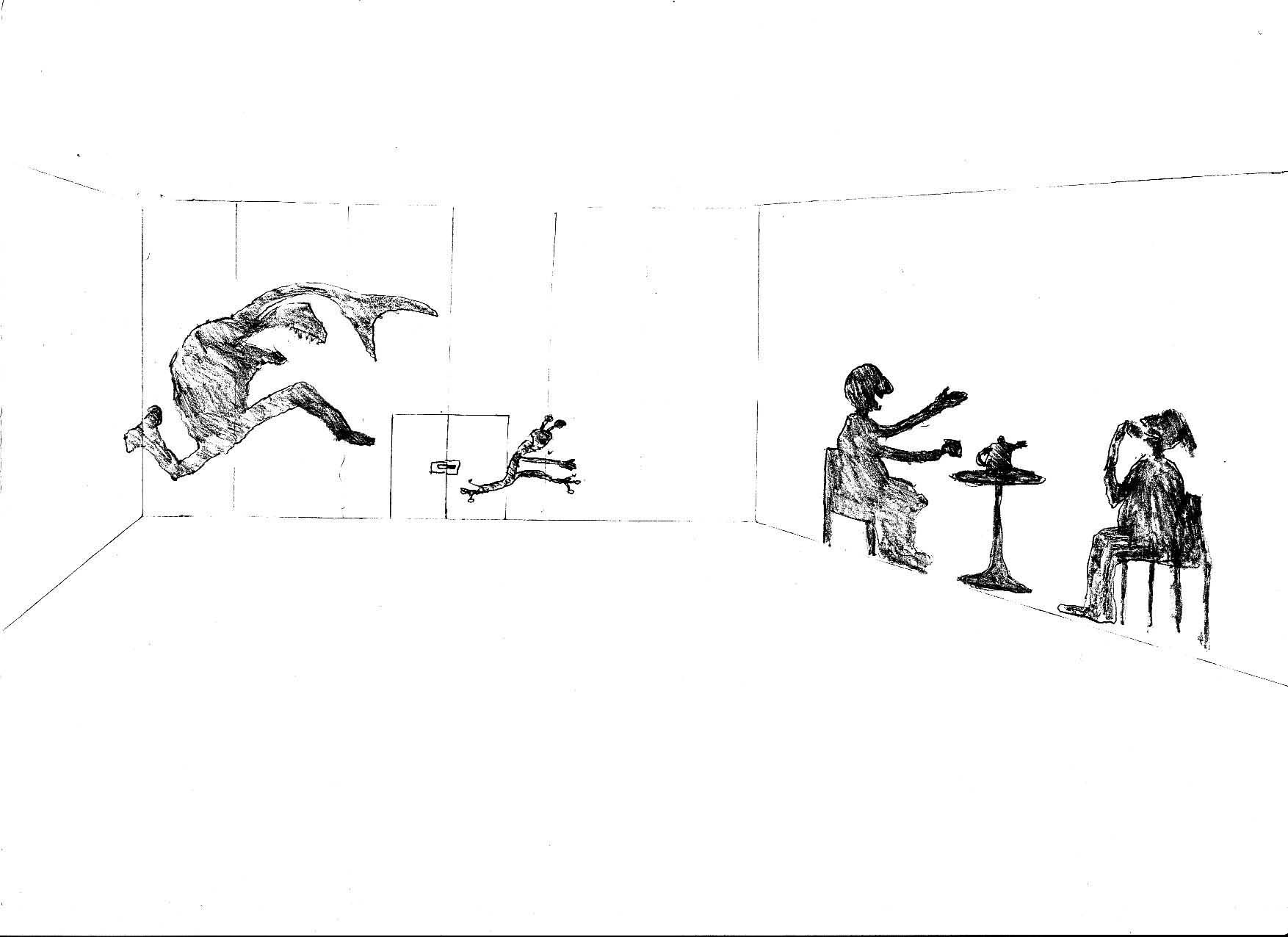 There was to be an overall artistic design for the Hochleithen community centre. This meant a change to both the interior and the outdoor space: pinboard magnetic dots form an abstract mosaic. Telephones are installed, chandeliers; black BMWs draw past the windows. The community centre forms a complex of buildings that ends in a Kafkaesque office situation where pinboard magnetic dots form a mosaic and industrial foam and small dark insects gain the upper hand. The office fittings then in flight, thrown out of four, or eight, windows and cleverly combined outside to make a fountain that rises above the building. A Russian situation becomes a space-filling art installation; afterwards the individual elements are combined outside to make a fountain slightly taller than the building. 50 monitors on which a fly's flight from the documentary series Universum is to be seen, colourful carpets, tents filled with haberdashery...
