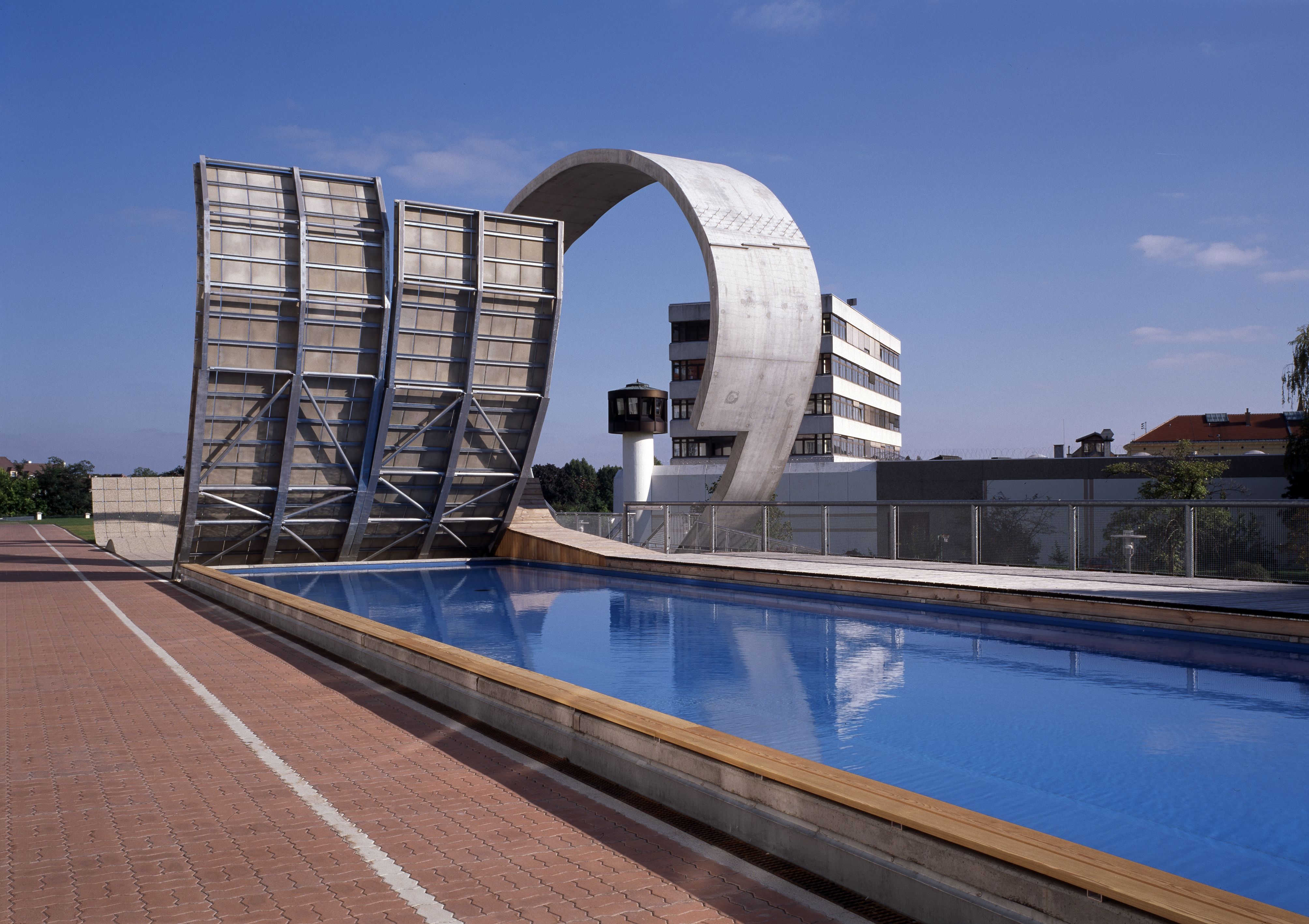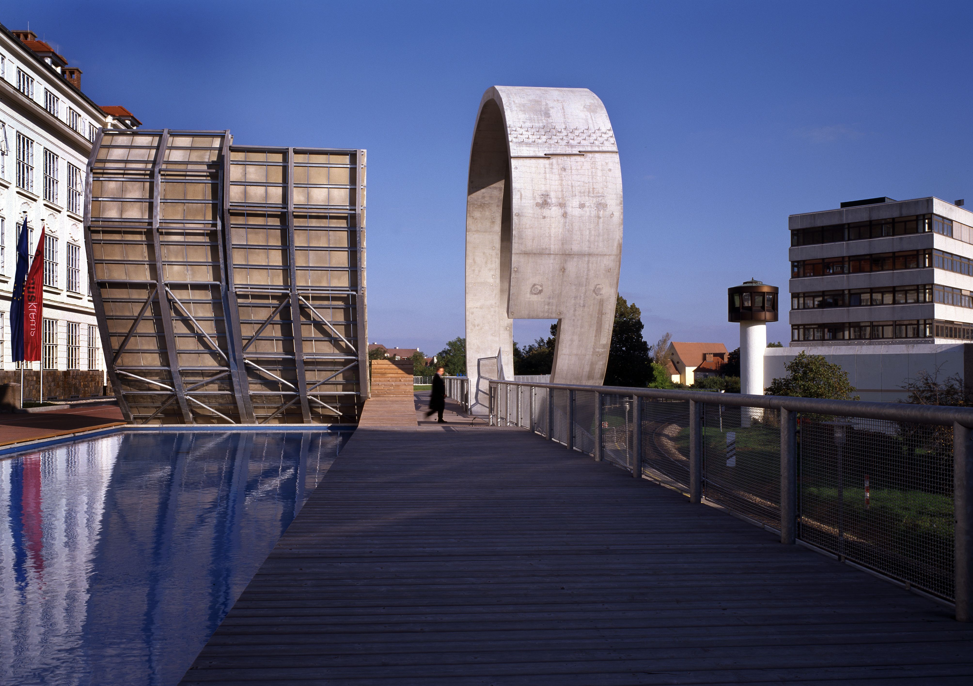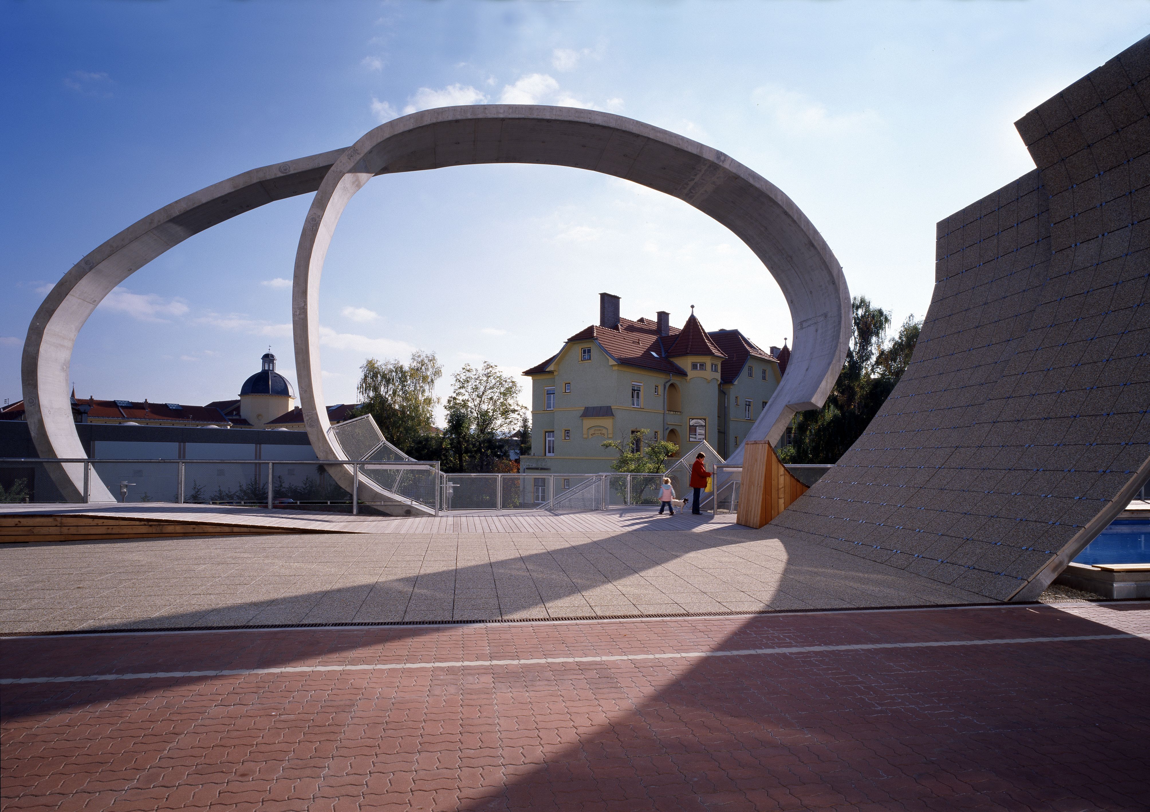 The brief was to create a representative entranceway for the original rear of the Donau Universität in Krems. In addition, propositions were to be made for a high quality design for the existing forecourt with recreational appeal for the students. The design by Peanutz Architekten takes up existing parallel routes, such as that of the railway tracks, the Antibas Promenade and the street Fabriksweg, and supplements these with additional zoning running parallel, such as emergency access, the footpath and the façade to the car park. Each of these 'bands', as they are called, receives its own surfacing rendering a range of different uses for the forecourt zone possible. With this band concept the jump in level between the train station and the forecourt is elegantly bridged by a loop. A staircase and a ramp have been worked into the inside of the concrete loop so pedestrians can overcome the change in levels. However the concrete band runs further, with a diameter of about 15 metres, the loop projects high up into the sky like a logo written into the air, one that is traversed on the way to the campus grounds. Alongside the loop is a pool of water, inviting studious minds to relax in their breaks and lie in the sun on the timber walkway.